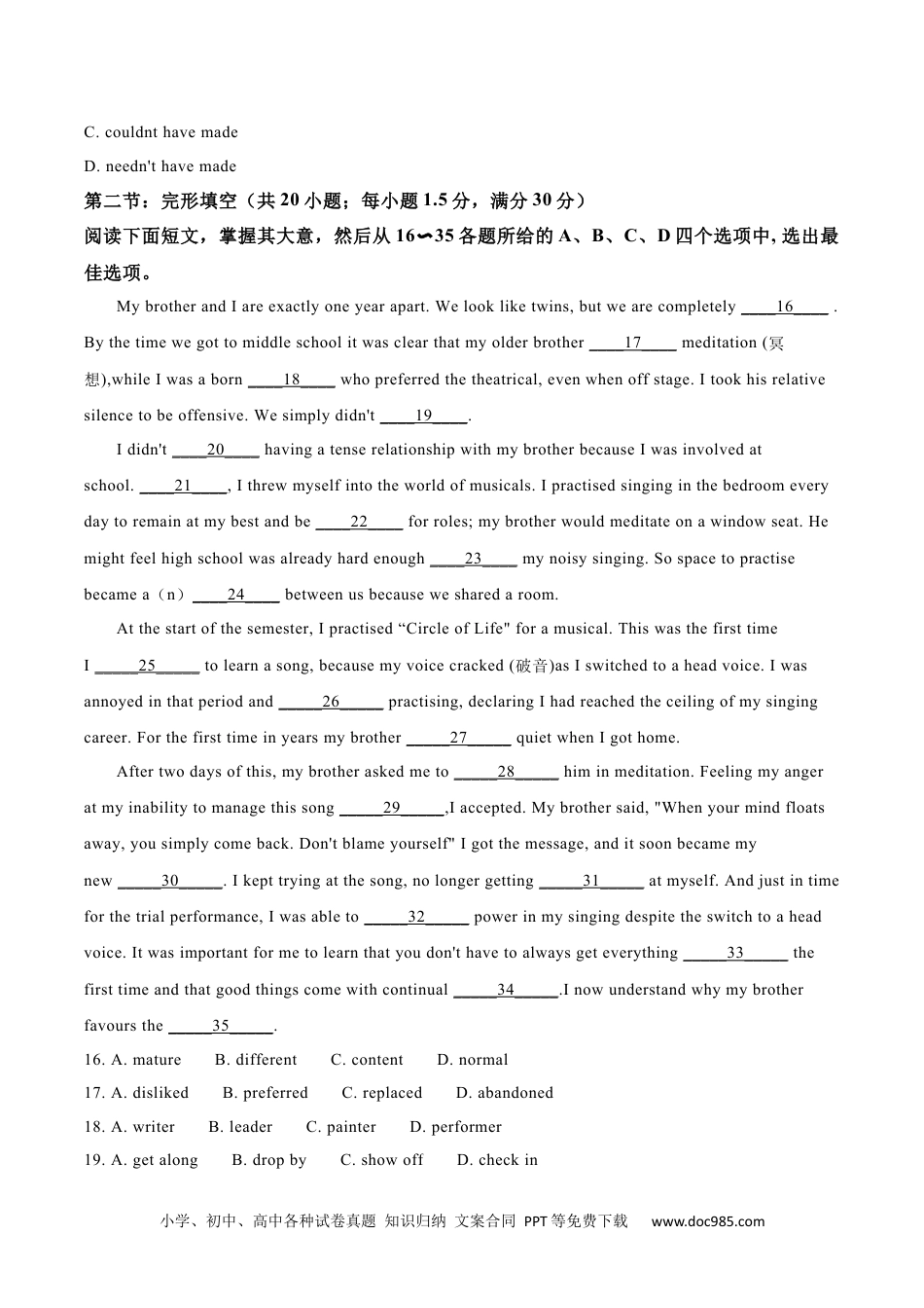 小学、初中、高中各种试卷真题知识归纳文案合同PPT等免费下载www.doc985.com2021年普通高等学校招生全国统一考试(天津卷)英语笔试(第二次)本试卷分为第I卷(选择题)和第II卷(非选择题)两部分,共130分,考试用时100分钟。第I卷2至11页,第II卷12至13页。注意事项:1.每小题选出答案后,用铅笔将答题卡上对应题目的答案标号涂黑。如需改动,用橡皮擦干净后,再选涂其他答案标号。2.本卷共55小题,共95分。第I卷第一部分:英语知识运用(共两节,满分45分)第一节:单项填空(共15小题;每小题1分,满分15分)从A、B、C、D四个选项中,选出可以填入空白处的最佳选项。1.—Iwastryingtoplaceanorderonyourwebsite,butIfailed.________.Icantakeyourorderoverthephone.A.That’sfineB.NowayC.MypleasureD.Ofcourse2.IwantedtomakedumplingsbutfoundIhad________flour,soIwentouttobuysome.A.madeupforB.runoutofC.keptawayfromD.gotdownto3.Feelingfearfulishealthy________ithelpsyouslowdownandevaluaterisksproperly.A.becauseB.untilC.beforeD.although4.Markisagenius.Bythetimehegraduated,he________jobsbyadozencomputercompanies.A.hasofferedB.hasbeenofferedC.hadofferedD.hadbeenoffered5.Thepolicesearchedtheareaforseveraldays.________,theyfoundthepieceofevidencetheywerelookingfor.A.GenerallyB.OriginallyC.EventuallyD.Unfortunately6.It’sagoodideatochoosea(n)________destinationincaseyourfirst-choicetouristspotisnotavailable.小学、初中、高中各种试卷真题知识归纳文案合同PPT等免费下载www.doc985.comA.annualB.exactC.alternativeD.pleasant7.Inthespring,aseason________weare1earningnewrhythmsoflife,manyofusfindcomfortinthenaturalworld.A.whenB.whereC.whatD.which8.NowadaysmanypeopletravelacrossChina________high-speedtrains.A.onbehalfofB.bymeansofC.atcostofD.intermsof9.Inthelab,keepingthingscleanandorganizedcanhelpprovideasafer________.A.systemB.methodC.investmentD.environment10.Goodevening,everybody.ProfessorKing________hislectureinamoment,butletmeintroducehimfirst.A.deliveredB.willbedeliveringC.wasdeliveringD.hasbeendelivering11ItseemedthatIhadbecome________myparentshadwantedmetobe.A.whenB.whereC.whatD.whether12.Itoldyou!Ireallyamrankedthelowest.Number25outof25players.________You'vegotnowheretogobutup.A.Tellmeabitmore.B.I'mnotsosureaboutthat.C.Lookonthebrightside!D.Thatisabsolutenonsense!13.Althoughafewhavecomeandgone,therestaurant'sregularcustomershave________thesamefornearly40years.A.stayedB.turnedC.grownD.got14.Marybecameabakeratage14,becausehergrandfatherpaidthelocalbaker________heralltheskills.A.tohavetaughtB.toteachC.teachingD.havingtaught15.---Ihonestlydon'tthinkI'mgoingtobeadmitted.---Wel1,youneverknow!You________abetterimpressionthanyouthink.A.mayhavemadeB.shouldhavemade小学、初中、高中各种试卷真题知识归纳文案合同PPT等免费下载www.doc985.comC.couldnthavemadeD.needn'thavemade第二节:完形填空(共20小题;每小题1.5分,满分30分)阅读下面短文,掌握其大意,然后从16〜35各题所给的A、B、C、D四个选项中,选出最佳选项。MybrotherandIareexactlyoneyearapart.Welookliketwins,butwearecompletely____16____.Bythetimewegottomiddleschoolitwasclearthatmyolderbrother____17____meditation(冥想),whileIwasaborn____18____whopreferredthetheatrical,evenwhenoffstage.Itookhisrelativesilencetobeoffensive.Wesimplydidn't____19____.Ididn't____20____havingatenserelationshipwithmybrotherbecauseIwasinvolvedatschool.____21____,Ithrewmyselfintotheworldofmusicals.Ipractisedsinginginthebedroomeverydaytoremainatmybestandbe____22____forroles;mybrotherwouldmeditateonawindowseat.Hemightfeelhighschoolw...