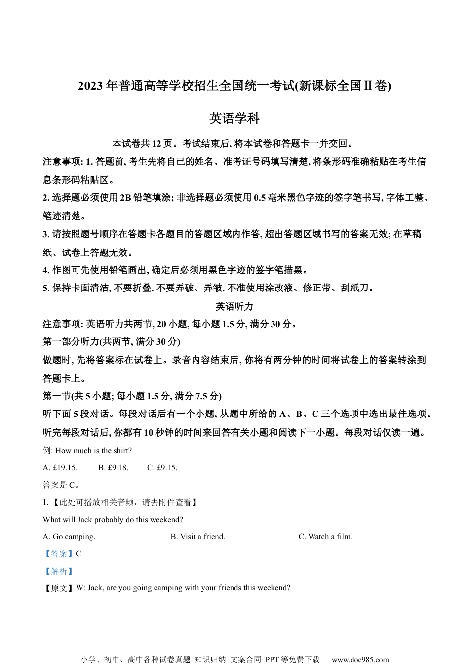 小学、初中、高中各种试卷真题知识归纳文案合同PPT等免费下载www.doc985.com2023年普通高等学校招生全国统一考试(新课标全国Ⅱ卷)英语学科本试卷共12页。考试结束后,将本试卷和答题卡一并交回。注意事项:1.答题前,考生先将自己的姓名、准考证号码填写清楚,将条形码准确粘贴在考生信息条形码粘贴区。2.选择题必须使用2B铅笔填涂;非选择题必须使用0.5毫米黑色字迹的签字笔书写,字体工整、笔迹清楚。3.请按照题号顺序在答题卡各题目的答题区域内作答,超出答题区域书写的答案无效;在草稿纸、试卷上答题无效。4.作图可先使用铅笔画出,确定后必须用黑色字迹的签字笔描黑。5.保持卡面清洁,不要折叠,不要弄破、弄皱,不准使用涂改液、修正带、刮纸刀。英语听力注意事项:英语听力共两节,20小题,每小题1.5分,满分30分。第一部分听力(共两节,满分30分)做题时,先将答案标在试卷上。录音内容结束后,你将有两分钟的时间将试卷上的答案转涂到答题卡上。第一节(共5小题;每小题1.5分,满分7.5分)听下面5段对话。每段对话后有一个小题,从题中所给的A、B、C三个选项中选出最佳选项。听完每段对话后,你都有10秒钟的时间来回答有关小题和阅读下一小题。每段对话仅读一遍。例:Howmuchistheshirt?A.£19.15.B.£9.18.C.£9.15.答案是C。1.【此处可播放相关音频,请去附件查看】WhatwillJackprobablydothisweekend?A.Gocamping.B.Visitafriend.C.Watchafilm.【答案】C【解析】【原文】W:Jack,areyougoingcampingwithyourfriendsthisweekend?小学、初中、高中各种试卷真题知识归纳文案合同PPT等免费下载www.doc985.comM:Itdepends.Ifit’ssunny,we’llgo.W:Theweathermansaysit’sgoingtorain.M:Inthatcase,we’llgotothecinemainstead.2.【此处可播放相关音频,请去附件查看】Whatdoesthewomanaskthemantodo?A.Takecareofherbags.B.Packthefoodforher.C.Checkthetrainschedule.【答案】A【解析】【原文】W:Excuseme,couldyoumindmybagsforamoment?Iwanttobuysomefoodattheconveniencestore.M:Noproblem.Butbequick.Itwasannouncedthatmytrainwouldarrivein10minutes.3.【此处可播放相关音频,请去附件查看】WhenwillthemanseeBob?A.ThisFriday.B.ThisSaturday.C.NextMonday.【答案】B【解析】【原文】W:BobcameoutofhospitallastFriday.Haveyougotachancetovisithim?M:IplantoseehimthisSaturday.W:Aren’tyougoingtotheconferencethen?M:No.IthasbeenrescheduledfornextMonday.4.【此处可播放相关音频,请去附件查看】Whydoesthemanapologize?A.Fortheterriblefood.B.Fortheovercharge.C.Forthewaiter’srudeness.【答案】B【解析】【原文】M:Sorry,Miss.Wemadeaterriblemistakeaddingupthebill.Hereisthetendollarswehavetoreturntoyou.W:Oh,Ididn’tnoticethat.It’sOK.Don’tblamethewaiter.He’sbeenreallynice.5.【此处可播放相关音频,请去附件查看】Whatarethespeakerstalkingabout?小学、初中、高中各种试卷真题知识归纳文案合同PPT等免费下载www.doc985.comA.Writingabook.B.Holdingacelebration.C.Buyingapresent.【答案】C【解析】【原文】W:DoyouthinkweshouldgetSteveabookforthenewyear?M:Booksaregood.ButStevewouldn’ttakejustanybook.Hehashadthisparticularoneongeography.第二节(共15小题;每小题1.5分,满分22.5分)听下面5段对话或独白。每段对话或独白后有几个小题,从题中所给的A、B、C三个选项中选出最佳选项。听每段对话或独白前,你将有时间阅读各个小题,每小题5秒钟;听完后,各小题将给出5秒钟的作答时间。每段对话或独白读两遍。听下面一段较长对话,回答以下小题。【此处可播放相关音频,请去附件查看】6.WhydoesSaramakethephonecall?A.Toaskforadvice.B.Toarrangeanouting.C.Tocancelanappointment.7.WhatdoesDavidwanttodo?A.Gotoadinnerparty.B.TalktoSarainperson.C.Workonthenewcase.【答案】6.C7.B【解析】【原文】M:Hello,Sara.W:Hello,David.Ican’tcomefordinnertonight.Sorry.M:Oh,whathappened?W:We’vegotanewcaseandthingsgetprettycrazyhereintheoffice.M:Well,thenI...