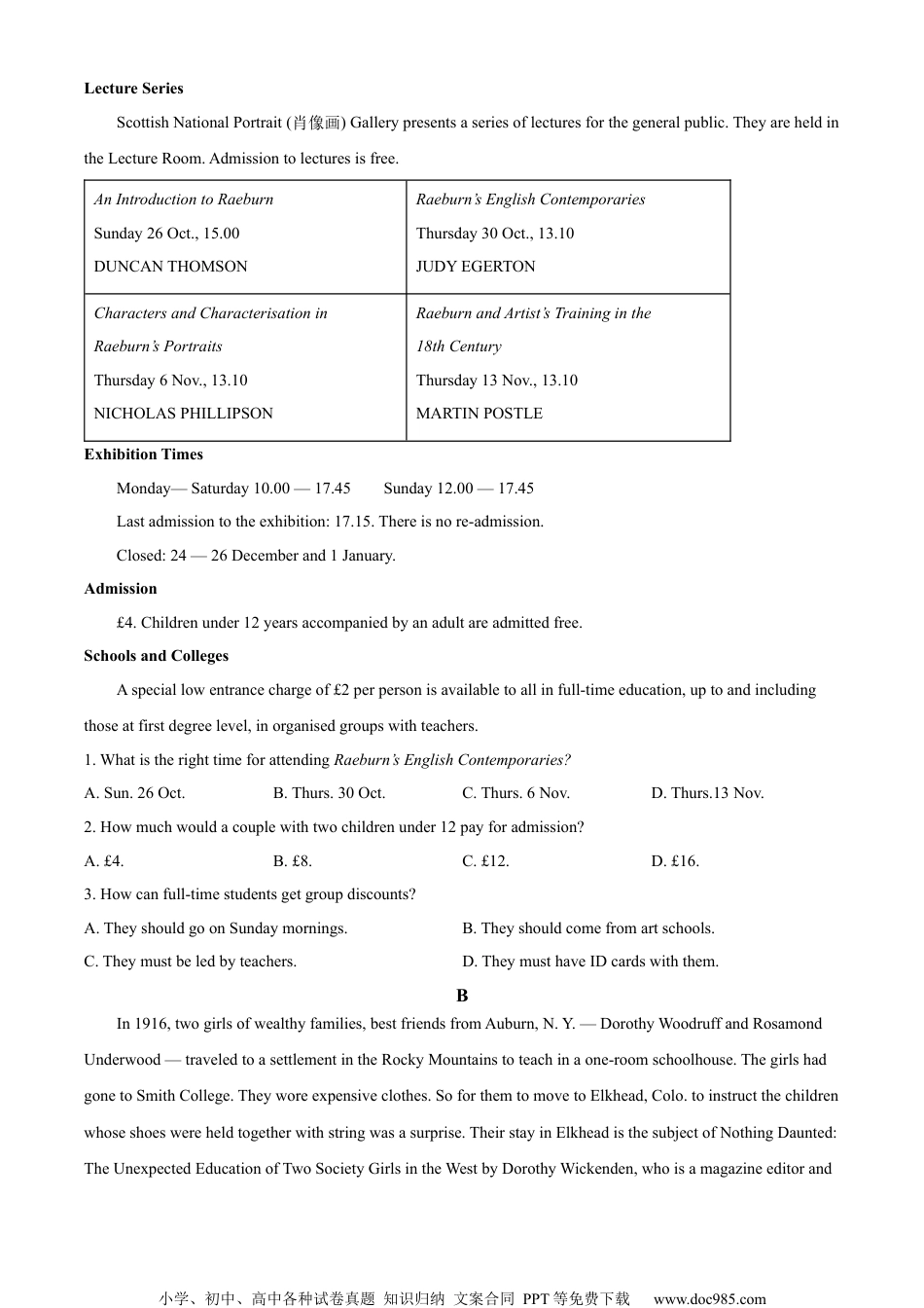 小学、初中、高中各种试卷真题知识归纳文案合同PPT等免费下载www.doc985.com2022年普通高等学校招生全国统一考试英语注意事项:1.答卷前,考生务必将自己的姓名、准考证号填写在答题卡上。2.回答选择题时,选出每小题答案后,用铅笔把答题卡上对应题目的答案标号涂黑。如需改动,用橡皮擦干净后,再选涂其他答案标号。回答非选择题时,将答案写在答题卡上,写在本试卷上无效。3.考试结束后,将本试卷和答题卡一并交回。第一部分听力(共两节,满分30分)做题时,先将答案标在试卷上。录音内容结束后,你将有两分钟的时间将试卷上的答案转涂到答题卡上。第一节(共5小题;每小题1.5分,满分7.5分)听下面5段对话。每段对话后有一个小题,从题中所给的A、B、C三个选项中选出最佳选项。听完每段对话后,你都有10秒钟的时间来回答有关小题和阅读下一小题。每段对话仅读一遍。例:Howmuchistheshirt?A.£19.15.B.£9.18.C.£9.15.答案是C。1.Whatdoesthemanwanttodo?A.Havebreakfast.B.Takeawalk.C.Callhisoffice.2.WhatwasGeorgedoinglastnight?A.Havingameeting.B.Flyinghome.C.Workingonaproject.3.Whydoesthemansuggestgoingtothepark?A.It’sbig.B.It’squiet.C.It’snew.4.Howdoesthewomansound?A.Annoyed.B.Pleased.C.Puzzled.5.Whereistheman’stable?A.Nearthedoor.B.Bythewindow.C.Inthecorner.第二节(共15小题;每小题1.5分,满分22.5分)听下面5段对话或独白。每段对话或独白后有几个小题,从题中所给的A、B、C三个选项中选出最佳选项。听每段对话或独白前,你将有时间阅读各个小题,每小题5秒钟;听完后,各小题将给出5秒钟的作答时间。每段对话或独白读两遍。听第6段材料,回答第6、7题。6.Whatarethespeakersgoingtodotonight?A.Eatout.B.Goshopping.C.Dosports.7.Whatistheprobablerelationshipbetweenthespeakers?A.Bossandsecretary.B.Hostessandguest.C.Husbandandwife.听第7段材料,回答第8、9题。8.WhydoesthewomanthinkJulyisthebesttimetomove?小学、初中、高中各种试卷真题知识归纳文案合同PPT等免费下载www.doc985.comA.Theirbusinessisslow.B.Theweatherisfavorable.C.It’seasytohirepeople.9.Howwilltheyhandlethemoving?A.Finishitallatonce.B.Havethesalessectiongofirst.C.Doonedepartmentatatime.听第8段材料,回答第10至12题。10.WhatdidPeterlearnfromhisgrandfather?A.Howtoappreciateartworks.B.Howtodealwithartists.C.Howtorunamuseum.11.WhatdidPeterdoinChicago?A.Hestudiedatacollege.B.Heservedinthearmy.C.Heworkedinagallery.12.WhoseworksdidPeterlikebest?A.Rembrandt’s.B.Botticelli’s.C.Rubens’.听第9段材料,回答第13至16题。13.Wheredoestheconversationtakeplace?A.Atalibrary.B.Inalawfirm.C.Onatrain.14.BywhattimedidJohnplantofinishhistermpaper?A.March.B.August.C.October.15.WhydidJohnquithispart-timejob?A.Hehadtocatchupwithhisstudy.B.Hewasofferedabetterone.C.Hegottiredofit.16.WhatisSusan’sattitudetoJohn’sproblem?A.Carefree.B.Understanding.C.Forgiving.听第10段材料,回答第17至20题。17.Whatdidthespeakerdobeforetheyear2012?A.Afitnesscoach.B.Achessplayer.C.Amarathonrunner.18.Whywasthe2016Olympicsimportantforthespeaker?A.HewasmotivatedbyBolt.B.Hebrokeaworldrecord.C.Hewonfifthplace.19.Whichisthehardestforthespeaker?A.Gettingoveraninjury.B.Doingstrengthtraining.C.RepresentingBotswana.20.Whatisthespeakermainlytalkingabout?A.Hisplantogoforthegold.B.Hisexperienceonthetrack.C.Hisloveforhishomecountry.第二部分阅读理解(共两节,满分40分)第一节(共15小题;每小题2分,满分30分)阅读下列短文,从每题所给的A、B、C和D四个选项中,选出最佳选项。AHenryRaeburn(1756-1823)TheExhibitionThisexhibitionofsomesixtymasterpiecescelebratingthelifeandworkofScotland’sbestlovedpainter,SirHenryRaeburn,comestoLondon.Selectedfromcollectionsthroughouttheworld,itisthefirstmajore...
