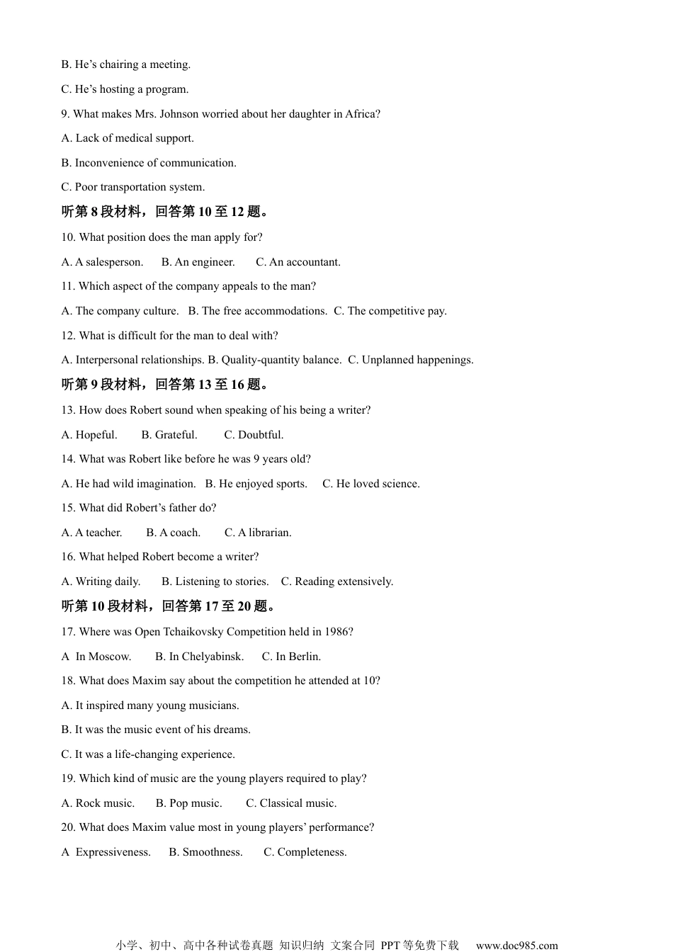 小学、初中、高中各种试卷真题知识归纳文案合同PPT等免费下载www.doc985.com2023年普通高等学校招生全国统一考试(全国甲卷)英语学科第一部分听力(共两节,满分30分)做题时,先将答案标在试卷上。录音内容结束后,你将有两分钟的时间将试卷上的答案转涂到答题卡上。第一节(共5小题;每小题1.5分,满分1.5分)听下面5段对话。每段对话后有一个小题,从题中所给的A、B、C三个选项中选出最佳选项。听完每段对话后,你都有10秒钟的时间来回答有关小题和阅读下一小题。每段对话仅读一遍。1.Wheredoestheconversationprobablytakeplace?A.Inthebookstore.B.Intheregisteroffice.C.Inthedormbuilding.2.Whatistheweatherlikenow?A.Sunny.B.Cloudy.C.Rainy.3.Whatdoesthemanwanttodoontheweekend?A.Dosomegardening.B.Haveabarbecue.C.Gofishing.4.Whatarethespeakerstalkingabout?A.Anewoffice.B.Achangeoftheirjobs.C.Aformercolleague.5.WhatdoweknowaboutAndrew?A.He’soptimistic.B.He’sactive.C.He’sshy.第二节(共15小题;每小题1.5分,满分22.5分)听下面5段对话或独白。每段对话或独白后有几个小题,从题中所给的A、B、C三个选项中选出最佳选项。听每段对话或独白前,你将有时间阅读各个小题,每小题5秒钟;听完后,各小题将给出5秒钟的作答时间,每段对话或独白读两遍。听第6段材料,回答第6、7题。6.Whichofthefollowingdoesthewomandislike?A.Thebedroom.B.Thesittingroom.C.Thekitchen.7.Whatdoesthewomansuggesttheydonext?A.Gotoanotheragency.B.Seesomeotherflats.C.Visittheneighbours.听第7段材料,回答第8、9题。8.Whatisthemandoing?A.He’smakingaphonecall.小学、初中、高中各种试卷真题知识归纳文案合同PPT等免费下载www.doc985.comB.He’schairingameeting.C.He’shostingaprogram.9.WhatmakesMrs.JohnsonworriedaboutherdaughterinAfrica?A.Lackofmedicalsupport.B.Inconvenienceofcommunication.C.Poortransportationsystem.听第8段材料,回答第10至12题。10.Whatpositiondoesthemanapplyfor?A.Asalesperson.B.Anengineer.C.Anaccountant.11.Whichaspectofthecompanyappealstotheman?A.Thecompanyculture.B.Thefreeaccommodations.C.Thecompetitivepay.12.Whatisdifficultforthemantodealwith?A.Interpersonalrelationships.B.Quality-quantitybalance.C.Unplannedhappenings.听第9段材料,回答第13至16题。13.HowdoesRobertsoundwhenspeakingofhisbeingawriter?A.Hopeful.B.Grateful.C.Doubtful.14.WhatwasRobertlikebeforehewas9yearsold?A.Hehadwildimagination.B.Heenjoyedsports.C.Helovedscience.15.WhatdidRobert’sfatherdo?A.Ateacher.B.Acoach.C.Alibrarian.16.WhathelpedRobertbecomeawriter?A.Writingdaily.B.Listeningtostories.C.Readingextensively.听第10段材料,回答第17至20题。17.WherewasOpenTchaikovskyCompetitionheldin1986?A.InMoscow.B.InChelyabinsk.C.InBerlin.18.WhatdoesMaximsayaboutthecompetitionheattendedat10?A.Itinspiredmanyyoungmusicians.B.Itwasthemusiceventofhisdreams.C.Itwasalife-changingexperience.19.Whichkindofmusicaretheyoungplayersrequiredtoplay?A.Rockmusic.B.Popmusic.C.Classicalmusic.20.WhatdoesMaximvaluemostinyoungplayers’performance?A.Expressiveness.B.Smoothness.C.Completeness.小学、初中、高中各种试卷真题知识归纳文案合同PPT等免费下载www.doc985.com第二部分阅读理解(共两节,满分40分)第一节(共15小题:每小题2分,满分30分)阅读下列短文,从每题所给的A、B、C和D四个选项中,选出最佳选项。AWheretoEatinBangkokBangkokisahighlydesirabledestinationforfoodlovers.Ithasaseeminglybottomlesswellofdiningoptions.HerearesomesuggestionsonwheretostartyourBangkokeatingadventure.NahmOfferingThaifinedining.NahmprovidesthebestofBangkokculinary(烹饪的)experiences.It’stheonlyThairestaurantthatranksamongthetop10oftheword’s50bestrestaurantslist.HeadChefDavidThompson,whore...