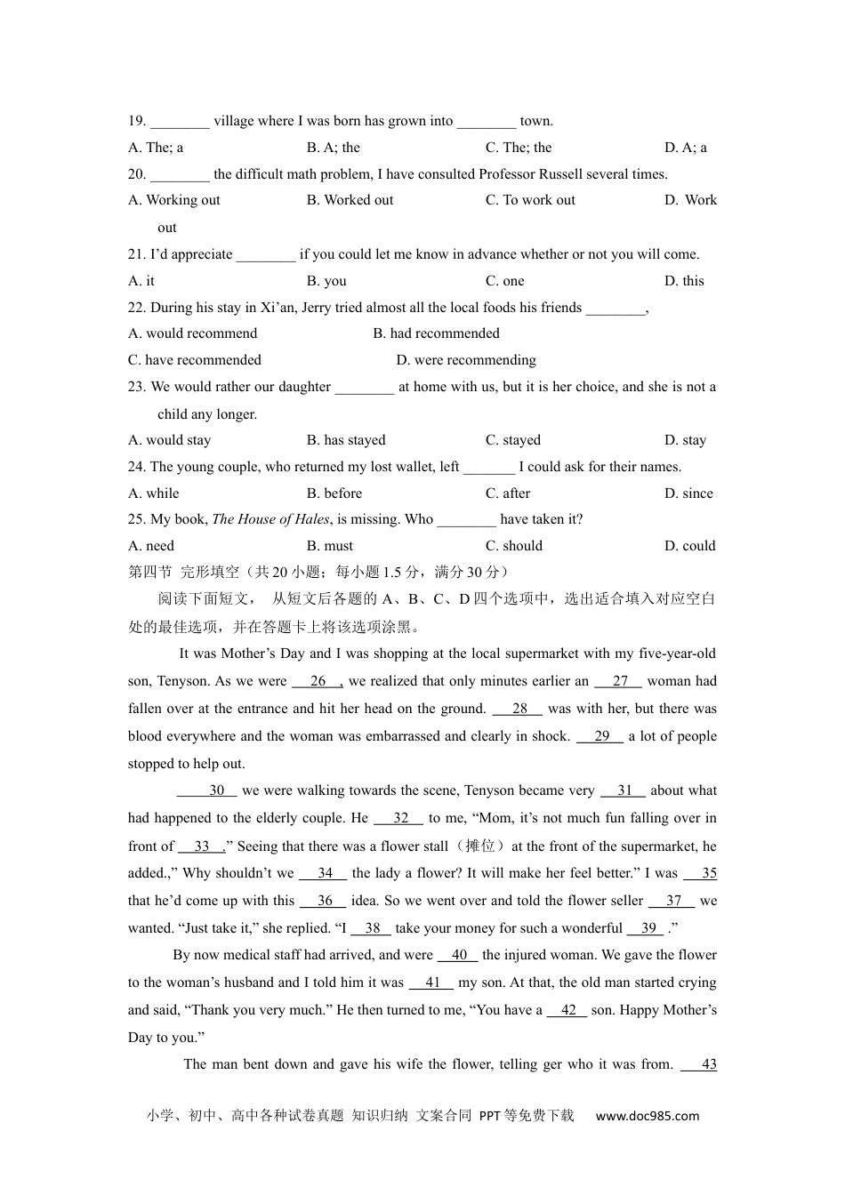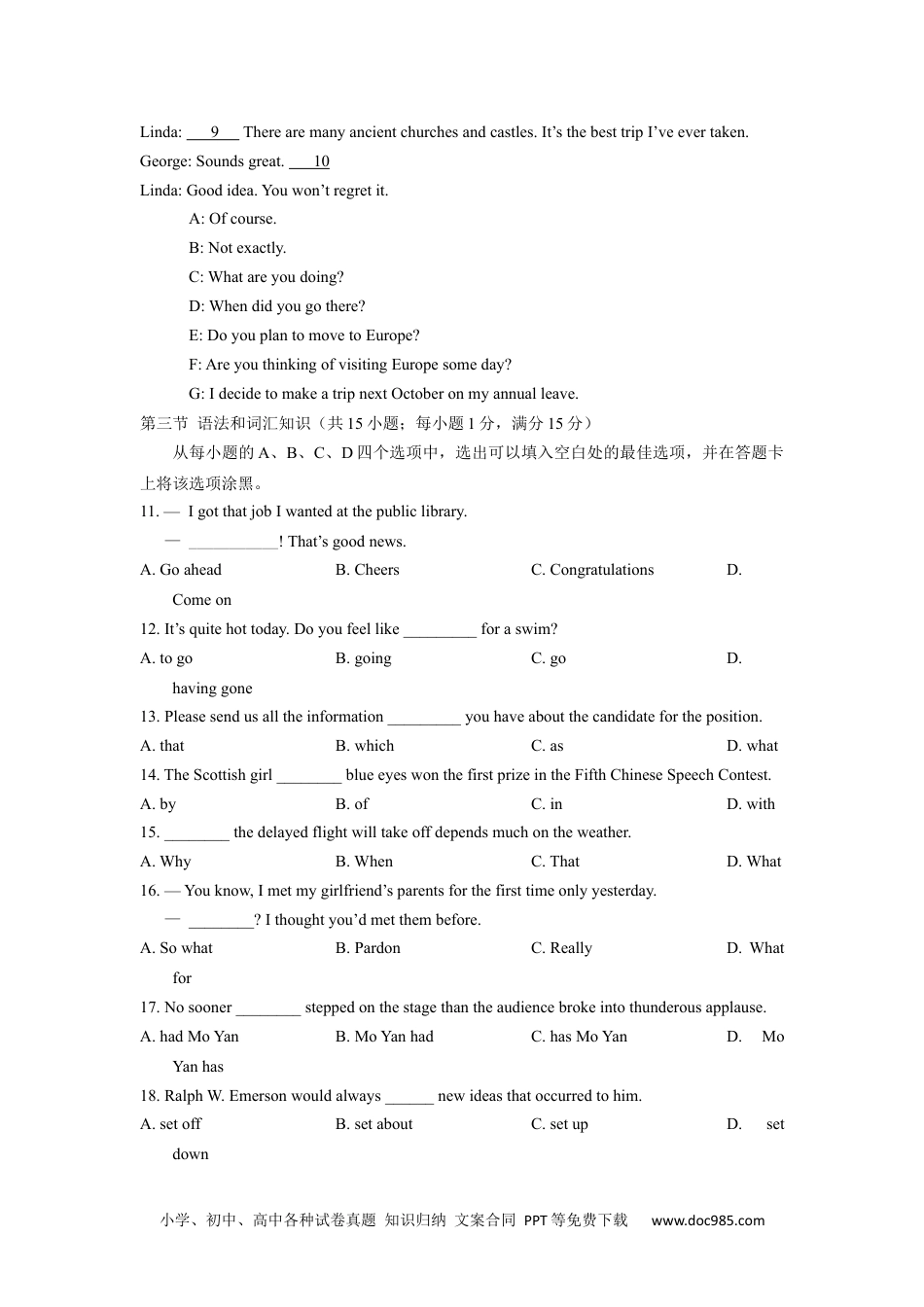 小学、初中、高中各种试卷真题知识归纳文案合同PPT等免费下载www.doc985.com2014年普通高等学校招生全国统一考试(陕西卷)英语试题第一部分:英语知识运用(共四节,满分55分)第一节语音知识(共5小题;每小题1分,满分5分)从每小题的A、B、C、D四个选项中,找出其划线部分与所给单词的划线部分读音相同的选项,并在答题卡上将该选项涂黑。1.openA.becomeB.acrossC.lonelyD.balcony2.teacherA.greatB.heavyC.ideaD.disease3.physicsA.pleasureB.musicC.sureD.increase4.weatherA.warmthB.methodC.theoryD.breathe5.brownA.howeverB.sorrowC.knowledgeD.owner第二节情景对话(共5小题;每小题1分,满分5分)根据对话情境和内容,从对话后所给的选项中选出能填入每一空白处的最佳选项,并在答题卡上将该选项涂黑。选项中有两个为多余选项。Linda:Hello,George.6George:Hi,Linda.I’mreadingatouristguidetoEurope.Linda:7George:Yes,i’mlookingtosuchatrip.Hey,haveyoueverbeenthere?Linda:Yes.I’veactuallyvisitedmycountriesinEurope;France,Germany,ItalyandAustria,forexample.George:8Andhowlongdidyoustay?Linda:Twoyearsago.Foroveronemonth.George:Didyoulikeit?小学、初中、高中各种试卷真题知识归纳文案合同PPT等免费下载www.doc985.comLinda:9Therearemanyancientchurchesandcastles.It’sthebesttripI’veevertaken.George:Soundsgreat.10Linda:Goodidea.Youwon’tregretit.A:Ofcourse.B:Notexactly.C:Whatareyoudoing?D:Whendidyougothere?E:DoyouplantomovetoEurope?F:AreyouthinkingofvisitingEuropesomeday?G:IdecidetomakeatripnextOctoberonmyannualleave.第三节语法和词汇知识(共15小题;每小题1分,满分15分)从每小题的A、B、C、D四个选项中,选出可以填入空白处的最佳选项,并在答题卡上将该选项涂黑。11.—IgotthatjobIwantedatthepubliclibrary.—___________!That’sgoodnews.A.GoaheadB.CheersC.CongratulationsD.Comeon12.It’squitehottoday.Doyoufeellike_________foraswim?A.togoB.goingC.goD.havinggone13.Pleasesendusalltheinformation_________youhaveaboutthecandidatefortheposition.A.thatB.whichC.asD.what14.TheScottishgirl________blueeyeswonthefirstprizeintheFifthChineseSpeechContest.A.byB.ofC.inD.with15.________thedelayedflightwilltakeoffdependsmuchontheweather.A.WhyB.WhenC.ThatD.What16.—Youknow,Imetmygirlfriend’sparentsforthefirsttimeonlyyesterday.—________?Ithoughtyou’dmetthembefore.A.SowhatB.PardonC.ReallyD.Whatfor17.Nosooner________steppedonthestagethantheaudiencebrokeintothunderousapplause.A.hadMoYanB.MoYanhadC.hasMoYanD.MoYanhas18.RalphW.Emersonwouldalways______newideasthatoccurredtohim.A.setoffB.setaboutC.setupD.setdown小学、初中、高中各种试卷真题知识归纳文案合同PPT等免费下载www.doc985.com19.________villagewhereIwasbornhasgrowninto________town.A.The;aB.A;theC.The;theD.A;a20.________thedifficultmathproblem,IhaveconsultedProfessorRussellseveraltimes.A.WorkingoutB.WorkedoutC.ToworkoutD.Workout21.I’dappreciate________ifyoucouldletmeknowinadvancewhetherornotyouwillcome.A.itB.youC.oneD.this22.DuringhisstayinXi’an,Jerrytriedalmostallthelocalfoodshisfriends________,A.wouldrecommendB.hadrecommendedC.haverecommendedD.wererecommending23.Wewouldratherourdaughter________athomewithus,butitisherchoice,andsheisnotachildanylonger.A.wouldstayB.hasstayedC.stayedD.stay24.Theyoungcouple,whoreturnedmylostwallet,left_______Icouldaskfortheirnames.A.whileB.beforeC.afterD.since25.Mybook,TheHouseofHales,ismissing.Who________havetakenit?A.needB.mustC.shouldD.could第四节完形填空(共20小题;每小题1.5分,满分30分)阅读下面短文,从短文后各题的A、B、C、D四个选项中,选出适合填入对应空白处的最佳选项,并在答题卡...
