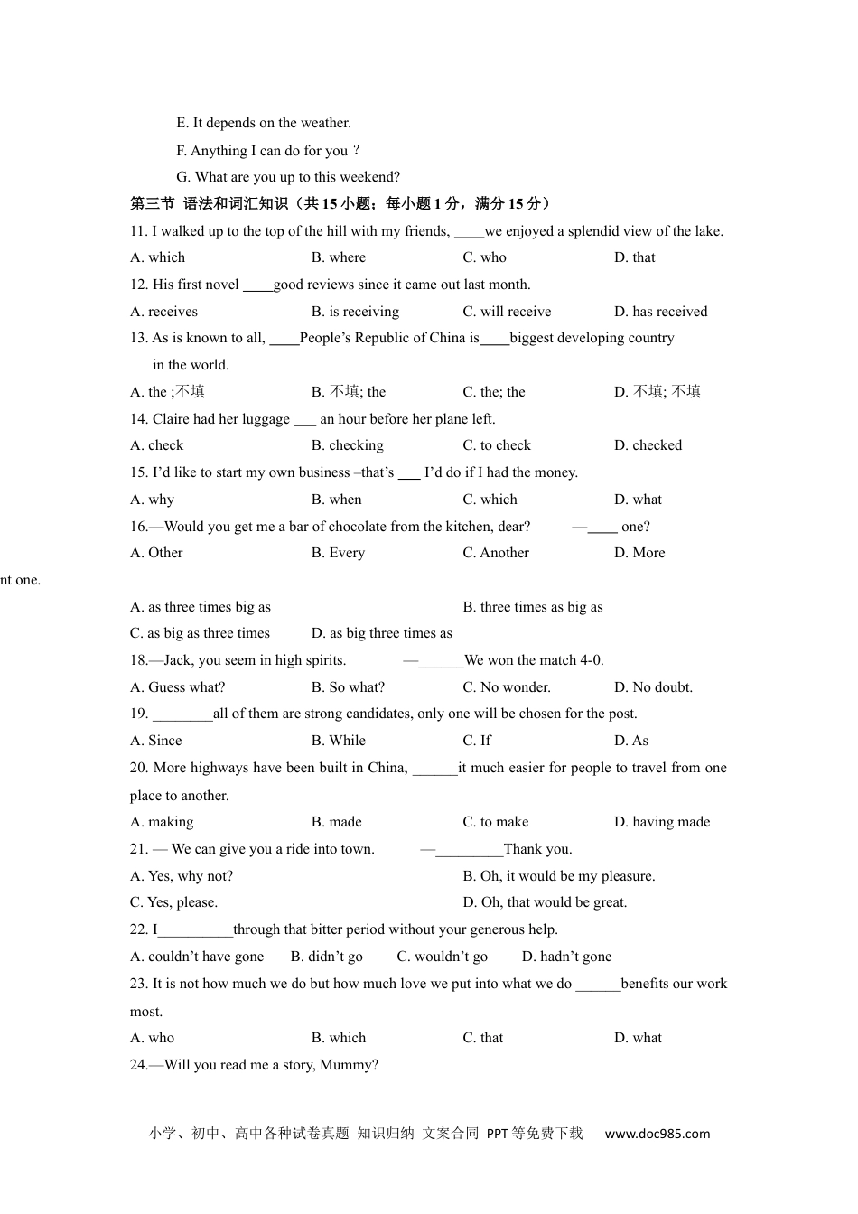 小学、初中、高中各种试卷真题知识归纳文案合同PPT等免费下载www.doc985.com2011年普通高等学校招生全国统一考试(陕西卷)英语试题第一部分:英语知识运用(共四节,满分55分)第一节语音知识(共5小题;每小题1分,满分5分)1.againA.cabbageB.narrowC.famousD.tradition2.customA.measureB.upstairsC.respectD.sugar3.twiceA.machineB.inviteC.terribleD.bitter4.doubtA.amountB.troubleC.shoulderD.group5.northA.thunderB.worthyC.neitherD.clothes第二节情景对话(共5小题:每小题1分,满分5分)Tom:Hi,Cathy.6Cathy:IhavetofinishmyprojectonthehistoryoftheInternet.Whataboutyou?Tom:7Ifit’sfine,we’llgocamping.Wouldyouliketojoinus?Cathy:I’dliketo,butthedeadlineformyprojectisnextMonday.Tom:Whatapity!8Cathy:Yes,please.Canyousuggestanygoodreferencebooks?Tom:YoumaywanttoreadOriginsoftheInternetandTheDigitalFuture.Cathy:I’mreadingthetwobooks.9Tom:GototheScienceMuseumwebsite,andyou’llfindlotsofup-to-dateinformation.Cathy:Goodidea.Thanksforyourhelp.Tom:10A.Nevermind.B.Don’tmentionit.C.Anyothersuggestions?D.Willyoucomenexttime?小学、初中、高中各种试卷真题知识归纳文案合同PPT等免费下载www.doc985.comE.Itdependsontheweather.F.AnythingIcandoforyou?G.Whatareyouuptothisweekend?第三节语法和词汇知识(共15小题;每小题1分,满分15分)11.Iwalkeduptothetopofthehillwithmyfriends,weenjoyedasplendidviewofthelake.A.whichB.whereC.whoD.that12.Hisfirstnovelgoodreviewssinceitcameoutlastmonth.A.receivesB.isreceivingC.willreceiveD.hasreceived13.Asisknowntoall,People’sRepublicofChinaisbiggestdevelopingcountryintheworld.A.the;不填B.不填;theC.the;theD.不填;不填14.Clairehadherluggageanhourbeforeherplaneleft.A.checkB.checkingC.tocheckD.checked15.I’dliketostartmyownbusiness–that’sI’ddoifIhadthemoney.A.whyB.whenC.whichD.what16.—Wouldyougetmeabarofchocolatefromthekitchen,dear?—one?A.OtherB.EveryC.AnotherD.Morentone.A.asthreetimesbigasB.threetimesasbigasC.asbigasthreetimesD.asbigthreetimesas18.—Jack,youseeminhighspirits.—______Wewonthematch4-0.A.Guesswhat?B.Sowhat?C.Nowonder.D.Nodoubt.19.________allofthemarestrongcandidates,onlyonewillbechosenforthepost.A.SinceB.WhileC.IfD.As20.MorehighwayshavebeenbuiltinChina,______itmucheasierforpeopletotravelfromoneplacetoanother.A.makingB.madeC.tomakeD.havingmade21.—Wecangiveyouarideintotown.—_________Thankyou.A.Yes,whynot?B.Oh,itwouldbemypleasure.C.Yes,please.D.Oh,thatwouldbegreat.22.I__________throughthatbitterperiodwithoutyourgeneroushelp.A.couldn’thavegoneB.didn’tgoC.wouldn’tgoD.hadn’tgone23.Itisnothowmuchwedobuthowmuchloveweputintowhatwedo______benefitsourworkmost.A.whoB.whichC.thatD.what24.—Willyoureadmeastory,Mummy?小学、初中、高中各种试卷真题知识归纳文案合同PPT等免费下载www.doc985.com—OK.You________haveoneifyougotobedassoonaspossible.A.mightB.mustC.couldD.shall25.Someinsects________thecoloroftheirsurroundingstoprotectthemselves.A.takeinB.takeoffC.takeonD.takeout第四节完形填空(共20小题:每小题1.5分,满分30分)Inalandfaraway,onceuponatimetherewasgreatpoverty(贫困),andonlytherichcouldmanagewithoutgreat_26_.Threeofthoserichmenandtheirservantswere_27_togetheronaroadwhentheycametoavery_28_village.Thefirstcouldnotstandseeingthepoverty,_29hetookallthegoldandjewelsfromhiswagons(四轮载重马车)andshared_30outamongthevillagers.Hewishedthemallthebestofluck,andheleft.Thesecondrichman,seeingthe_31situation,stoppedforashorttimeandgave_32allhisfoodanddrink,sincehe_33seethatmoneywouldbeoflittle_3...