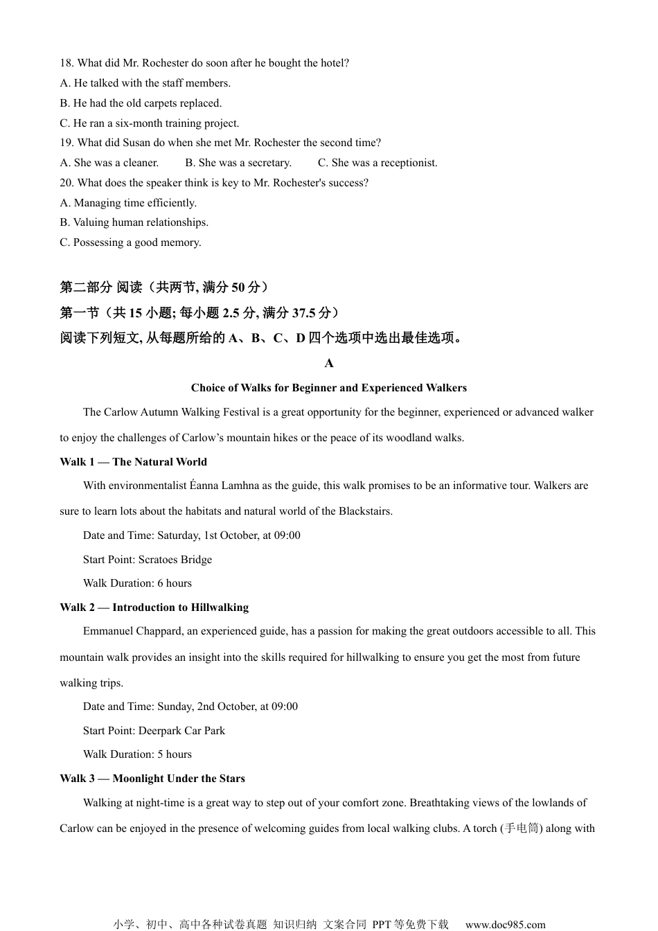 小学、初中、高中各种试卷真题知识归纳文案合同PPT等免费下载www.doc985.com绝密★启用前2024年普通高等学校招生全国统一考试英语本试卷共12页。考试结束后,将本试卷和答题卡一并交回。注意事项:1.答题前,考生先将自己的姓名、准考证号码填写清楚,将条形码准确粘贴在考生信息条形码粘贴区。2.选择题必须使用2B铅笔填涂;非选择题必须使用0.5毫米黑色字迹的签字笔书写,字体工整、笔迹清楚。3.请按照题号顺序在答题卡各题目的答题区域内作答,超出答题区域书写的答案无效;在草稿纸、试卷上答题无效。4.作图可先使用铅笔画出,确定后必须用黑色字迹的签字笔描黑。5.保持卡面清洁,不要折叠,不要弄破、弄皱,不准使用涂改液、修正带、刮纸刀。第一部分听力(1—20小题)在笔试结束后进行。英语听力注意事项:英语听力共两节,20小题,每小题1.5分,满分30分。第一部分听力(共两节,满分30分)做题时,先将答案标在试卷上。录音内容结束后,你将有两分钟的时间将试卷上的答案转涂到答题卡上。第一节(共5小题;每小题1.5分,满分7.5分)听下面5段对话。每段对话后有一个小题,从题中所给的A、B、C三个选项中选出最佳选项。听完每段对话后,你都有10秒钟的时间来回答有关小题和阅读下一小题。每段对话仅读一遍。例:Howmuchistheshirt?A.£19.15.B.£9.18.C.£9.15.答案是C。1.Whatdidthewomandoyesterdayevening?A.ShewatchedTV.B.Shewentshopping.C.Sheattendedashow.2.Whatistheman'ssuggestion?A.Takingarest.B.Goingforacoffee.C.Havingasnack.3.Whatarethespeakersmainlytalkingabout?A.Aweekendplan.B.Aweddinginvitation.C.Abusinessdeal.4.WhereisBarbaragoingtonight?A.Toagym.B.Tohergrandma's.C.Tothedoctor's.小学、初中、高中各种试卷真题知识归纳文案合同PPT等免费下载www.doc985.com5.WhatisAlexdoing?A.He'shavingbreakfast.B.He'sfeedingacat.C.He'sreadingabook.第二节(共15小题;每小题1.5分,满分22.5分)听下面5段对话或独白。每段对话或独白后有几个小题,从题中所给的A、B、C三个选项中选出最佳选项。听每段对话或独白前,你将有时间阅读各个小题,每小题5秒钟:听完后,各小题将给出5秒钟的作答时间。每段对话或独白读两遍。听第6段材料,回答第6、7题。6.Wheredoestheconversationprobablytakeplace?A.Inafitnesscenter.B.Inasportsshop.C.Inaclinic.7.Whatdoesthemanadvisethewomantodo?A.Buyhigh-qualitysportswear.B.Keepworkingoutregularly.C.Avoidover-exercising.听第7段材料,回答第8至10题。8.Whydoesthemanmakethecall?A.Toreserveatable.B.Toaskaboutaparty.C.Topostponeameeting.9.WhattimeshouldthemanarriveonFridayevening?A.At5:30.B.At6:30.C.At8:00.10.Whatistheman'sname?A.Brown.B.Anderson.C.Howard.听第8段材料,回答第11至13题。11.WhydoesSarahcometotalktoJacob?A.Tomakeanappointment.B.Toseekhisadvice.C.Toexplainadecision.12.HowmanypeoplearethereinSarah'sgroup?A.Three.B.Four.C.Five.13.Whatistherelationshipbetweenthespeakers?A.Classmates.B.Fellowworkers.C.Teacherandstudent.听第9段材料,回答第14至16题。14.Howoftendoesthebandcometoperforminthepark?A.Threetimesayear.B.Onceayear.C.Everyotheryear.15.Whatkindofmusicwillbeplayedthisevening?A.Countrymusic.B.Jazz.C.Rockandroll.16.WhatwillJanniedonext?A.Catchabus.B.Listentoalecture.C.Gotothelibrary.听第10段材料,回答第17至20题。17.Whydidthespeakergotothehotel?A.Todeliveraspeech.B.Toarrangeaconference.C.TointerviewMr.Rochester.小学、初中、高中各种试卷真题知识归纳文案合同PPT等免费下载www.doc985.com18.WhatdidMr.Rochesterdosoonafterheboughtthehotel?A.Hetalkedwiththestaffmembers.B.Hehadtheoldcarpetsreplaced.C.Heranasix-monthtrainingproject.19.WhatdidSusandowhenshemetMr.Rochesterthesecondtime?A.Shewasacleaner.B.Shewasasecretary.C.Shewasareceptionist.20.WhatdoesthespeakerthinkiskeytoMr.Rochester'ssuccess?A.Managingtimeefficiently.B.V...
