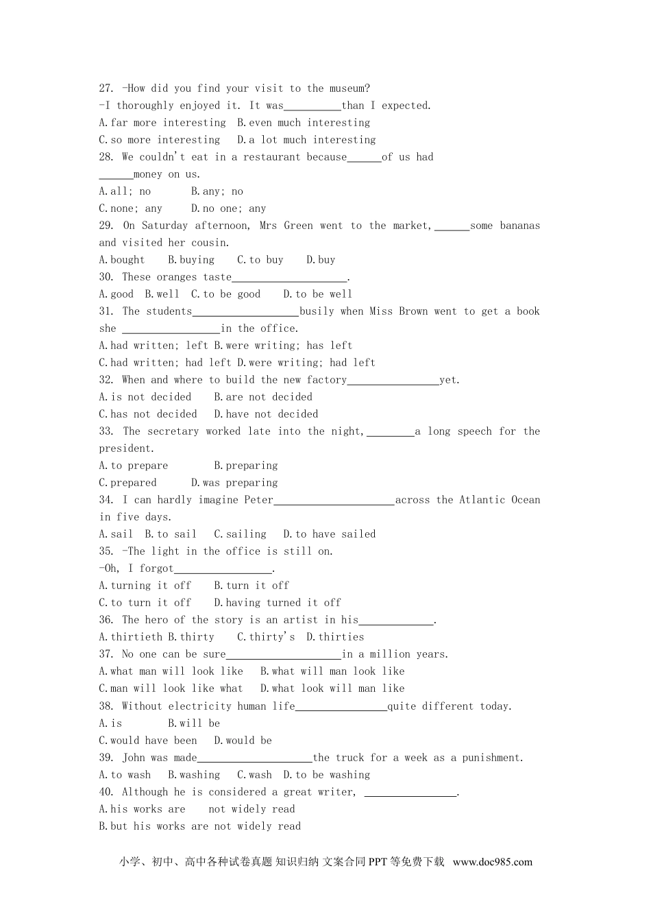 1991年内蒙古高考英语真题及答案第Ⅰ卷第一部分(K)英语知识KⅠ.语音和拼写知识(共10小题,计分5%)A)从A、B、C、D中找出其划线部分与所给单词的划线部分读音相同的选项。例:haveA.gaveB.saveC.hatD.made答案是C.1.monthA.governmentB.commonC.alongD.monument2.coughA.daughterB.enoughC.fightD.neighbour3.aheadA.cheapB.breakC.seasonD.breath4.naturalA.natureB.populationC.practiceD.native5.saltA.chalkB.calmC.almostD.halfB)以下所给单词均不完整,请从A、B、C、D中选出适当的字母或字母组合,使其完整与正确。例:alrdyA.eaB.eeC.ieD.eu答案是A。6.captnA.aiB.iaC.ieD.ei7.techniA.gueB.cueC.kueD.que8.psonousA.ioB.oiC.eoD.oe9.stmachA.uB.aC.eD.o10.trsersA.auB.ouC.awD.owKⅡ.单项填空(共30小题,计分15%)从A、B、C、D四个选项中,选出可以填入空白处的正确答案。例:Hecomeslatesometimes,?A.isheB.isn'theC.comesheD.doesn'the答案是D。11.Willyoumeafavour,please?A.giveB.makeC.doD.bring12.,Iwenttotherailwaystationtoseemyfriendoff.小学、初中、高中各种试卷真题知识归纳文案合同PPT等免费下载www.doc985.comA.AftereatingquicklymydinnerB.AftermyquicklyeatingdinnerC.AftereatingmydinnerquicklyD.Aftereatingmyquicklydinner13.Ilearnedtoabicycleasasmallboy.A.driveB.rideC.operateD.run14.Doesmatterifhecan'tfinishthejobontime?A.thisB.thatC.heD.it15.Acomputerthinkforitself;itmustbetoldwhattodo.A.can'tB.couldn'tC.maynotD.mightnot16.Don'tsmokeinthemeeting-room,?A.doyouB.willyouC.canyouD.couldyou17.-Haveyoumovedintothenewhouse?-Notyet.Therooms.A.arebeingpaintedB.arepaintingC.arepaintedD.arebeingpainting18.AlexanderGrahamBellinventedtelephonein1876.A.(不填)B.aC.theD.one19.Weeachotherthebestofluckintheexamination.A.hopedB.wantedC.expectedD.wished20.!There'satraincoming.A.LookoutB.LookaroundC.LookforwardD.Lookon21.-WillsomebodygoandgetDrWhite?-He'salreadybeen.A.askedforB.sentforC.calledforD.lookedfor22.Themurdererwasbroughtin,withhishandsbehindhisback.A.beingtiedB.havingtiedC.tobetiedD.tied23.-Wehaven'theardfromJaneforalongtime.-Whatdoyousupposetoher?A.washappeningB.tohappenC.hashappenedD.havinghappened24.Sheheardaterriblenoise,broughtherheartintohermouth.A.itB.whichC.thisD.that25.MrsSmithwarnedherdaugtherafterdrinking.A.nevertodriveB.toneverdriveC.neverdrivingD.neverdrive26.-DoyouknowJimquarrelledwithhisbrother?-Idon'tknow,.A.nordon'tIcareB.nordoIcareC.Idon'tcareneitherD.Idon'tcarealso小学、初中、高中各种试卷真题知识归纳文案合同PPT等免费下载www.doc985.com27.-Howdidyoufindyourvisittothemuseum?-Ithoroughlyenjoyedit.ItwasthanIexpected.A.farmoreinterestingB.evenmuchinterestingC.somoreinterestingD.alotmuchinteresting28.Wecouldn'teatinarestaurantbecauseofushadmoneyonus.A.all;noB.any;noC.none;anyD.noone;any29.OnSaturdayafternoon,MrsGreenwenttothemarket,somebananasandvisitedhercousin.A.boughtB.buyingC.tobuyD.buy30.Theseorangestaste.A.goodB.wellC.tobegoodD.tobewell31.ThestudentsbusilywhenMissBrownwenttogetabooksheintheoffice.A.hadwritten;leftB.werewriting;hasleftC.hadwritten;hadleftD.werewriting;hadleft32.Whenandwheretobuildthenewfactoryyet.A.isnotdecidedB.arenotdecidedC.hasnotdecidedD.havenotdecided33.Thesecretaryworkedlateintothenight,alongspeechforthepresident.A.toprepareB.preparingC.preparedD.waspreparing34.IcanhardlyimaginePeteracrosstheAtlanticOceaninfivedays.A.sailB.tosailC.sailingD.tohavesailed35.-Thelightintheofficeisstillon.-Oh,Iforgot.A.turningitoffB.turnitoffC.toturnitoffD.havingturneditoff36.Theheroofthestoryisanartistinhis.A.thirtiethB.thir...
