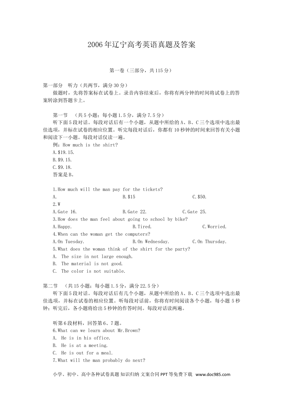 2006年辽宁高考英语真题及答案第一卷(三部分,共115分)第一部分听力(共两节,满分30分)做题时,先将答案标在试卷上。录音内容结束后,你将有两分钟的时间将试卷上的答案转涂到答题卡上。第一节(共5小题;每小题1.5分,满分7.5分)听下面5段对话。每段对话后有一个小题,从题中所给的A、B、C三个选项中选出最佳选项,并标在试卷的相应位置。听完每段对话后,你都有10秒钟的时间来回答有关小题和阅读下一小题。每段对话仅读一遍。例:Howmuchistheshirt?A.$19.15.B.$9.15.C.$9.18.答案是B。1.Howmuchwillthemanpayforthetickets?A.B.$15C.$50.2.WA.Gate16.B.Gate22.C.Gate25.3.Howdoesthemanfeelaboutgoingtoschoolbybike?A.Happy.B.Tired.C.Worried.4.Whencanthewomangetthecomputers?A.OnTuesday.B.OnWednesday.C.OnThursday.5.Whatdoesthewomanthinkoftheshirtfortheparty?A.Thesizeinnotlargeenough.B.Thematerialisnotgood.C.Thecolorisnotsuitable.第二节(共15小题;每小题1.5分,满分22.5分)听下面5段对话。每段对话后有几个小题,从题中所给的A、B、C三个选项中选出最佳选项,并标在试卷的相应位置。听每段对话前,你将有时间阅读各个小题,每小题5秒钟;听完后,各小题将给出5秒钟的作答时间。每段对话读两遍。听第6段材料,回答第6、7题。6.WhatcanwelearnaboutMr.Brown?A.Heisinhisoffice.B.Heisatameeting.C.Heisoutforameal.7.Whatwillthemanprobablydonext?小学、初中、高中各种试卷真题知识归纳文案合同PPT等免费下载www.doc985.comA.Callback.B.Comeagain.C.Leaveamessage.听第7段材料,回答第8、9题。8.Whatkindofroomdoesthemanwanttotake?A.Asingleroom.B.Adoubleroom.C.Aroomforthree.9.Whatdoesthemanneedtoputintheform?A.Telephoneandstudentcardnumbers.B.Studentcardnumberandaddress.C.Addressandtelephonenumber.听第9段材料,回答第13至16题。13.Whenwillthevisitorscome?A.InMarch.B.InApirl.C.InMay.14.Howmanycoming?A.8.B.16.C.12.15.Whatwillthevisitorsdoonthesecondday?A.Gotoaparty.B.Visitschools.C.Attendalecture.16.Wherewillthevisitorsgoonthefinalday?A.ToLondon.B.ToScotland.C.Tothecoast.听第10段材料,回答第17至20题。17.Whatisthefirstwordthebabytriedtosay?A.Truck.B.OK.C.Duck.18.Howoldwasthebabywhenhelearnedtosaythatwordcorrectly?A.About18months.B.About21months.C.About24months.19.Whatdidthefatherdowhenthebabyscreamedthatwordattheairport?A.Hecorrectedthebaby.B.Hetriedtostopthebaby.C.Hehidhimselfsomewhere.20.Whydidthemotherpretendnottoknowthebaby?A.Shegotangrywiththefather.B.Shewasfrightenedbythenoise.C.Shefeltuneasyaboutthenoisybaby.第二部分英语知识运用(共两节,满分45分)第一节单项填空(共15小题;每小题1分,满分15分)从A、B、C、D四个选项中,选出可以填入空白处的最佳选项,并在答题卡上将该项涂黑。小学、初中、高中各种试卷真题知识归纳文案合同PPT等免费下载www.doc985.com例:Itisgenerallyconsideredunwisetogivechildrentheywant.A.howeverB.whateverC.whicheverD.whenever答案是B。21.Ofallreasonsformydecisiontobecomeauniversityprofessor,myfather’sadvicewasmostimportantone.A.the;aB.不填;aC.不填;theD.the;the22.ThecomputersystemsuddenlywhilehewassearchingforinformationontheInternet.A.brokedownB.brokeoutC.brokeupD.brokein23.Ihearboysinyourschoollikeplayingfootballintheirsparetime,thoughotherspreferbasketball.A.quitealotB.quiteafewC.quiteabitD.quitealittle24.Hewasabouthalfwaythroughhismealafamiliarvoicecametohisears.A.whyB.whereC.whenD.while25.Iwastoldthattherewereabout50foreignstudentsChineseintheschool,mostwerefromGermany.A.study;ofwhomB.study;ofthemC.studying;ofthemD.studying;ofwhom26.-Thesebooksaretooheavyformetocarry.-.A.YoumayaskforhelpB.I’willgiveyouahandC.I’willdoyouafavorD.I’dcometohelp2...