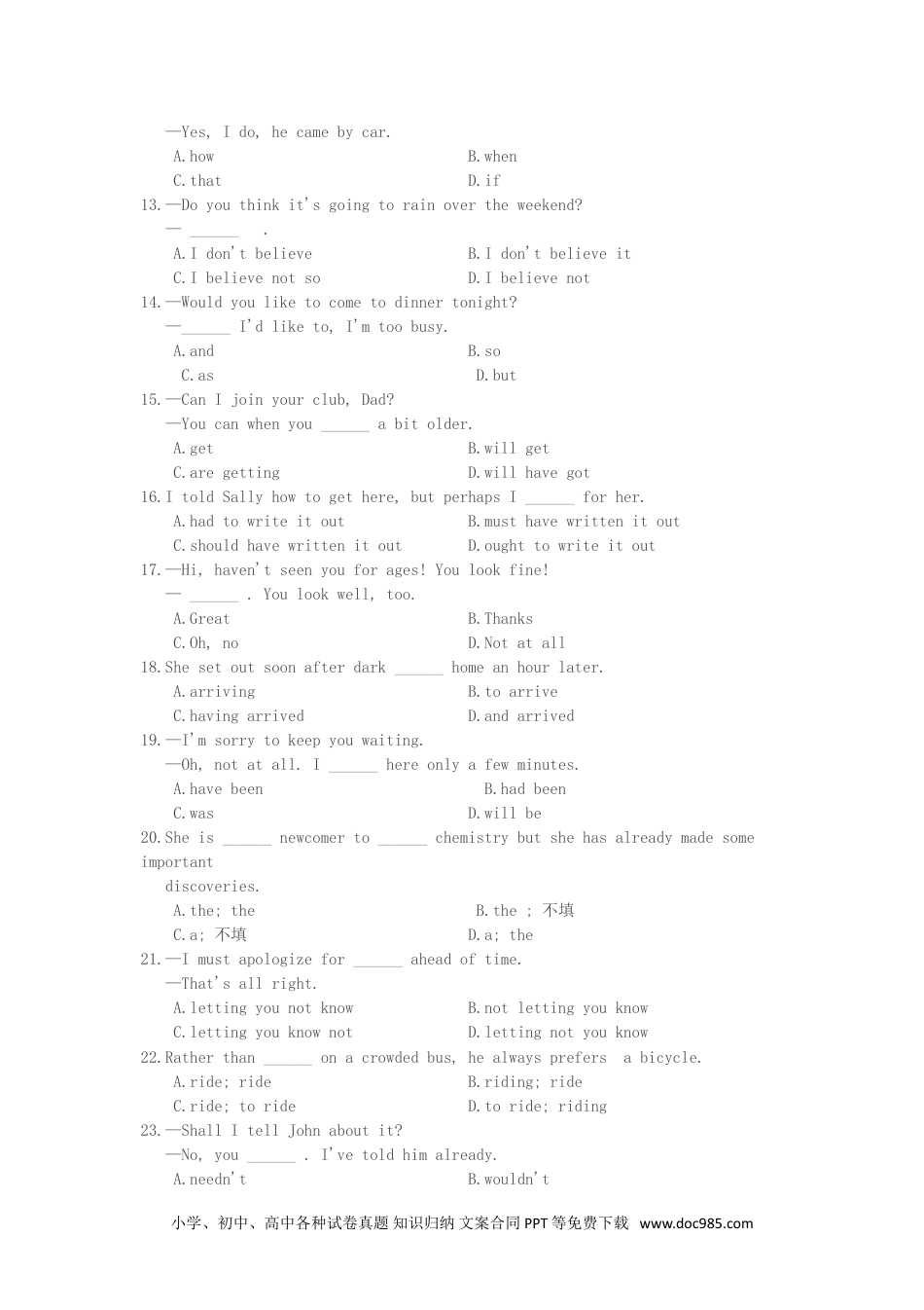1994年辽宁高考英语真题及答案第一卷(三大题,共110分)I、单项填空(共40小题,计分40分)A)从A、B、C、D中找出其划线部分与所给单词的划线部分读音相同的选项。例:haveA.gaveB.saveC.hatD.made答案是C。1.specialA.shallowB.officerC.chokeD.trousers2.mathematicsA.ecycleB.respectC.messageD.package3.shoulderA.ouderB.proounceC.onelyD.Europe4.increaseA.desertB.disignC.wiseD.promise5.parentA.spearB.wearC.carryD.patientB)以下所给单词均不完整,从A、B、C、D中找出适当的字母或字母组合使其正确与完整。例:alr______dyA.eaB.eeC.ieD.eu答案是A。6.congr____t____lationA.a;uB.e;uC.o;oD.a;o7.handker____iefA.schB.shC.tchD.ch8.act____lA.ruB.urC.auD.ua9.li____idA.quB.qC.kwD.k10.c____t____nA.ur;aiB.er;iaC.ur;iaD.ar;aiC)从A、B、C、D四个选项中,选出可以填入空白处的正确答案。例:Hecomeslatesometimes,______?A.isheB.isn'theC.comesheD.doesn'the答案是D。11.—IsyourcameralikeBill'sandAnn's?—No,butit'salmostthesameas______.A.herB.yoursC.themD.their12.—Doyouremember______hecame?小学、初中、高中各种试卷真题知识归纳文案合同PPT等免费下载www.doc985.com—Yes,Ido,hecamebycar.A.howB.whenC.thatD.if13.—Doyouthinkit'sgoingtorainovertheweekend?—______.A.Idon'tbelieveB.Idon'tbelieveitC.IbelievenotsoD.Ibelievenot14.—Wouldyouliketocometodinnertonight?—______I'dliketo,I'mtoobusy.A.andB.soC.asD.but15.—CanIjoinyourclub,Dad?—Youcanwhenyou______abitolder.A.getB.willgetC.aregettingD.willhavegot16.ItoldSallyhowtogethere,butperhapsI______forher.A.hadtowriteitoutB.musthavewrittenitoutC.shouldhavewrittenitoutD.oughttowriteitout17.—Hi,haven'tseenyouforages!Youlookfine!—______.Youlookwell,too.A.GreatB.ThanksC.Oh,noD.Notatall18.Shesetoutsoonafterdark______homeanhourlater.A.arrivingB.toarriveC.havingarrivedD.andarrived19.—I'msorrytokeepyouwaiting.—Oh,notatall.I______hereonlyafewminutes.A.havebeenB.hadbeenC.wasD.willbe20.Sheis______newcomerto______chemistrybutshehasalreadymadesomeimportantdiscoveries.A.the;theB.the;不填C.a;不填D.a;the21.—Imustapologizefor______aheadoftime.—That'sallright.A.lettingyounotknowB.notlettingyouknowC.lettingyouknownotD.lettingnotyouknow22.Ratherthan______onacrowdedbus,healwaysprefersabicycle.A.ride;rideB.riding;rideC.ride;torideD.toride;riding23.—ShallItellJohnaboutit?—No,you______.I'vetoldhimalready.A.needn'tB.wouldn't小学、初中、高中各种试卷真题知识归纳文案合同PPT等免费下载www.doc985.comC.mustn'tD.shouldn't24.—Howlonghasthisbookshopbeeninbusiness?—______1982.A.AfterB.InC.FromD.Since25.Themissingboyswerelastseen______neartheriver.A.playingB.tobeplayingC.playD.toplay26.Don'tallspeakatonce!______,please.A.EachatonetimeB.OnebyonetimeC.OneforeachtimeD.Oneatatime27.—Doyoulikethematerial?—Yes,it______verysoft.A.isfeelingB.feltC.feelsD.isfelt28.Johnplaysfootball______,ifnotbetterthan,David.A.aswellB.aswellasC.sowellD.sowellas29.Idon'treallyworkhere;I______untilthenewsecretaryarrives.A.justhelpoutB.havejusthelpedoutC.amjusthelpingoutD.willjusthelpout30.Ittherewerenoexaminations,weshouldhave______atschool.A.thehappiesttimeB.amorehappiertimeC.muchhappiesttimeD.amuchhappiertime31.Ididn'tseeyoursisteratthemeeting.Ifshe______,shewouldhavemetmybrother.A.hascomeB.didcomeC.cameD.hadcome32.ThevisitingMinisterexpressedhissatisfactionwiththetalks,______thathehadenjoyedhisstayhere.A.havingaddedB.toaddC.addingD.added33.Here'smycard.Let'skeepin______.A.touchB.relationC.connectionD.friendship34.Thefirsttextbooks______fo...