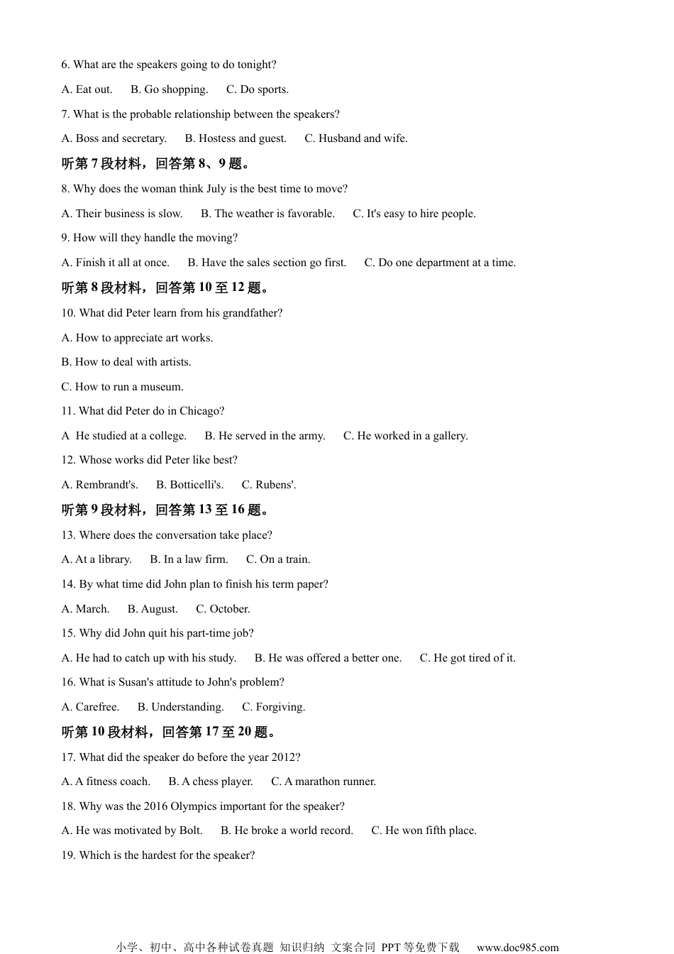 小学、初中、高中各种试卷真题知识归纳文案合同PPT等免费下载www.doc985.com2022年普通高等学校招生全国统一考试英语注意事项:1.答卷前,考生务必将自己的姓名、准考证号填写在答题卡上。2.回答选择题时,选出每小题答案后,用铅笔把答题卡上对应题目的答案标号涂黑。如需改动,用橡皮擦干净后,再选涂其他答案标号。回答非选择题时,将答案写在答题卡上,写在本试卷上无效。3.考试结束后,将本试卷和答题卡一并交回。第一部分听力(共两节,满分30分)做题时,先将答案标在试卷上。录音内容结束后,你将有两分钟的时间将试卷上的答案转涂到答题卡上。第一节(共5小题;每小题1.5分,满分7.5分)听下面5段对话。每段对话后有一个小题,从题中所给的A、B、C三个选项中选出最佳选项。听完每段对话后,你都有10秒钟的时间来回答有关小题和阅读下一小题。每段对话仅读一遍。例:Howmuchistheshirt?A.£19.15.B.£9.18.C.£9.15.答案是C。1.Whatdoesthemanwanttodo?A.Havebreakfast.B.Takeawalk.C.Callhisoffice.2.WhatwasGeorgedoinglastnight?A.Havingameeting.B.Flyinghome.C.Workingonaproject.3.Whydoesthemansuggestgoingtothepark?A.It'sbig.B.It'squiet.C.It'snew.4.Howdoesthewomansound?A.Annoyed.B.Pleased.C.Puzzled.5.Whereistheman'stable?A.Nearthedoor.B.Bythewindow.C.Inthecorner.第二节(共15小题;每小题1.5分,满分22.5分)听下面5段对话或独白。每段对话或独白后有几个小题,从题中所给的A、B、C三个选项中选出最佳选项。听每段对话或独白前,你将有时间阅读各个小题,每小题5秒钟;听完后,各小题将给出5秒钟的作答时间。每段对话或独白读两遍。听第6段材料,回答第6、7题。小学、初中、高中各种试卷真题知识归纳文案合同PPT等免费下载www.doc985.com6.Whatarethespeakersgoingtodotonight?A.Eatout.B.Goshopping.C.Dosports.7.Whatistheprobablerelationshipbetweenthespeakers?A.Bossandsecretary.B.Hostessandguest.C.Husbandandwife.听第7段材料,回答第8、9题。8.WhydoesthewomanthinkJulyisthebesttimetomove?A.Theirbusinessisslow.B.Theweatherisfavorable.C.It'seasytohirepeople.9.Howwilltheyhandlethemoving?A.Finishitallatonce.B.Havethesalessectiongofirst.C.Doonedepartmentatatime.听第8段材料,回答第10至12题。10.WhatdidPeterlearnfromhisgrandfather?A.Howtoappreciateartworks.B.Howtodealwithartists.C.Howtorunamuseum.11.WhatdidPeterdoinChicago?A.Hestudiedatacollege.B.Heservedinthearmy.C.Heworkedinagallery.12.WhoseworksdidPeterlikebest?A.Rembrandt's.B.Botticelli's.C.Rubens'.听第9段材料,回答第13至16题。13.Wheredoestheconversationtakeplace?A.Atalibrary.B.Inalawfirm.C.Onatrain.14.BywhattimedidJohnplantofinishhistermpaper?A.March.B.August.C.October.15.WhydidJohnquithispart-timejob?A.Hehadtocatchupwithhisstudy.B.Hewasofferedabetterone.C.Hegottiredofit.16.WhatisSusan'sattitudetoJohn'sproblem?A.Carefree.B.Understanding.C.Forgiving.听第10段材料,回答第17至20题。17.Whatdidthespeakerdobeforetheyear2012?A.Afitnesscoach.B.Achessplayer.C.Amarathonrunner.18.Whywasthe2016Olympicsimportantforthespeaker?A.HewasmotivatedbyBolt.B.Hebrokeaworldrecord.C.Hewonfifthplace.19.Whichisthehardestforthespeaker?小学、初中、高中各种试卷真题知识归纳文案合同PPT等免费下载www.doc985.comA.Gettingoveraninjury.B.Doingstrengthtraining.C.RepresentingBotswana.20.Whatisthespeakermainlytalkingabout?A.Hisplantogoforthegold.B.Hisexperienceonthetrack.C.Hisloveforhishomecountry.答案速查01—05BCBAC06—10ACACA11—15ACCBA16—20BBCAB录音原文(Text1)M:Jenny,youcanjustdropmehere.W:Butwearetwostreetsawayfromtheoffice.M:It’sfine.Ihadabigbreakfast,andfeellikeabitofwalk.(Text2)W:Hello,George.Youlooktired.Didn’tsleepwelllastnight?M:No,notatall.Ihadtoworkflatouttom...