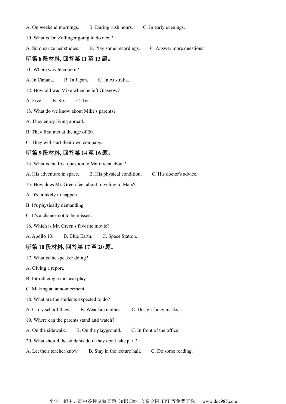 小学、初中、高中各种试卷真题知识归纳文案合同PPT等免费下载www.doc985.com2024年普通高等学校招生全国统一考试(全国甲卷)英语学科第一部分听力(共两节,满分30分)第一节(共5小题;每小题1.5分,满分7.5分)听下面5段对话。每段对话后有一个小题,从题中所给的A、B、C三个选项中选出最佳选项。听完每段对话后,你都有10秒钟的时间来回答有关小题和阅读下一小题。每段对话仅读一遍。1.Wherearethespeakersgoing?A.Anewrestaurant.B.Aconveniencestore.C.Theiroffice.2.WhenistheclasspresentationaccordingtoVicky?A.OnThursday.B.OnWednesday.C.OnTuesday.3.Whydoesthewomanmakethecall?A.Tochecktheprice.B.Tomakeanapology.C.Tocancelherorder.4.Whatistheprobablerelationshipbetweenthespeakers?A.Husbandandwife.B.Bossandemployee.C.Salespersonandcustomer.5.Whatarethespeakersmainlytalkingabout?A.Theirmovetoanewplace.B.Tom'sfriendsatschool.C.Asportscenter.第二节(共15小题;每小题1.5分,满分22.5分)听下面5段对话或独白。每段对话或独白后有几个小题,从题中所给的A、B、C三个选项中选出最佳选项。听每段对话或独白前,你将有时间阅读各个小题,每小题5秒钟;听完后,各小题将给出5秒钟的作答时间。每段对话或独白读两遍。听第6段材料,回答第6、7题。6.Whatdoesthegirltellherdad?A.Shedecidestoquitcollege.B.Sheworriesaboutheracademicability.C.Sheisunpopularwithherclassmates.7.Howdoesthefatherhelphisdaughter?A.Bytellingafunnyjoke.B.Bysharinghisownstory.C.Byplanningaschooltour.听第7段材料,回答第8至10题。8.Whoistheman?A.Aresearcher.B.Abirdwatcher.C.Aradiohost.9.Whendobirdssingquieter?小学、初中、高中各种试卷真题知识归纳文案合同PPT等免费下载www.doc985.comA.Onweekendmornings.B.Duringrushhours.C.Inearlyevenings.10.WhatisDr.Zollingergoingtodonext?A.Summarizeherstudies.B.Playsomerecordings.C.Answermorequestions.听第8段材料,回答第11至13题。11.WherewasJenaborn?A.InCanada.B.InJapan.C.InAustralia.12.HowoldwasMikewhenheleftGlasgow?A.Five.B.Six.C.Ten.13.WhatdoweknowaboutMike'sparents?A.Theyenjoylivingabroad.B.Theyfirstmetattheageof20.C.Theywillstarttheirowncompany.听第9段材料,回答第14至16题。14.WhatisthefirstquestiontoMr.Greenabout?A.Hisadventureinspace.B.Hisphysicalcondition.C.Hisdoctor'sadvice.15.HowdoesMr.GreenfeelabouttravelingtoMars?A.It'sunlikelytohappen.B.It'sphysicallydemanding.C.It'sachancenottobemissed.16.WhichisMr.Green'sfavoritemovie?A.Apollo13.B.BlueEarth.C.SpaceStation.听第10段材料,回答第17至20题。17.Whatisthespeakerdoing?A.Givingareport.B.Introducingamusicalplay.C.Makinganannouncement.18.Whatarethestudentsexpectedtodo?A.Carryschoolflags.B.Wearfunclothes.C.Designfancymasks.19.Wherecantheparentsstandandwatch?A.Onthesidewalk.B.Ontheplayground.C.Infrontoftheoffice.20.Whatshouldthestudentsdoiftheydon'ttakepart?A.Lettheirteacherknow.B.Stayinthelecturehall.C.Dosomereading.小学、初中、高中各种试卷真题知识归纳文案合同PPT等免费下载www.doc985.com参考答案1-5ACBCA6-10BBCAB11-15ABABC16-20ACBCA听力原文(Text1)W:Look,wehavetimeforhamburgaratthisformerrestaurant.W:Forgetthat.IknowanewrestaurantonMapleStreetnotfarfromourcompany.Isthatokaywithyou?M:Perfect.(Text2)M:Hi,Vicky.IrememberourclasspresentationisonWednesday,butyousaidit'sonThursday.Areyousure?W:Sorry.Itwasaslipofthetongue.ImeantTuesdayforsure.(Text3)M:Allen'sfurniture.CanIhelpyou?W:Hi.I'mtheonewhoaskedaboutthepriceofaglassteatabletop.JustnowI'msorry,Imadeamistake.Thesizeshouldbe75centimetersby50centimeters.M:Oh.That'llmakeadifferenceintheprice.Holdonandletmefindout.(Text4)W:Theseareournewarrivals.Everymanshould...