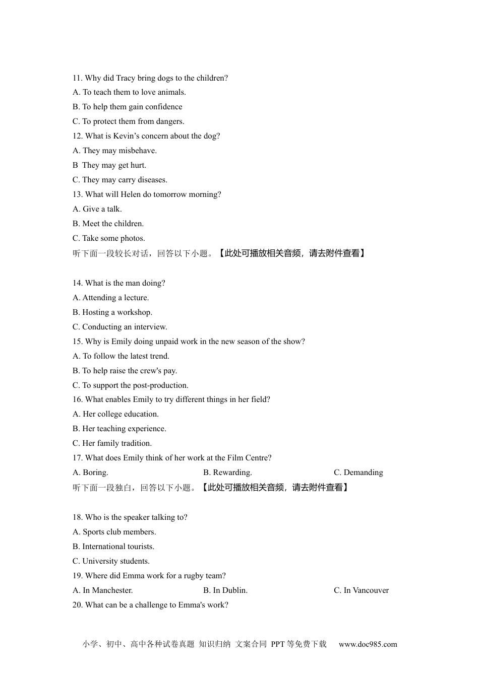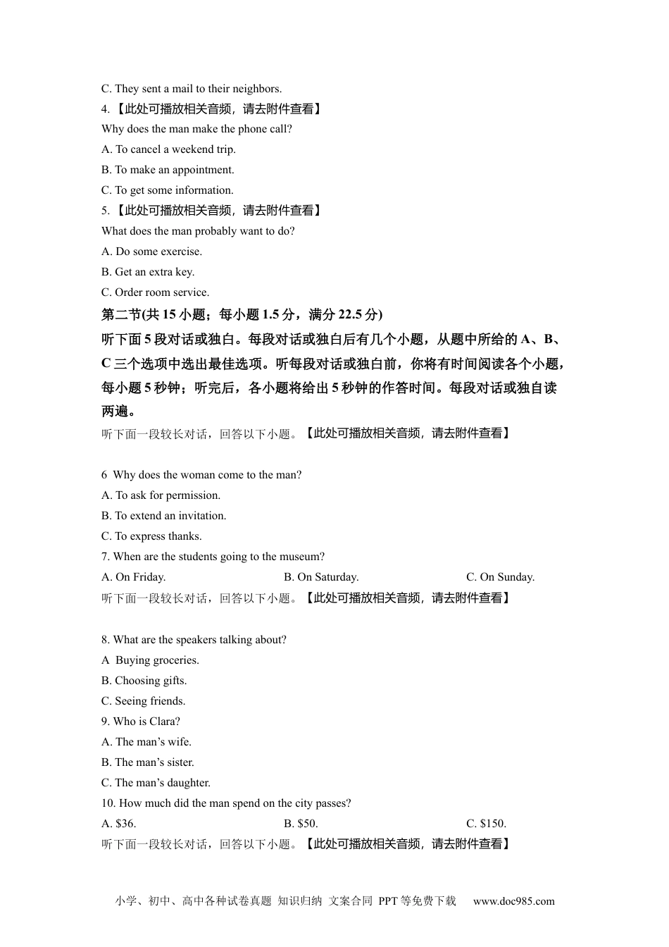 小学、初中、高中各种试卷真题知识归纳文案合同PPT等免费下载www.doc985.com2022年普通高等学校招生全国统一考试英语本试卷共10页,满分120分。考试用时120分钟。注意事项:1.答卷前,考生务必用黑色字迹钢笔或签字笔将自己的姓名、考生号、考场号和座位号填写在答题卡上。用2B铅笔将试卷类型(A)填涂在答题卡相应位置上。将条形码横贴在答题卡右上角“条形码粘贴处”。因笔试不考听力,选择题从第二部分的“阅读”开始,试题序号从“21”开始。2.作答选择题时,选出每小题答案后,用2B铅笔把答题卡上对应题目选项的答案信息点涂黑;如需改动,用橡皮擦干净后,再选涂其他答案,答案不能答在试卷上。3.非选择题必须用黑色字迹钢笔或签字笔作答,答案必须写在答题卡各题目指定区域内相应位置上;如高改动,先划掉原来的答案,然后再写上新的答案;不准使用铅笔和涂改液,不按以上要求作答的答案无效。4.考生必须保持答题卡的整洁:考试结束后,将试卷和符题卡一并交回。第一部分听力(共两节,满分30分)做题时,先将答案标在试卷上。录音内容结束后,你将有两分钟的时间将试卷上的答案转涂到答题卡上。第一节(共5小题;每小题1.5分,满分7.5分)听下面5段对话。每段对话后有一个小题,从题中所给的A、B、C三个选项中选出最佳选项。听完每段对话后,你都有10秒钟的时间来回答有关小题和阅读下一小题。每段对话仅读一遍。例:Howmuchistheshirt?A.£19.15.B.£9.18.C.£9.15.答案是C。1.【此处可播放相关音频,请去附件查看】Whatwillthespeakersdonext?A.Checkthemap.B.Leavetherestaurant.C.Parkthecar.2.【此处可播放相关音频,请去附件查看】Wherearethespeakers?A.Atabusstop.B.Athome.C.Attheairport.3.【此处可播放相关音频,请去附件查看】Whatdidthespeakersdolastweek?A.Theyhadacelebrationdinner.B.Theywenttoseeanewbornbaby.小学、初中、高中各种试卷真题知识归纳文案合同PPT等免费下载www.doc985.comC.Theysentamailtotheirneighbors.4.【此处可播放相关音频,请去附件查看】Whydoesthemanmakethephonecall?A.Tocancelaweekendtrip.B.Tomakeanappointment.C.Togetsomeinformation.5.【此处可播放相关音频,请去附件查看】Whatdoesthemanprobablywanttodo?A.Dosomeexercise.B.Getanextrakey.C.Orderroomservice.第二节(共15小题;每小题1.5分,满分22.5分)听下面5段对话或独白。每段对话或独白后有几个小题,从题中所给的A、B、C三个选项中选出最佳选项。听每段对话或独白前,你将有时间阅读各个小题,每小题5秒钟;听完后,各小题将给出5秒钟的作答时间。每段对话或独自读两遍。听下面一段较长对话,回答以下小题。【此处可播放相关音频,请去附件查看】6.Whydoesthewomancometotheman?A.Toaskforpermission.B.Toextendaninvitation.C.Toexpressthanks.7.Whenarethestudentsgoingtothemuseum?A.OnFriday.B.OnSaturday.C.OnSunday.听下面一段较长对话,回答以下小题。【此处可播放相关音频,请去附件查看】8.Whatarethespeakerstalkingabout?A.Buyinggroceries.B.Choosinggifts.C.Seeingfriends.9.WhoisClara?A.Theman’swife.B.Theman’ssister.C.Theman’sdaughter.10.Howmuchdidthemanspendonthecitypasses?A.$36.B.$50.C.$150.听下面一段较长对话,回答以下小题。【此处可播放相关音频,请去附件查看】小学、初中、高中各种试卷真题知识归纳文案合同PPT等免费下载www.doc985.com11.WhydidTracybringdogstothechildren?A.Toteachthemtoloveanimals.B.TohelpthemgainconfidenceC.Toprotectthemfromdangers.12.WhatisKevin’sconcernaboutthedog?A.Theymaymisbehave.B.Theymaygethurt.C.Theymaycarrydiseases.13.WhatwillHelendotomorrowmorning?A.Giveatalk.B.Meetthechildren.C.Takesomephotos.听下面一段较长对话,回答以下小题。【此处可播放相关音频,请去附件查看】14.Whatisthemandoing?A.Attendingalecture.B.Hostingaworkshop.C.Conductinganinterview.15.WhyisEmilydoingunpaidworkinthenewseasonoftheshow?A.Tofollowthelatesttrend.B.Tohelpraisethecrew'spa...