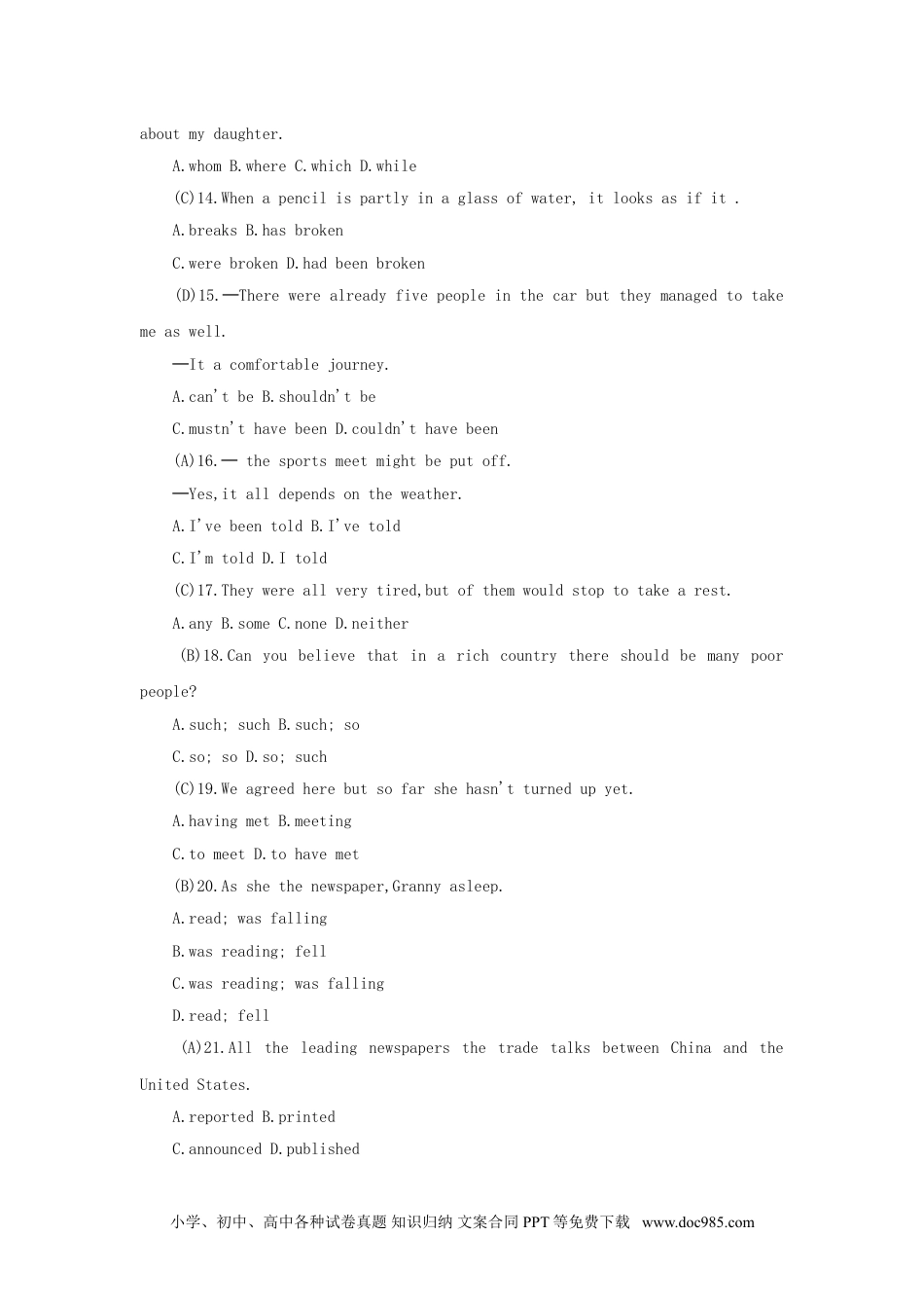 1995年黑龙江高考英语真题及答案1.单项填空(共40小题,计分40分)A)从A、B、C、D中找出其划线部分与所给单词的划线部分读音相同的选项。例:haveA.gaveB.saveC.hatD.made答案是C。(B)1.libraryA.languageB.materialC.operateD.labour(A)2.courageA.cousinB.countC.youthD.cough(A)3.referA.researchB.fishermanC.disappearD.recordder(D)4.pleasureA.expressionB.musicianC.oceanD.conclusion(C)5.snatchA.stomachB.technicalC.chargeD.characterB)从A、B、C、D中找出适当的字母或字母组合使以下所给单词完整与正确。例:alrdyA.eaB.eeC.ieD.eu答案是A。(D)6.pticulA.ar;erB.er;arC.er;erD.ar;ar(A)7.prnnceA.o;ouB.o;uC.e;ouD.e;u(C)8.cntnentA.o;aB.u;IC.o;ID.u;a(C)9.nmlA.ur;aB.or;eC.or;aD.ur;e(A)10.thrghA.o;ouB.o;euC.ou;ouD.ou;euC)从A、B、C、D四个选项中,选出可以填入空白处的正确答案.例:Hecomeslatesometimes,?A.isheB.isn'theC.comesheD.doesn'the答案是D.(B)11.Pauldoesn'thavetobemade.Healwaysworkshard.A.learnB.tolearnC.learnedD.learning(A)12.─Yourphonenumberagain?Iquitecatchit.─It's9568442.A.didn'tB.couldn'tC.don'tD.can't(D)13.ShethoughtIwastalkingaboutherdaughter,,infact,Iwastalking小学、初中、高中各种试卷真题知识归纳文案合同PPT等免费下载www.doc985.comaboutmydaughter.A.whomB.whereC.whichD.while(C)14.Whenapencilispartlyinaglassofwater,itlooksasifit.A.breaksB.hasbrokenC.werebrokenD.hadbeenbroken(D)15.─Therewerealreadyfivepeopleinthecarbuttheymanagedtotakemeaswell.─Itacomfortablejourney.A.can'tbeB.shouldn'tbeC.mustn'thavebeenD.couldn'thavebeen(A)16.─thesportsmeetmightbeputoff.─Yes,italldependsontheweather.A.I'vebeentoldB.I'vetoldC.I'mtoldD.Itold(C)17.Theywereallverytired,butofthemwouldstoptotakearest.A.anyB.someC.noneD.neither(B)18.Canyoubelievethatinarichcountrythereshouldbemanypoorpeople?A.such;suchB.such;soC.so;soD.so;such(C)19.Weagreedherebutsofarshehasn'tturnedupyet.A.havingmetB.meetingC.tomeetD.tohavemet(B)20.Asshethenewspaper,Grannyasleep.A.read;wasfallingB.wasreading;fellC.wasreading;wasfallingD.read;fell(A)21.AlltheleadingnewspapersthetradetalksbetweenChinaandtheUnitedStates.A.reportedB.printedC.announcedD.published小学、初中、高中各种试卷真题知识归纳文案合同PPT等免费下载www.doc985.com(D)22.Ihopethereareenoughglassesforeachguesttohave.A.itB.thoseC.themD.one(C)23.Ifweworkwithastrongwill,wecanovercomeanydifficulty,greatitis.A.whatB.howC.howeverD.whatever(B)24.Youdon'tneedtodescribeher.Iherseveraltimes.A.hadmetB.havemetC.metD.meet(C)25.Icanhardlyheartheradio.Wouldyouplease?A.turnitonB.turnitdownC.turnitupD.turnitoff(D)26.-Youwerebraveenoughtoraiseobjectionsatthemeeting.-Well,nowIregretthat.A.todoB.tobedoingC.tohavedoneD.havingdone(A)27.-Haveyoufinishedyourreportyet?-No,I'llfinishintenminutes.A.anotherB.otherC.moreD.less(B)28.You'reyourtimetryingtopersuadehim;he'llneverjoinus.A.spendingB.wastingC.losingD.missing(B)29.-HowwasyourrecentvisittoQingdao?-Itwasgreat.Wevisitedsomefriends,andspentthedaysattheseaside.A.fewlastsunnyB.lastfewsunnyC.lastsunnyfewD.fewsunnylast(D)30.-I'llbeawayonabusinesstrip.Wouldyoumindlookingaftermycat?-Notatall..A.I'venotimeB.I'drathernotC.I'dlikeitD.I'dbehappyto(C)31.It'snearlyseveno'clock.Jackbehereatanymoment.A.mustB.needC.shouldD.can(A)32.-I'dlikeinformationaboutthemangagementofyourhotel,please.-Well,youcouldhavewordwiththemanager.Hemightbehelpful.A.some;aB.an;someC.some;someD.an;a(C)33.Itwasnotuntil1920regularradiobroadcastsbegan.小学、初中、高中各种试卷真题知识归纳文案合同PPT等免费下载www...