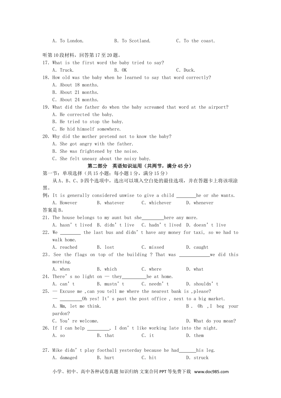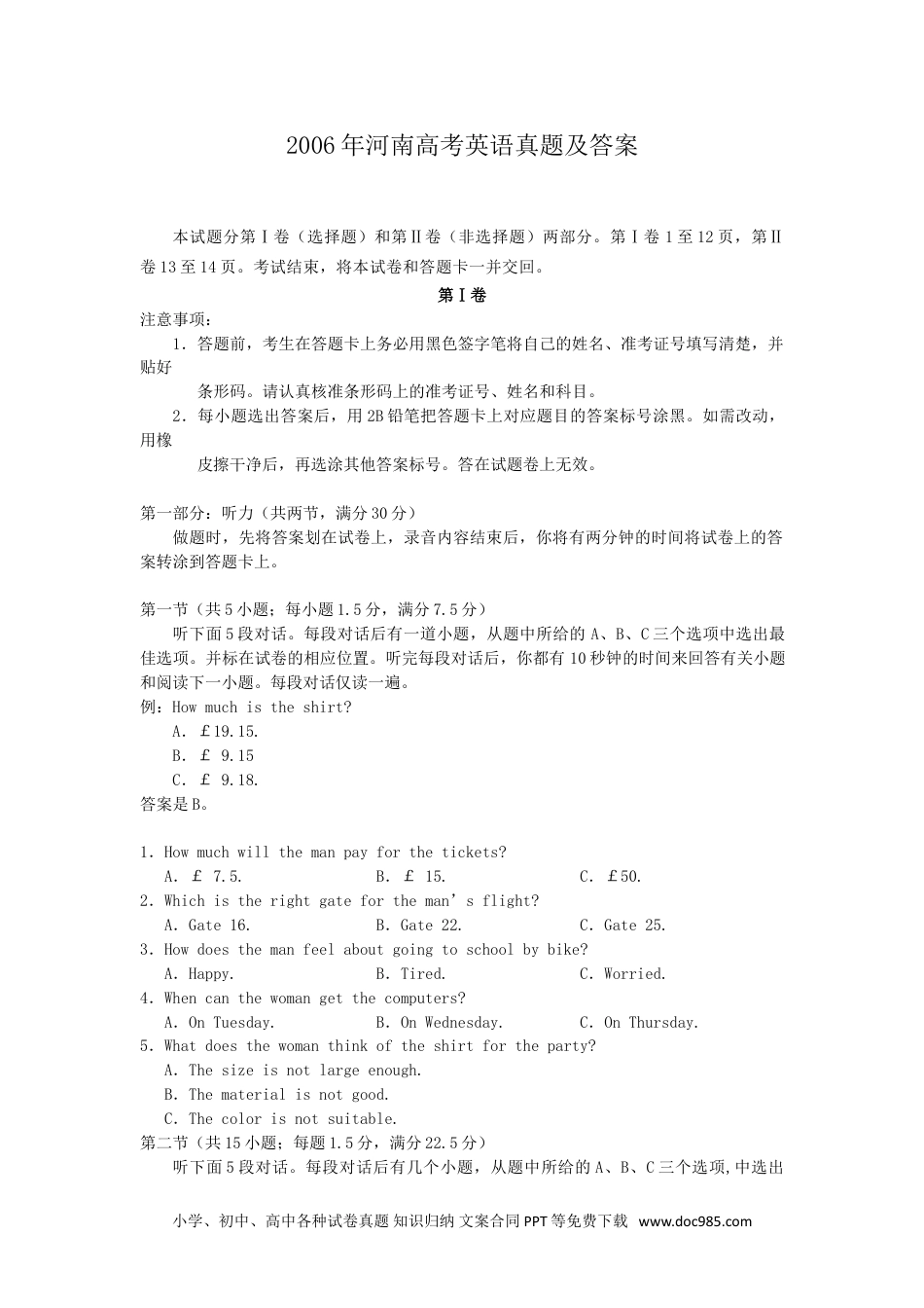2006年河南高考英语真题及答案本试题分第Ⅰ卷(选择题)和第Ⅱ卷(非选择题)两部分。第Ⅰ卷1至12页,第Ⅱ卷13至14页。考试结束,将本试卷和答题卡一并交回。第Ⅰ卷注意事项:1.答题前,考生在答题卡上务必用黑色签字笔将自己的姓名、准考证号填写清楚,并贴好条形码。请认真核准条形码上的准考证号、姓名和科目。2.每小题选出答案后,用2B铅笔把答题卡上对应题目的答案标号涂黑。如需改动,用橡皮擦干净后,再选涂其他答案标号。答在试题卷上无效。第一部分:听力(共两节,满分30分)做题时,先将答案划在试卷上,录音内容结束后,你将有两分钟的时间将试卷上的答案转涂到答题卡上。第一节(共5小题;每小题1.5分,满分7.5分)听下面5段对话。每段对话后有一道小题,从题中所给的A、B、C三个选项中选出最佳选项。并标在试卷的相应位置。听完每段对话后,你都有10秒钟的时间来回答有关小题和阅读下一小题。每段对话仅读一遍。例:Howmuchistheshirt?A.£19.15.B.£9.15C.£9.18.答案是B。1.Howmuchwillthemanpayforthetickets?A.£7.5.B.£15.C.£50.2.Whichistherightgatefortheman’sflight?A.Gate16.B.Gate22.C.Gate25.3.Howdoesthemanfeelaboutgoingtoschoolbybike?A.Happy.B.Tired.C.Worried.4.Whencanthewomangetthecomputers?A.OnTuesday.B.OnWednesday.C.OnThursday.5.Whatdoesthewomanthinkoftheshirtfortheparty?A.Thesizeisnotlargeenough.B.Thematerialisnotgood.C.Thecolorisnotsuitable.第二节(共15小题;每题1.5分,满分22.5分)听下面5段对话。每段对话后有几个小题,从题中所给的A、B、C三个选项,中选出小学、初中、高中各种试卷真题知识归纳文案合同PPT等免费下载www.doc985.com最佳选项。并标在试卷的相应位置。听每段对话,你将有时间阅读各个小题,听完后,每小题将给出5秒钟的作答时间。每段对话读两遍。听第6段材料,回答第6、7题。6.WhatcanwelearnaboutMr.Brown?A.Heisinhisoffice.B.Heisatameeting.C.Heisoutforameal.7.Whatwillthemanprobablydonext?A.Callback.B.Comeagain.C.Leaveamessage.听第7段材料,回答第8、9题。8.Whatkindofroomdoesthemanwanttotake?A.Asingleroom.B.Adoubleroom.C.Aroomforthree.9.Whatdoesthemanneedtoputintheform?A.Telephoneandstudentcardnumbers.B.Studentcardnumberandaddress.C.Addressandtelephonenumber.听第8段材料,回答第10至12题。10.Whatistherelationshipbetweenthespeakers?A.Fellowclerks.B.Bossandsecretary.C.Customerandsalesperson.11.Whatdoesthemanlikeabouthisjob?A.Livingclosetotheoffice.B.Chancestogoabroad.C.Nicepeopletoworkwith.12.Whatdoweknowaboutthewoman?A.Shelikestraveling.B.Sheisnewtothecompany.C.Sheworksinpublicrelations.听第9段材料,回答第13至16题。13.Whenwillthevisitorscome?A.InMarch.B.InApril.C.InMay.14.Howmanyvisitorsarecoming?A.8.B.10.C.12.15.Whatwillthevisitorsdoonthesecondday?A.Gotoaparty.B.Visitschools.C.Attendalecture.16.Wherewillthevisitorsgoonthefinalday?小学、初中、高中各种试卷真题知识归纳文案合同PPT等免费下载www.doc985.comA.ToLondon.B.ToScotland.C.Tothecoast.听第10段材料,回答第17至20题。17.Whatisthefirstwordthebabytriedtosay?A.Truck.B.OKC.Duck.18.Howoldwasthebabywhenhelearnedtosaythatwordcorrectly?A.About18months.B.About21months.C.About24months.19.Whatdidthefatherdowhenthebabyscreamedthatwordattheairport?A.Hecorrectedthebaby.B.Hetriedtostopthebaby.C.Hehidhimselfsomewhere.20.Whydidthemotherpretendnottoknowthebaby?A.Shegotangrywiththefather.B.Shewasfrightenedbythenoise.C.Shefeltuneasyaboutthenoisybaby.第二部分英语知识运用(共两节,满分45分)第一节:单项选择(共15小题;每小题1分,满分15分)从A、B、C、D四个选项中,选出可以填入空白处的最佳选项,并在答题卡上将该项涂黑。例:Itisg...