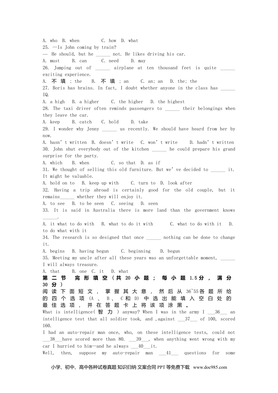2002年河南高考英语真题及答案第一卷(共115分)一、听力(共两节,满分30分)第一节(共5小题;每小题1.5分,满分7.5分)听下面五段对话。每段对话后有一小题,从题中所给的三个选项中选出最佳选项,并标在试卷的相应位置。听完每段对话后,你都有10秒钟的时间来回答有关小题和阅读下一小题。每段对话仅读一遍。例:Howmuchistheshirt?A.£19.15.B.£9.15.C.£9.18.答案是B。1.WhoisChrisPaine?A.Acomputerengineer.B.Abookseller.C.Awriter.2.Whatarethetwospeakerstalkingabout?A.Afootballplayer.B.Afootballteam.C.Afootballmatch.3.WhydidthewomanbuyaheavycoatforJimmy?A.Winteriscomingsoon.B.Jimmy’llgointothemountains.C.Jimmyhascaughtacold.4.Whereisthewoman?A.Inasoapfactory.B.Inherhouse.C.Ataninformationdesk.5.Whenisthemancheckingin?A.Friday.B.Thursday.C.Tuesday.第二节(共15小题;每小题1.5分,满分22.5分)听下面5段对话或独白。每段对话或独白后有几个小题,从题中所给的三个选项中选出最佳选项,并标在试卷的相应位置。听每段对话或独白前,你将有时间阅读各个小题,每小题5秒钟;听完后,各小题将给出5秒钟的作答时间。每段对话或独白读两遍。听第6段对话,回答第6~8题。6.HowdoesthemanfeelaboutDavid’swayofsleeping?A.It’seffective.B.It’sstrange.C.It’sthebest.7.HowmanyhoursdoesDavidsleepaday?A.Four.B.Six.C.Seven.8.Whatdoesthewomansuggestattheendofthetalk?A.PeopleshoulddevelopahabitlikeDavid’s.B.Peopleneedlongerhoursofsleep.C.Peoplehavedifferentsleepinghabits.听第7段对话,回答第9~11题。9.Whatisthewomangoingtodo?A.Attendaparty.B.Takeaholiday.C.Goonabusinesstrip.10.Whendoesthewomanplantoarrive?A.LateFriday.B.MiddaySaturday.C.Saturdaynight.11.Whatistheweatherlikeinthetownduringtheday?小学、初中、高中各种试卷真题知识归纳文案合同PPT等免费下载www.doc985.comA.Cold.B.Wet.C.Warm.听第8段对话,回答第12~13题。12.Whydoesthemanthankthewoman?A.Shehashelpedhimwithhisproblems.B.Shehasinvitedhimforcoffee.C.ShehasagreedtoseehimonMonday.13.Whendoestheconversationtakeplace?A.Beforeclass.B.Afterclass.C.Duringclass.听第9段对话,回答第14~16题。14.Whatwillthemandonextmorning?A.MeetMr.Cooper.B.VisittheNationalLab.C.MeetBillLyons.15.HowwillthemanspendhisSaturday?A.Hewilldosomepaperwork.B.Hewilltakesomerest.C.Hewillmeetsomevisitors.16.Whatdoweknowaboutthewoman?A.She’stheman’swife.B.She’sabusinessmanager.C.She’sacompanysecretary.听第10段对话,回答第17~20题。17.WhatwasthepurposeofMrs.Whinfield’svisitstoKewGardens?A.Tolearnmoreaboutplants.B.Towriteanarticleongarden.C.Tomeetthewriterssheread.18.WheredidMrs.Whinfieldlivebeforeshemovedtoherpresenthome?A.Dorset.B.Somerset.C.WestLondon.19.WheredoesMrs.Whinfieldgetmostofherplants?A.Shegrowsthemfromseeds.B.Shegetsthemfromherfriends.C.Shebuysthemfromamarket.20.Whatistheprobablerelationshipbetweenthetwospeakers?A.Touristandgardener.B.Collegeprofessorandbiologystudents.C.Newspaperreporterandgardenowner.二、英语知识运用(共两节,满分45分)第一节:单项填空(共15小题;每小题1分,满分15分)例:Itisgenerallyconsideredunwisetogiveachild______heorshewants.A.howeverB.whateverC.whicheverD.whenever答案是B。21.—I’mtakingmydrivingtesttomorrow.—______!A.CheersB.GoodluckC.ComeonD.Congratulations22.Excusemeforbreakingin.—______Ihavesomenewsforyou.A.soB.andC.butD.yet23.—Youhaven’tsaidawordaboutmynewcoat,Brenda.Doyoulikeit?—I’msorryI______anythingaboutitsooner.Icertainlythinkit’sprettyonyou.A.wasn’tsayingB.don’tsayC.won’tsayD.didn’tsay24.Themotherdidn’tknow______toblameforthebrokenglassasithappenedwhileshewasout.小学、初中...