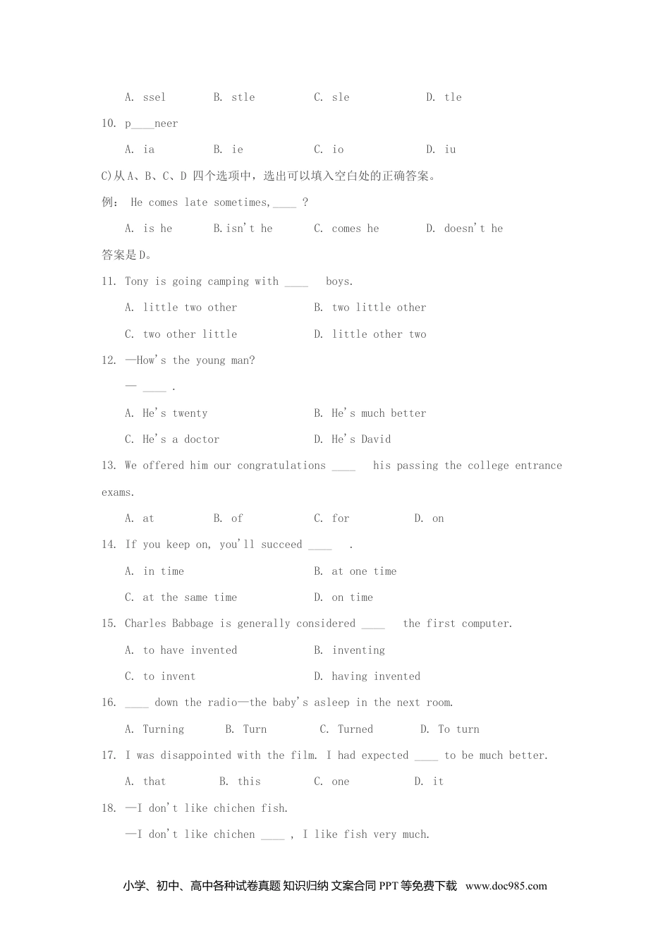 1993年河南高考英语真题及答案第一卷(三大题,共110分)Ⅰ.单项填空(共40小题,计分40)A)从A、B、C、D中找出其划线部分与所给单词的划线部分读音相同的选项。例:haveA.gaveB.saveC.hatD.made答案是C。1.townA.bowlB.shownC.pronounceD.southern2.trunkA.languageB.strangeC.thunderD.twentieth3.somethingA.breatheB.wealthC.althoughD.therefore4.breadA.breakB.weakC.sweatD.least5.biologyA.concertB.observeC.coverD.aboveB)从A、B、C、D中找出适当的字母或字母组合使以下所给单词完整与正确。例:alr____dyA.eaB.eeC.ieD.eu答案是A。6.s____v____geA.a;eB.o;aC.o;eD.a;a7.sna____A.chB.shC.tchD.che8.pr____b____blyA.o;eB.o;aC.a;eD.a;a9.whi____小学、初中、高中各种试卷真题知识归纳文案合同PPT等免费下载www.doc985.comA.sselB.stleC.sleD.tle10.p____neerA.iaB.ieC.ioD.iuC)从A、B、C、D四个选项中,选出可以填入空白处的正确答案。例:Hecomeslatesometimes,____?A.isheB.isn'theC.comesheD.doesn'the答案是D。11.Tonyisgoingcampingwith____boys.A.littletwootherB.twolittleotherC.twootherlittleD.littleothertwo12.—How'stheyoungman?—____.A.He'stwentyB.He'smuchbetterC.He'sadoctorD.He'sDavid13.Weofferedhimourcongratulations____hispassingthecollegeentranceexams.A.atB.ofC.forD.on14.Ifyoukeepon,you'llsucceed____.A.intimeB.atonetimeC.atthesametimeD.ontime15.CharlesBabbageisgenerallyconsidered____thefirstcomputer.A.tohaveinventedB.inventingC.toinventD.havinginvented16.____downtheradio—thebaby'sasleepinthenextroom.A.TurningB.TurnC.TurnedD.Toturn17.Iwasdisappointedwiththefilm.Ihadexpected____tobemuchbetter.A.thatB.thisC.oneD.it18.—Idon'tlikechichenfish.—Idon'tlikechichen____,Ilikefishverymuch.小学、初中、高中各种试卷真题知识归纳文案合同PPT等免费下载www.doc985.comA.and;andB.and;butC.or;butD.or;and19.____hesaidatthemeetingastonishedeverybodypresent.A.WhatB.ThatC.ThefactD.Thematter20.Incomepartsoftheworld,tea____withmilkandsugar.A.isservingB.isservedC.servesD.served21.—Ifhe____,he____thatfood.—Luckilyhewassenttothehospitalimmediately.A.waswarned;wouldnottakeB.hadbeenwarned;wouldnothavetakenC.wouldbewarned;hadnottakenD.wouldhavebeenwarned;hadnottaken22.Ifnoone____thephoneathome,ringmeatwork.A.returnsB.repliesC.answersD.receives23.Besuretowritetous,____?A.willyouB.aren'tyouC.canyouD.mustn'tyou24.—Howlongeachotherbeforethey____married?—Foraboutayear.A.havetheyknown;getB.didtheyknow;weregoingtogetC.dotheyknow;aregoingtogetD.hadtheyknown;got25.—Is____here?—No,BobandTimhaveaskedforleave.A.anybodyB.everybodyC.somebodyD.nobody26.Thecaptain____anapologytothepassengersforthedelaycausedbybadweather.A.madeB.saidC.putD.passed27.Peter____comewithustonight,butheisn'tverysureyet.A.mustB.canC.mayD.will小学、初中、高中各种试卷真题知识归纳文案合同PPT等免费下载www.doc985.com28.Mydictionary____.Ihavelookedforiteverywherebutstillit.A.haslost;don'tfindB.ismissing;don'tfindC.haslost;haven'tfoundD.ismissing;haven'tfound29.Iremember____thisusedtobeaquietvillage.A.whenB.howC.whereD.what30.Readerscan____quitewellwithoutknowingtheexactmeaningofeachword.A.getoverB.getinC.getalongD.getthrough31.Tomoughtnotto____meyoursecret,buthemeantnoharm.A.havetoldB.tellC.betellingD.havingtold32.—Whatwasthepartylike?—Wonderful.It'syears____Ienjoyedmyselfsomuch.A.afterB.whenC.beforeD.since33.Manypeopelarestillin____habitofwritingsillythingsin____publicplaces.A.the;theB.不填;不填C.the;不填D.不填;the34.Hedroppedthe____andbrokeit.A.cupofcoffeeB.coffee'scupC.cupforcoffeeD.coffeecup35....
