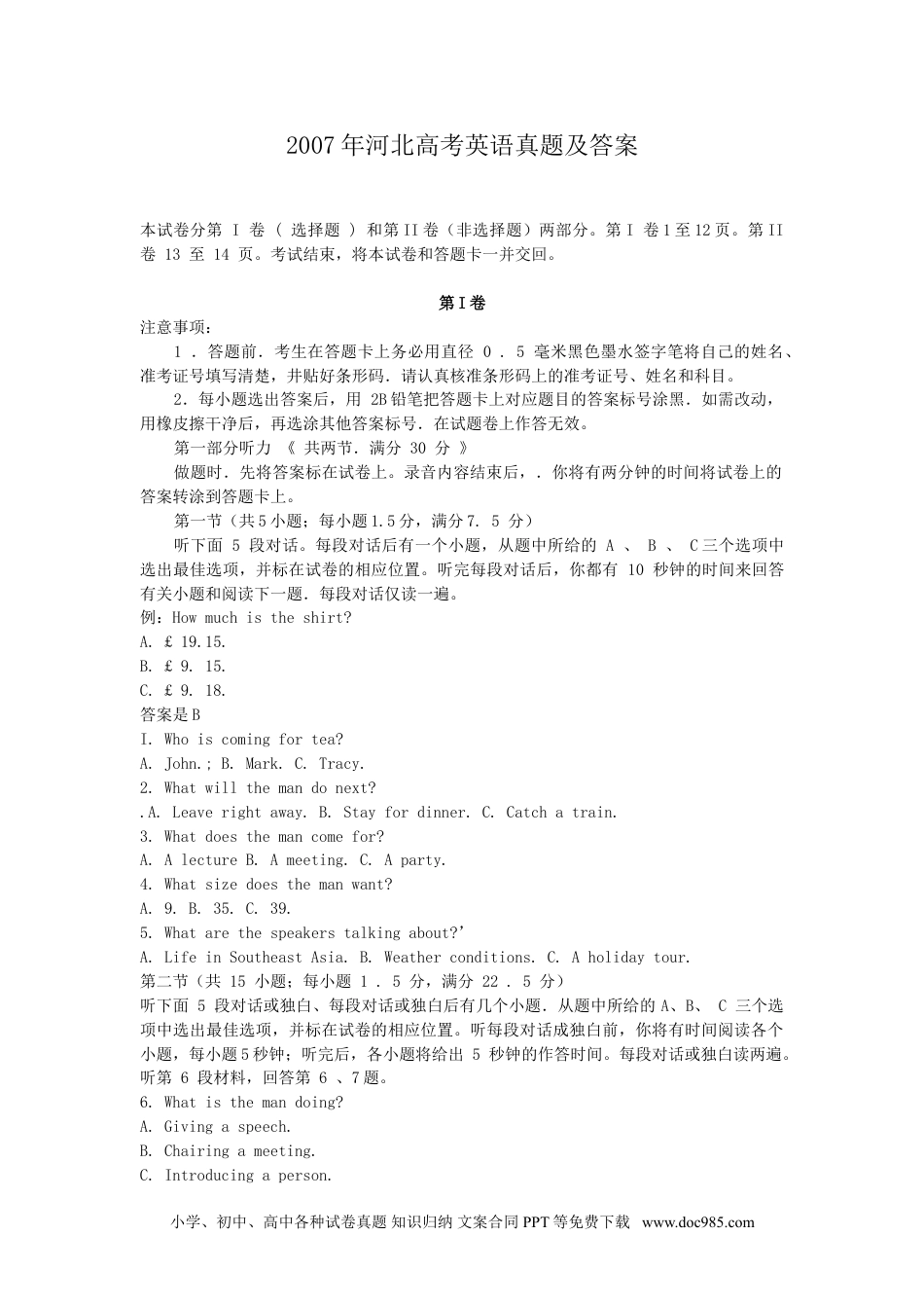 2007年河北高考英语真题及答案本试卷分第I卷(选择题)和第II卷(非选择题)两部分。第I卷1至12页。第II卷13至14页。考试结束,将本试卷和答题卡一并交回。第I卷注意事项:1.答题前.考生在答题卡上务必用直径0.5毫米黑色墨水签字笔将自己的姓名、准考证号填写清楚,井贴好条形码.请认真核准条形码上的准考证号、姓名和科目。2.每小题选出答案后,用2B铅笔把答题卡上对应题目的答案标号涂黑.如需改动,用橡皮擦干净后,再选涂其他答案标号.在试题卷上作答无效。第一部分听力《共两节.满分30分》做题时.先将答案标在试卷上。录音内容结束后,.你将有两分钟的时间将试卷上的答案转涂到答题卡上。第一节(共5小题;每小题1.5分,满分7.5分)听下面5段对话。每段对话后有一个小题,从题中所给的A、B、C三个选项中选出最佳选项,并标在试卷的相应位置。听完每段对话后,你都有10秒钟的时间来回答有关小题和阅读下一题.每段对话仅读一遍。例:Howmuchistheshirt?A.£19.15.B.£9.15.C.£9.18.答案是BI.Whoiscomingfortea?A.John.;B.Mark.C.Tracy.2.Whatwillthemandonext?.A.Leaverightaway.B.Stayfordinner.C.Catchatrain.3.Whatdoesthemancomefor?A.AlectureB.Ameeting.C.Aparty.4.Whatsizedoesthemanwant?A.9.B.35.C.39.5.Whatarethespeakerstalkingabout?’A.LifeinSoutheastAsia.B.Weatherconditions.C.Aholidaytour.第二节(共15小题;每小题1.5分,满分22.5分)听下面5段对话或独白、每段对话或独白后有几个小题.从题中所给的A、B、C三个选项中选出最佳选项,并标在试卷的相应位置。听每段对话成独白前,你将有时间阅读各个小题,每小题5秒钟;听完后,各小题将给出5秒钟的作答时间。每段对话或独白读两遍。听第6段材料,回答第6、7题。6.Whatisthemandoing?A.Givingaspeech.B.Chairingameeting.C.Introducingaperson.小学、初中、高中各种试卷真题知识归纳文案合同PPT等免费下载www.doc985.com7.Whydoesthewomansingsowell?A.Shehasagreatteacher.B.Sheteachessinging.C.Sheisyoung.听第7段材料,回答第8、9题。B.WhatisthesecondgiftforJimmy?A.Acar.B.Awatch,C.Acomputer.9.WhydoesJimmyfeelhappy?A.Heliveswithhisparents.B.He’sgotwhathedreamtof.C.He’sreceivedlotsofpresents.听第8段材料,回答第10至12题。10.Whatistherelationshipbetweenthespeaker,?A.Theyarefriends.B.Theyarestrangerstoeachother.C.Theyarehusbandandwife.11.Whydoesthewomancometotalkwiththeman?A.Togetajob.B.Totakeateat,C.Toseethesecretary.12.Whatdoesthemanmeanbysayingsorry?A.Hecan’thearthewomanclearly.B.Hedoesn’tneedadesigner.C.Hecan’thelpthewoman.听第9段材料.回答第13至16题。13.Whatdoweknowaboutthewoman?A.Shelivesclosetotheoffice.B.Sheisnewtothecompany.C.Shelikesthebigkitchen.14.Howdoesthemangotowork?A.Onfoot.B.Bybus.C.Bycar.15.WhywasSusanLateforwork?A.Shemissedthebus.B.Hertrainwaslate.C.Hercarbrokedawn.16.Whatwillthemandothenextday?A.Gotoworkbytrain.B.VisitLilyinherflat.C.Leavehomeearlier.听第10段材料,回答第17至20题。17.Whencanyoumostprobablyhearthistalk?A.InaclassoftheEnglishlanguage.B.InaclassoftheGreeklanguage.C.InaclassoftheFrenchlanguage.18.Howlongdoestheclasslast?A.11weeks.8.13weeks.C.15weeks.19.Whatis“theshort-cut”tolearningwordsaccordingtothespeaker?A.Takingmorecourses.B.Readingbasicwordsaloud.小学、初中、高中各种试卷真题知识归纳文案合同PPT等免费下载www.doc985.comC.Learninghowwordsareformed.20.Whyistheclasspopular?A.Itisnotofferedeachterm.B.It’staughtbyProfessorMorris.C.Ithelpstomastersomeusefulrules.第二部分英语知识运用(共两节.满分45分)第一节单项填空(共15小题.每小题l分.满分15分)从A、B、C、D四个选项中,选出可以填入空白处的最佳选项.并在答题卡上将该项涂黑。例:Itisgenerallyconsideredunwisetogiveachild________heorshewants.A.howeverB.whatever...