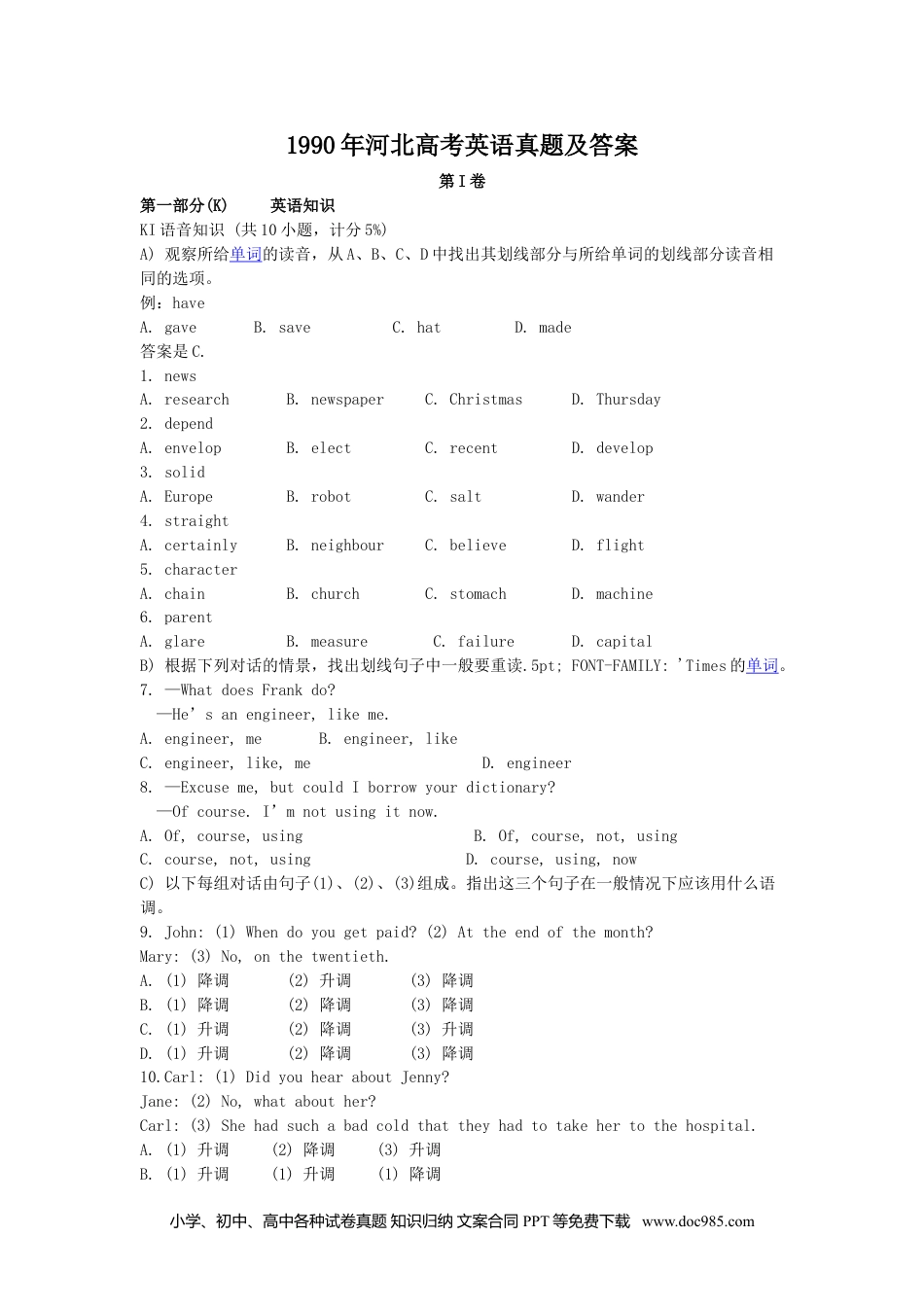 1990年河北高考英语真题及答案第I卷第一部分(K)英语知识KI语音知识(共10小题,计分5%)A)观察所给单词的读音,从A、B、C、D中找出其划线部分与所给单词的划线部分读音相同的选项。例:haveA.gaveB.saveC.hatD.made答案是C.1.newsA.researchB.newspaperC.ChristmasD.Thursday2.dependA.envelopB.electC.recentD.develop3.solidA.EuropeB.robotC.saltD.wander4.straightA.certainlyB.neighbourC.believeD.flight5.characterA.chainB.churchC.stomachD.machine6.parentA.glareB.measureC.failureD.capitalB)根据下列对话的情景,找出划线句子中一般要重读.5pt;FONT-FAMILY:'Times的单词。7.—WhatdoesFrankdo?—He’sanengineer,likeme.A.engineer,meB.engineer,likeC.engineer,like,meD.engineer8.—Excuseme,butcouldIborrowyourdictionary?—Ofcourse.I’mnotusingitnow.A.Of,course,usingB.Of,course,not,usingC.course,not,usingD.course,using,nowC)以下每组对话由句子(1)、(2)、(3)组成。指出这三个句子在一般情况下应该用什么语调。9.John:(1)Whendoyougetpaid?(2)Attheendofthemonth?Mary:(3)No,onthetwentieth.A.(1)降调(2)升调(3)降调B.(1)降调(2)降调(3)降调C.(1)升调(2)降调(3)升调D.(1)升调(2)降调(3)降调10.Carl:(1)DidyouhearaboutJenny?Jane:(2)No,whatabouther?Carl:(3)Shehadsuchabadcoldthattheyhadtotakehertothehospital.A.(1)升调(2)降调(3)升调B.(1)升调(1)升调(1)降调小学、初中、高中各种试卷真题知识归纳文案合同PPT等免费下载www.doc985.comC.(1)升调(2)降调(3)降调D.(1)降调(1)升调(1)降调KII单项填空(共30小题,计分15%)从A、B、C、D四个选项中,选出可以填入空白处的正确答案。D例:Hecomeslatesometimes,____?A.isheB.isn’theC.comesheD.doesn’the答案是D.11.Kateandhersisterwentonholidaywithacousinof_______.A.theirB.theirsC.herD.hers12.It’s_______afineday.Let’sgofishing,_______?A.won’tweB.willweC.don’tweD.shallwe13.Canyoumakesure_______thegoldring?A.whereAlicehadputB.wherehadAliceputC.whereAlicehasputD.wherehasAliceput14.—CanIhelpyou?—Well,I’mafraidtheboxis_______heavyforyou,butthankyouallthesame.A.soB.muchC.veryD.too15._______thedaywenton,theweathergotworse.A.WithB.SinceC.WhileD.As16.Thenewsecretaryissupposedtoreporttothemanagerassoonasshe_______.A.willarriveB.arrivesC.isgoingtoarriveD.isarriving17.Ifwehadfollowedhisplan,wecouldhavedonethejobbetterwith_______moneyand_______people.A.less;lessB.fewer;fewerC.less;fewerD.fewer;less18.Beyond_______stars,theastronautsawnothingbut_______space.A.the;(不填)B.(不填);theC.(不填);(不填)D.the;the19.NotuntilIbegantowork_______howmuchtimeIhadwasted.A.didn’tIrealizeB.didIrealizeC.Ididn’trealizeD.Irealized20.Alibrarywithfivethousandbooks_______tothenationasagift.A.isofferedB.hasofferedC.areofferedD.haveoffered21.Idon’tthink_______possibletomasteraforeignlanguagewithoutmuchmemorywork.A.thisB.thatC.itsD.it22.LaGstsummerItookacourseon_______.A.howtomakedressesB.howdressesbemadeC.howtobemadedressesD.howdressestobemade23.WhenIwasatcollegeI_______threeforeignlanguages,butI_______allexceptafewwordsofeach.A.spoke;hadforgottenB.spoke;haveforgottenC.hadspoken;hadforgottenD.hadspoken;haveforgotten小学、初中、高中各种试卷真题知识归纳文案合同PPT等免费下载www.doc985.com24.Hepaidtheboy$10forwashingtenwindows,mostof_______hadn’tbeencleanedforatleastayear.A.theseB.thoseC.thatD.which25.He_______youmorehelp,eventhoughhewasverybusy.A.mighthavegivenB.mightgiveC.mayhavegivenD.maygive26.Thehorriblenoisefromtheman’sroomsimply_______memad.A.putB.causedC.droveD.turned27.Tomkeptquietabouttheaccident_______losehisjob.A.sonotastoB.soasnottoC.soastonotD.not...