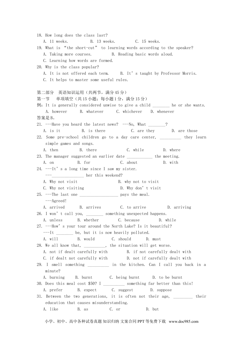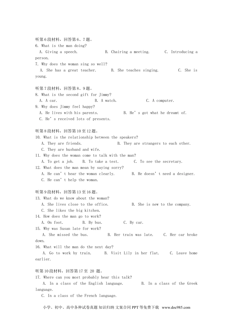 2007年海南高考英语真题及答案本试卷分第I卷(选择题)和第II卷(非选择题)两部分。第I卷1至12页。第II卷13至14页。考试结束,将本试卷和答题卡一并交回。第I卷注意事项:1.答题前,考生在答题卡上务必用直经0.5毫米黑色墨水签字笔将自己的姓名,准考证号填写清楚,并贴好条形码。请认真核准条形码上的准考证号、姓名和科目。2.每小题选出答案后,用2B铅笔把答题卡上对应题目的答案标号涂黑。如需改动,用橡皮擦干净后,再选涂其他答案标号,在试题卷上作答无效。第一部分听力(共两节,满分30分)做题时,先将答案标在试卷上。录音内容结束后,你将有两分钟的时间将试卷上答案转涂到答题卡上。第一节(共5小题;每小题1.5分,满分7.5分)听下面5段对话。每段对话后有一个小题,从题中所给的A、B、C三个选项中选出最佳选项,并标在试卷的相应位置。听完每段对话后,你都有10秒钟的时间来回答有关小题和阅读下一小题。每段对话仅读一遍。例:Howmuchistheshirt?A.£19.15.B.£9.15.C.£9.18.答案是B。1.Whoiscomingfortea?A.John.B.Mark.C.Tracy.2.Whatwillthemandonext?A.Leaverightaway.B.Stayfordinner.C.Catchatrain.3.Whatdoesthemancomefor?A.Alecture.B.Ameeting.C.Aparty.4.Whatsizedoesthemanwant?A.9.B.35.C.39.5.Whatarethespeakerstalkingabout?A.LifeinSoutheastAsia.B.Weathercondition.C.Aholidaytour.第二节(共15小题;每小题1.5分,满分22.5分)听下面5段对话或独白。每段对话或独白后有几个小题,从题中所给的A、B、C三个选项中选出最佳选项,并标在试卷的相应位置。听每段对话或独白前,你将有时间阅览室读各个小题,每小题5秒钟;听完后,各小题将给出5秒钟的作答时间。每段对话或独白读两遍。小学、初中、高中各种试卷真题知识归纳文案合同PPT等免费下载www.doc985.com听第6段材料,回答第6、7题。6.Whatisthemandoing?A.Givingaspeech.B.Chairingameeting.C.Introducingaperson.7.Whydoesthewomansingsowell?A.Shehasagreatteacher.B.Sheteachessinging.C.Sheisyoung.听第7段材料,回答第8、9题。8.WhatisthesecondgiftforJimmy?A.Acar.B.Awatch.C.Acomputer.9.WhydoesJimmyfeelhappy?A.Heliveswithhisparents.B.He’sgotwhathedreamtof.C.He’sreceivedlotsofpresents.听第8段材料,回答第10至12题。10.Whatistherelationshipbetweenthespeakers?A.Theyarefriends.B.Theyarestrangerstoeachother.C.Theyarehusbandandwife.11.Whydoesthewomancometotalkwiththeman?A.Togetajob.B.Totakeatest.C.Toseethesecretary.12.Whatdoesthemanmeanbysayingsorry?A.Hecan’thearthewomanclearly.B.Hedoesn’tneedadesigner.C.Hecan’thelpthewoman.听第9段材料,回答第13至16题。13.Whatdoweknowaboutthewoman?A.Shelivesclosetotheoffice.B.Sheisnewtothecompany.C.Shelikesthebigkitchen.14.Howdoesthemangotowork?A.Onfoot.B.Bybus.C.Bycar.15.WhywasSusanlateforwork?A.Shemissedthebus.B.Hertrainwaslate.C.Hercarbrokedown.16.Whatwillthemandothenextday?A.Gotoworkbytrain.B.VisitLilyinherflat.C.Leavehomeearlier.听第10段材料,回答第17至20题。17.Wherecanyoumostprobablyhearthistalk?A.InaclassoftheEnglishlanguage.B.InaclassoftheGreeklanguage.C.InaclassoftheFrenchlanguage.小学、初中、高中各种试卷真题知识归纳文案合同PPT等免费下载www.doc985.com18.Howlongdoestheclasslast?A.11weeks.B.13weeks.C.15weeks.19.Whatis“theshort-cut”tolearningwordsaccordingtothespeaker?A.Takingmorecourses.B.Readingbasicwordsaloud.C.Learninghowwordsareformed.20.Whyistheclasspopular?A.Itisnotofferedeachterm.B.It’staughtbyProfessorMorris.C.Ithelpstomastersomeusefulrules.第二部分英语知识运用(共两节,满分45分)第一节单项填空(共15小题;每小题1分,满分15分)例:Itisgenerallyconsideredunwisetogiveachild________heorshewants.A.howeverB.whateverC.whicheverD.whenever答案是B。21.---Haveyouheardthelatestnews?---No,What___...