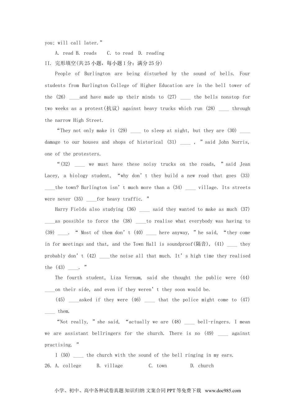 1999年海南高考英语真题及答案I.单项填空(共25小题,每小题1分;满分25分)1.spareA.fearB.earnC.pearD.beard2.navyA.neighborB.nationalityC.relativeD.valley3.unitA.fierceB.nephewC.juiceD.sure4.gentleA.organizeB.bargainC.regularD.charge5.journeyA.merchantB.courtyardC.energyD.serious6.—Ihadareallygoodweekendatmyuncle’s.—____.A.Oh,that’sveryniceofyouB.CongratulationsC.It’sapleasureD.Oh,I’mgladtohearthat7.—I’mgoingtothepostoffice.—____you’rethere,canyougetmesomestamps?A.AsB.WhileC.BecauseD.If8.Papermoneywasin____useinChinawhenMarcoPolovisitedthecountryin____thirteenthcentury.A.the;不填B.the;theC.不填;theD.不填;不填9.—Arethenewrulesworking?—Yes.____booksarestolen.A.FewB.MoreC.SomeD.None10.—Alice,youfeedthebirdtoday,____?—ButIfedityesterday.A.doyouB.willyouC.didn’tyouD.don’tyou11.____you’vegotachance,youmightaswellmakefulluseofit.A.NowthatB.AfterC.AlthoughD.Assoonas12.____himandthentrytocopywhathedoes.A.MindB.GlanceatC.StareatD.Watch13.—IdrovetoZhuhaifortheairshowlastweek.—Isthat____youhadafewdaysoff?A.whyB.whenC.whatD.where小学、初中、高中各种试卷真题知识归纳文案合同PPT等免费下载www.doc985.com14.Robertissaid____abroad,butIdon’tknowwhatcountryhestudiedin.A.tohavestudiedB.tostudyC.tobestudyingD.tohavebeenstudying15.—Willyoustayforlunch?—Sorry,____.Mybrotheriscomingtoseeme.A.Imustn’tB.Ican’tC.Ineedn’tD.Iwon’t16.Theprice____,butIdoubtwhetheritwillremainso.A.wentdownB.willgodownC.hasgonedownD.wasgoingdown17.Fewpleasurescanequal____ofacooldrinkonahotday.A.someB.anyC.thatD.those18.Youshouldmakeitaruletoleavethings____youcanfindthemagain.A.WhenB.whereC.thenD.there19.CarolsaidtheworkwouldbedonebyOctober,____personallyIdoubtverymuch.A.itB.thatC.whenD.which20.—DoyouthinktheStarswillbeattheBulls?—Yes.Theyhavebetterplayers,soI____themtowin.A.hopeB.preferC.expectD.want21.Thepurposeofnewtechnologiesistomakelifeeasier,____itmoredifficult.A.notmakeB.nottomakeC.notmakingD.donotmake22.We’llhavetofinishthejob,____.A.longittakeshoweverB.ittakeshoweverlongC.longhoweverittakesD.howeverlongittakes23.Yourperformanceinthedrivingtestdidn’treachtherequiredstandard—____,youfailed.A.intheendB.afterallC.inotherwordsD.atthesametime24.—Hey,lookwhereyouaregoing!—Oh,I’mterriblysorry.____.A.I’mnotnoticingB.Iwasn’tnoticingC.Ihaven’tnoticeD.Idon’tnotice25.WhenIgotbackhomeIsawamessagepinnedtothedoor____“Sorrytomiss小学、初中、高中各种试卷真题知识归纳文案合同PPT等免费下载www.doc985.comyou;willcalllater.”A.readB.readsC.toreadD.readingII.完形填空(共25小题,每小题1分;满分25分)PeopleofBurlingtonarebeingdisturbedbythesoundofbells.FourstudentsfromBurlingtonCollegeofHigherEducationareinthebelltowerofthe(26)____andhavemadeuptheirmindsto(27)____thebellsnonstopfortwoweeksasaprotest(抗议)againstheavytruckswhichrun(28)____throughthenarrowHighStreet.“Theynotonlymakeit(29)____tosleepatnight,buttheyare(30)____damagetoourhousesandshopsofhistorical(31)____,”saidJohnNorris,oneoftheprotesters.“(32)____wemusthavethesenoisytrucksontheroads,”saidJeanLacey,abiologystudent,“whydon’ttheybuildanewroadthatgoes(33)____thetown?Burlingtonisn’tmuchmorethana(34)____village.Itsstreetswerenever(35)____forheavytraffic.”HarryFieldsalsostudying(36)____saidtheywantedtomakeasmuch(37)____aspossibletoforcethe(38)____torealisewhateverybodywashavingto(39)____.“Mostofthemdon’t(40)____hereanyway,”hesaid,“theyc...