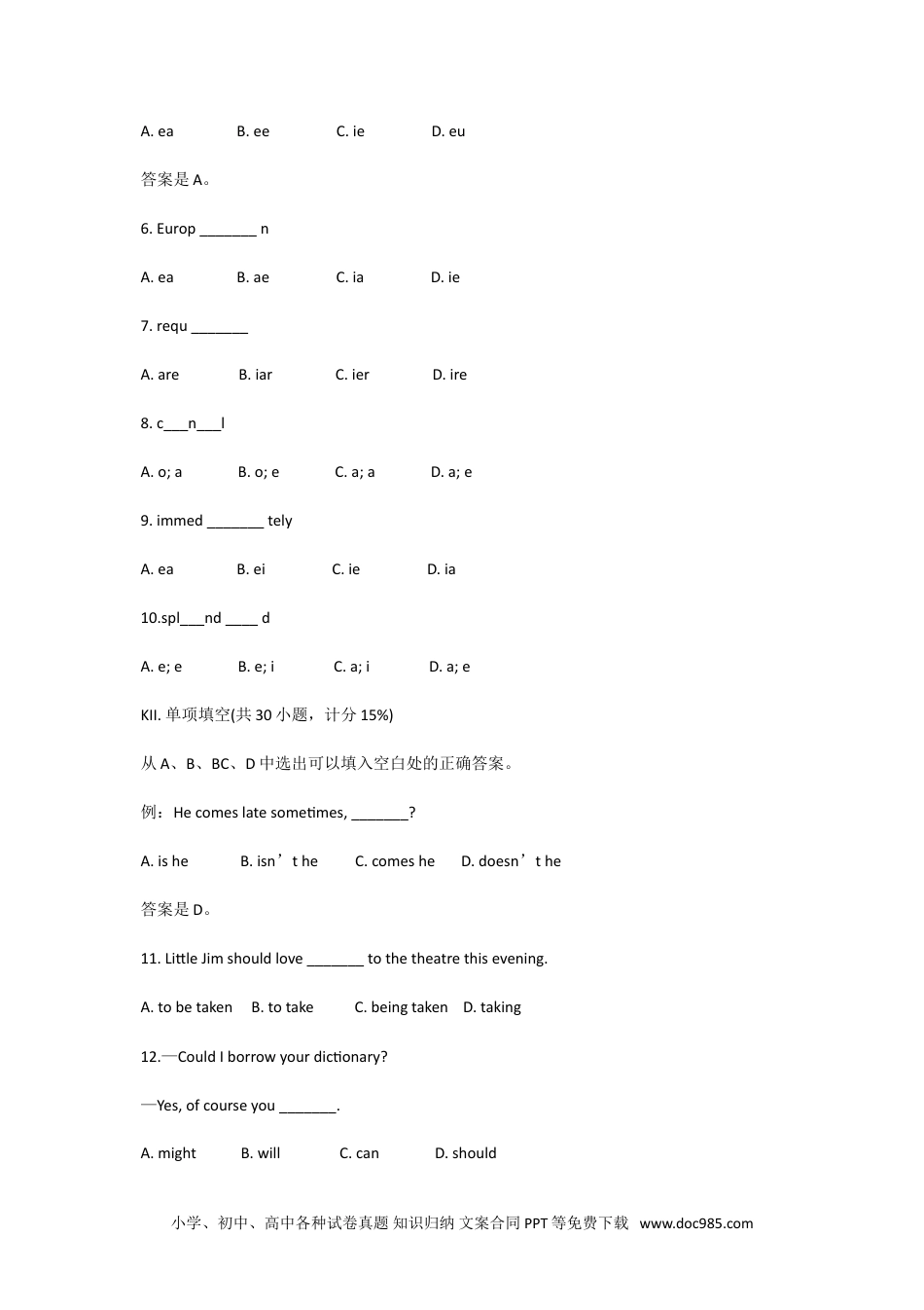1992年海南高考英语真题及答案第I卷(三部分,共85分)第一部分(K)英语知识KI.语音和拼写知识(共10小题,计分5%)A)从A、B、C、D中找出其划线部分与所给单词的划线部分读音相同的选项。例:havegaveB.saveC.hatD.made答案是C。1.dangerousA.CanadianB.JanuaryC.balanceD.advanced2.frequentlyA.presidentB.freshC.feverD.electric3.researchA.surfaceB.tearC.surroundD.disappear4.cousinA.thirstyB.resistC.anxiousD.universe5.exactA.expertB.exhibitionC.exerciseD.existB)以下所给单词均不完整,从A、B、SIZE:10.5pt;FONT-C、D中选出适当的字母或字母组合,使其完整与正确。例:alr_______dy小学、初中、高中各种试卷真题知识归纳文案合同PPT等免费下载www.doc985.comA.eaB.eeC.ieD.eu答案是A。6.Europ_______nA.eaB.aeC.iaD.ie7.requ_______A.areB.iarC.ierD.ire8.c___n___lA.o;aB.o;eC.a;aD.a;e9.immed_______telyA.eaB.eiC.ieD.ia10.spl___nd____dA.e;eB.e;iC.a;iD.a;eKII.单项填空(共30小题,计分15%)从A、B、BC、D中选出可以填入空白处的正确答案。例:Hecomeslatesometimes,_______?A.isheB.isn’theC.comesheD.doesn’the答案是D。11.LittleJimshouldlove_______tothetheatrethisevening.A.tobetakenB.totakeC.beingtakenD.taking12.—CouldIborrowyourdictionary?—Yes,ofcourseyou_______.A.mightB.willC.canD.should小学、初中、高中各种试卷真题知识归纳文案合同PPT等免费下载www.doc985.com13.—Shallwegoskatingorstayathome?—Which_______doyourself?A.doyouratherB.wouldyouratherC.willyouratherD.shouldyourather14.—Iusuallygotherebytrain.—Whynot_______byboatforachange?A.totrygoingB.tryingtogoC.totryandgoD.trygoing15.—Hello.MayIspeaktoZhaoHua?—Yes._______.A.Myname’sZhaoHuaB.I’mZhaoHuaC.ThisisZhaoHuaspeakingD.ZhaoHua’sme16.WhenJackarrivedhelearnedMary_______foralmostanhour.A.hadgoneB.hadsetoffC.hadleftD.hadbeenaway17.Ireallydon’twanttogototheparty,butIdon’tseehowIcan_______it.A.getbackfromB.getoutofC.getawayD.getoff18.Iwouldappreciate_______backthisafternoon.A.youtocallB.youcallC.yourcallingD.you’recalling19.—Haveaniceweekend!A.ThesametoyouB.YoudotooC.ThesameasyouD.Youhaveittoo20.Thedoctorwillbefree_______.A.10minuteslaterB.after10minutesC.in10minutesD.10minutesafter21.How_______canyoufinishthedrawing?小学、初中、高中各种试卷真题知识归纳文案合同PPT等免费下载www.doc985.comA.oftenB.soonC.longD.rapid.soon&nbs22.—Doyouknowourtownatall?—No,thisisthefirsttimeI_______here.A.wasB.havebeenC.cameD.amcoming23.MrZhanggavethetextbookstoallthepupilsexcept_______whohadalreadytakenthem.A.theonesB.onesC.someD.theothers24._______terribleweatherwe’vebeenhavingthesedays!A.HowaB.WhataC.HowD.What25.There’resomanykindsoftape-recordersonsalethatIcan’tmakeupmymind_______tobuy.A.whatB.which&nbFONsp;C.howD.where26.-Wecouldhavewalkedtothestation;itwassonear.Yes.Ataxi_______atallnecessary.A.wasn’tB.hadn’tbeenC.wouldn’tbeD.won’tbe27.Inthedarkstreet,therewasn’tasingleperson_______shecouldturnforhelp.A.thatB.whoC.fromwhomD.towhom28.Whichis_______country,CanadaorAustralia?A.alargeB.largerC.alargerD.thelarger29.Shortlyaftertheaccident,two_______policeweresenttothespottokeeporder.A.dozenofB.dozensC.dozenD.dozensof30.Itwasnot_______shetookoffherdarkglasses_______Irealizedshewasafamousfilmstar.A.when;thatB.until;thatC.until;whenD.when;then小学、初中、高中各种试卷真题知识归纳文案合同PPT等免费下载www.doc985.com31.Ifcitynoises_______fromincreasing,people_______shouttobeheardevenatthedinnertable20yearsfromnow.A.arenotkept;willhavetoB.arenotkept;havetoC.donotkeep;willhavetoD.donotkeep;haveto32...