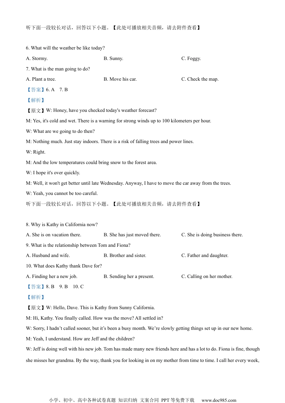 小学、初中、高中各种试卷真题知识归纳文案合同PPT等免费下载www.doc985.com2024年普通高等学校招生全国统一考试(新课标Ⅰ卷)英语姓名________________准考证号________________全卷共12页,满分150分,考试时间120分钟。考生注意:1.答题前,请务必将自己的姓名、准考证号用黑色字迹的签字笔或钢笔分别填写在试题卷和答题纸规定的位置上。2.答题时,请按照答题纸上“注意事项”的要求,在答题纸相应的位置上规范作答,在本试题卷上的作答一律无效。第一部分听力(共两节,满分30分)做题时,先将答案标在试卷上。录音内容结束后,你将有两分钟的时间将试卷上的答案转涂到答题纸上。第一节(共5小题;每小题1.5分,满分7.5分)听下面5段对话。每段对话后有一个小题,从题中所给的A、B、C三个选项中选出最佳选项。听完每段对话后,你都有10秒钟的时间来回答有关小题和阅读下一小题。每段对话仅读一遍。例:Howmuchistheshirt?A.£19.15.B.£9.18.C.£9.15.答案是C。1.【此处可播放相关音频,请去附件查看】WhatisKatedoing?A.Boardingaflight.B.Arrangingatrip.C.Seeingafriendoff.【答案】C【解析】【原文】M:Thanksforthewonderfulweekend,Kate.W:That'sokay.BobandIaregladyoucametoseeus.M:Oh,Ihavetogoin.Myflightwilltakeoffsoon.Docontactmewhenyou'reinSydney.W:Sure,wewill.2.【此处可播放相关音频,请去附件查看】Whatarethespeakerstalkingabout?A.Apopstar.B.Anoldsong.C.Aradioprogram.小学、初中、高中各种试卷真题知识归纳文案合同PPT等免费下载www.doc985.com【答案】B【解析】【原文】W:Paul,listentotheradio.It'sYou'veStolenMyHeart,oneofthesongsplayedatourwedding.M:Yeah,howbeautiful!It'sbeenpopularforalmosttwodecades.3.【此处可播放相关音频,请去附件查看】Whatwillthespeakersdotoday?A.Gotoanartshow.B.Meettheman'saunt.C.EatoutwithMark.【答案】A【解析】【原文】W:David,forgetaboutMark.Hisauntisintown,sohecan'tgowithustoday.M:Oh,whatapity!It'sthelastdayoftheartshow.4.【此处可播放相关音频,请去附件查看】Whatdoesthemanwanttodo?A.Cancelanorder.B.Askforareceipt.C.Rescheduleadelivery.【答案】C【解析】【原文】W:HowmayIhelpyou?M:IboughtadeskandaskedforittobedeliveredtomyhousethisFriday.W:Yes,what’stheproblem?M:IneedtohaveitdeliveredthisSaturday.5.【此处可播放相关音频,请去附件查看】WhenwillthenexttraintoBedfordleave?A.At9:45.B.At10:15.C.At11:00.【答案】A【解析】【原文】W:Next,please.M:Oh,hi,Imissedmy9o'clocktraintoBedford.DoIhavetobuyanotherticket?W:No.ThenexttrainleavesataquartertotenatPlatform11.M:Thankyou.第二节(共15小题;每小题1.5分,满分22.5分)听下面5段对话或独白。每段对话或独白后有几个小题,从题中所给的A、B、C三个选项中选出最佳选项。听每段对话或独白前,你将有时间阅读各个小题,每小题5秒钟;听完后,各小题将给出5秒钟的作答时间。每段对话或独白读两遍。小学、初中、高中各种试卷真题知识归纳文案合同PPT等免费下载www.doc985.com听下面一段较长对话,回答以下小题。【此处可播放相关音频,请去附件查看】6.Whatwilltheweatherbeliketoday?A.Stormy.B.Sunny.C.Foggy.7.Whatisthemangoingtodo?A.Plantatree.B.Movehiscar.C.Checkthemap.【答案】6.A7.B【解析】【原文】W:Honey,haveyoucheckedtoday'sweatherforecast?M:Yes,it'scoldandwet.Thereisawarningforstrongwindsupto100kilometersperhour.W:Whatarewegoingtodothen?M:Nothingmuch.Juststayindoors.Thereisariskoffallingtreesandpowerlines.W:Right.M:Andthelowtemperaturescouldbringsnowtotheforestarea.W:Ihopeit'soverquickly.M:Well,itwon'tgetbetteruntillateWednesday.Anyway,Ihavetomovethecarawayfromthetrees.W:Yeah,youcannotbetoocareful.听下面一段较长对话,回答以下小题。【此处可播放相关音频,请去附件查看】8.WhyisKathyinCalifornianow?A.Sheisonvacationthere.B.Shehasjustmovedthe...
