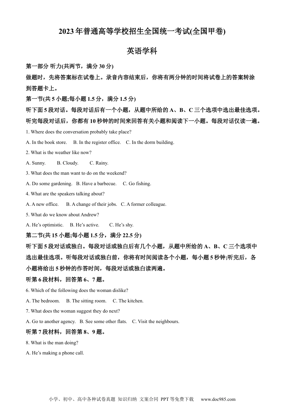 小学、初中、高中各种试卷真题知识归纳文案合同PPT等免费下载www.doc985.com2023年普通高等学校招生全国统一考试(全国甲卷)英语学科第一部分听力(共两节,满分30分)做题时,先将答案标在试卷上。录音内容结束后,你将有两分钟的时间将试卷上的答案转涂到答题卡上。第一节(共5小题;每小题1.5分,满分1.5分)听下面5段对话。每段对话后有一个小题,从题中所给的A、B、C三个选项中选出最佳选项。听完每段对话后,你都有10秒钟的时间来回答有关小题和阅读下一小题。每段对话仅读一遍。1.Wheredoestheconversationprobablytakeplace?A.Inthebookstore.B.Intheregisteroffice.C.Inthedormbuilding.2.Whatistheweatherlikenow?A.Sunny.B.Cloudy.C.Rainy.3.Whatdoesthemanwanttodoontheweekend?A.Dosomegardening.B.Haveabarbecue.C.Gofishing.4.Whatarethespeakerstalkingabout?A.Anewoffice.B.Achangeoftheirjobs.C.Aformercolleague.5.WhatdoweknowaboutAndrew?A.He’soptimistic.B.He’sactive.C.He’sshy.第二节(共15小题;每小题1.5分,满分22.5分)听下面5段对话或独白。每段对话或独白后有几个小题,从题中所给的A、B、C三个选项中选出最佳选项。听每段对话或独白前,你将有时间阅读各个小题,每小题5秒钟;听完后,各小题将给出5秒钟的作答时间,每段对话或独白读两遍。听第6段材料,回答第6、7题。6.Whichofthefollowingdoesthewomandislike?A.Thebedroom.B.Thesittingroom.C.Thekitchen.7.Whatdoesthewomansuggesttheydonext?A.Gotoanotheragency.B.Seesomeotherflats.C.Visittheneighbours.听第7段材料,回答第8、9题。8.Whatisthemandoing?A.He’smakingaphonecall.小学、初中、高中各种试卷真题知识归纳文案合同PPT等免费下载www.doc985.comB.He’schairingameeting.C.He’shostingaprogram.9.WhatmakesMrs.JohnsonworriedaboutherdaughterinAfrica?A.Lackofmedicalsupport.B.Inconvenienceofcommunication.C.Poortransportationsystem.听第8段材料,回答第10至12题。10.Whatpositiondoesthemanapplyfor?A.Asalesperson.B.Anengineer.C.Anaccountant.11.Whichaspectofthecompanyappealstotheman?A.Thecompanyculture.B.Thefreeaccommodations.C.Thecompetitivepay.12.Whatisdifficultforthemantodealwith?A.Interpersonalrelationships.B.Quality-quantitybalance.C.Unplannedhappenings.听第9段材料,回答第13至16题。13.HowdoesRobertsoundwhenspeakingofhisbeingawriter?A.Hopeful.B.Grateful.C.Doubtful.14.WhatwasRobertlikebeforehewas9yearsold?A.Hehadwildimagination.B.Heenjoyedsports.C.Helovedscience.15.WhatdidRobert’sfatherdo?A.Ateacher.B.Acoach.C.Alibrarian.16.WhathelpedRobertbecomeawriter?A.Writingdaily.B.Listeningtostories.C.Readingextensively.听第10段材料,回答第17至20题。17.WherewasOpenTchaikovskyCompetitionheldin1986?A.InMoscow.B.InChelyabinsk.C.InBerlin.18.WhatdoesMaximsayaboutthecompetitionheattendedat10?A.Itinspiredmanyyoungmusicians.B.Itwasthemusiceventofhisdreams.C.Itwasalife-changingexperience.19.Whichkindofmusicaretheyoungplayersrequiredtoplay?A.Rockmusic.B.Popmusic.C.Classicalmusic.20.WhatdoesMaximvaluemostinyoungplayers’performance?A.Expressiveness.B.Smoothness.C.Completeness.小学、初中、高中各种试卷真题知识归纳文案合同PPT等免费下载www.doc985.com第二部分阅读理解(共两节,满分40分)第一节(共15小题:每小题2分,满分30分)阅读下列短文,从每题所给的A、B、C和D四个选项中,选出最佳选项。AWheretoEatinBangkokBangkokisahighlydesirabledestinationforfoodlovers.Ithasaseeminglybottomlesswellofdiningoptions.HerearesomesuggestionsonwheretostartyourBangkokeatingadventure.NahmOfferingThaifinedining.NahmprovidesthebestofBangkokculinary(烹饪的)experiences.It’stheonlyThairestaurantthatranksamongthetop10oftheword’s50bestrestaurantslist.HeadChefDavidThompson,whore...