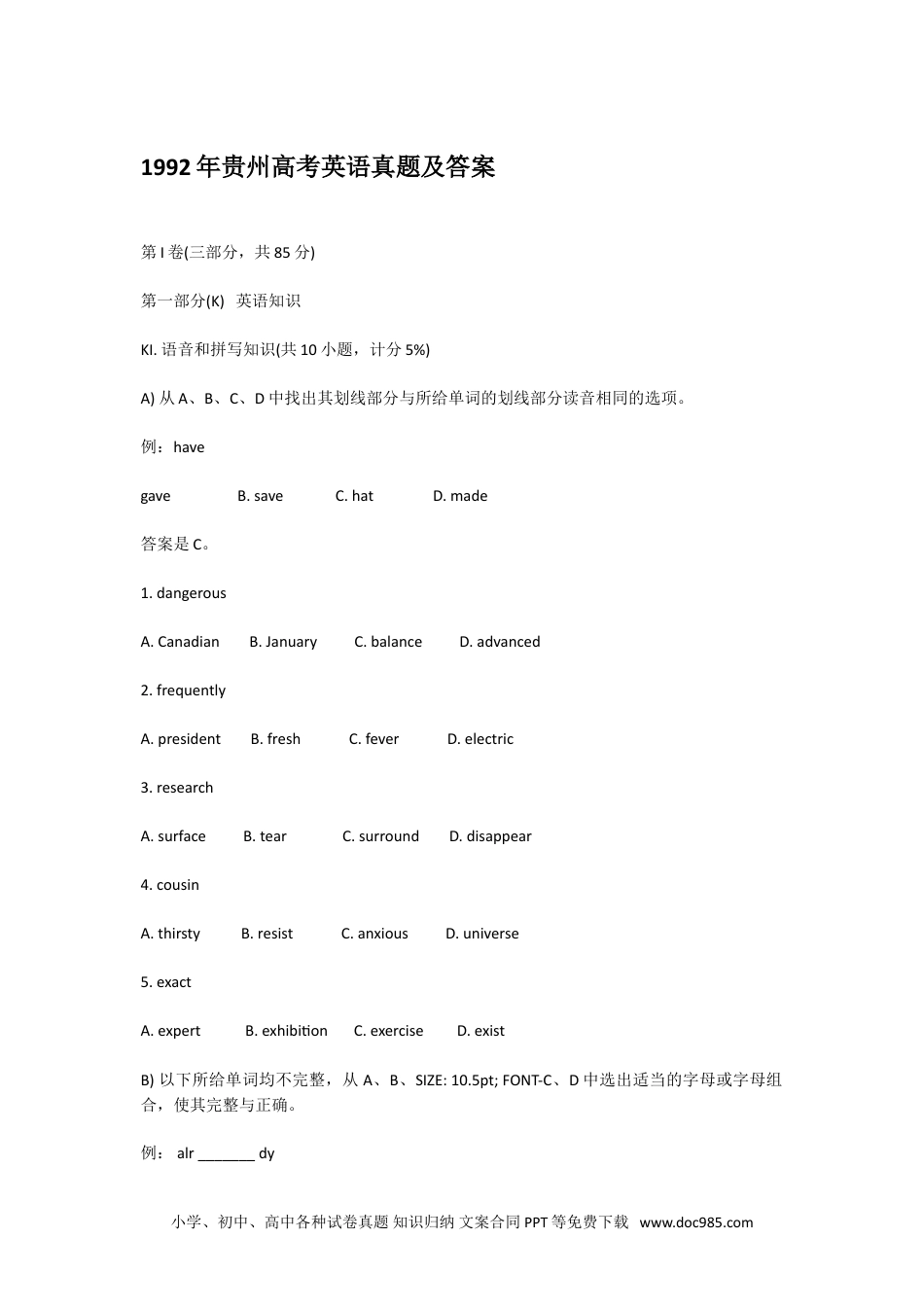 1992年贵州高考英语真题及答案第I卷(三部分,共85分)第一部分(K)英语知识KI.语音和拼写知识(共10小题,计分5%)A)从A、B、C、D中找出其划线部分与所给单词的划线部分读音相同的选项。例:havegaveB.saveC.hatD.made答案是C。1.dangerousA.CanadianB.JanuaryC.balanceD.advanced2.frequentlyA.presidentB.freshC.feverD.electric3.researchA.surfaceB.tearC.surroundD.disappear4.cousinA.thirstyB.resistC.anxiousD.universe5.exactA.expertB.exhibitionC.exerciseD.existB)以下所给单词均不完整,从A、B、SIZE:10.5pt;FONT-C、D中选出适当的字母或字母组合,使其完整与正确。例:alr_______dy小学、初中、高中各种试卷真题知识归纳文案合同PPT等免费下载www.doc985.comA.eaB.eeC.ieD.eu答案是A。6.Europ_______nA.eaB.aeC.iaD.ie7.requ_______A.areB.iarC.ierD.ire8.c___n___lA.o;aB.o;eC.a;aD.a;e9.immed_______telyA.eaB.eiC.ieD.ia10.spl___nd____dA.e;eB.e;iC.a;iD.a;eKII.单项填空(共30小题,计分15%)从A、B、BC、D中选出可以填入空白处的正确答案。例:Hecomeslatesometimes,_______?A.isheB.isn’theC.comesheD.doesn’the答案是D。11.LittleJimshouldlove_______tothetheatrethisevening.A.tobetakenB.totakeC.beingtakenD.taking12.—CouldIborrowyourdictionary?—Yes,ofcourseyou_______.A.mightB.willC.canD.should小学、初中、高中各种试卷真题知识归纳文案合同PPT等免费下载www.doc985.com13.—Shallwegoskatingorstayathome?—Which_______doyourself?A.doyouratherB.wouldyouratherC.willyouratherD.shouldyourather14.—Iusuallygotherebytrain.—Whynot_______byboatforachange?A.totrygoingB.tryingtogoC.totryandgoD.trygoing15.—Hello.MayIspeaktoZhaoHua?—Yes._______.A.Myname’sZhaoHuaB.I’mZhaoHuaC.ThisisZhaoHuaspeakingD.ZhaoHua’sme16.WhenJackarrivedhelearnedMary_______foralmostanhour.A.hadgoneB.hadsetoffC.hadleftD.hadbeenaway17.Ireallydon’twanttogototheparty,butIdon’tseehowIcan_______it.A.getbackfromB.getoutofC.getawayD.getoff18.Iwouldappreciate_______backthisafternoon.A.youtocallB.youcallC.yourcallingD.you’recalling19.—Haveaniceweekend!A.ThesametoyouB.YoudotooC.ThesameasyouD.Youhaveittoo20.Thedoctorwillbefree_______.A.10minuteslaterB.after10minutesC.in10minutesD.10minutesafter21.How_______canyoufinishthedrawing?小学、初中、高中各种试卷真题知识归纳文案合同PPT等免费下载www.doc985.comA.oftenB.soonC.longD.rapid.soon&nbs22.—Doyouknowourtownatall?—No,thisisthefirsttimeI_______here.A.wasB.havebeenC.cameD.amcoming23.MrZhanggavethetextbookstoallthepupilsexcept_______whohadalreadytakenthem.A.theonesB.onesC.someD.theothers24._______terribleweatherwe’vebeenhavingthesedays!A.HowaB.WhataC.HowD.What25.There’resomanykindsoftape-recordersonsalethatIcan’tmakeupmymind_______tobuy.A.whatB.which&nbFONsp;C.howD.where26.-Wecouldhavewalkedtothestation;itwassonear.Yes.Ataxi_______atallnecessary.A.wasn’tB.hadn’tbeenC.wouldn’tbeD.won’tbe27.Inthedarkstreet,therewasn’tasingleperson_______shecouldturnforhelp.A.thatB.whoC.fromwhomD.towhom28.Whichis_______country,CanadaorAustralia?A.alargeB.largerC.alargerD.thelarger29.Shortlyaftertheaccident,two_______policeweresenttothespottokeeporder.A.dozenofB.dozensC.dozenD.dozensof30.Itwasnot_______shetookoffherdarkglasses_______Irealizedshewasafamousfilmstar.A.when;thatB.until;thatC.until;whenD.when;then小学、初中、高中各种试卷真题知识归纳文案合同PPT等免费下载www.doc985.com31.Ifcitynoises_______fromincreasing,people_______shouttobeheardevenatthedinnertable20yearsfromnow.A.arenotkept;willhavetoB.arenotkept;havetoC.donotkeep;willhavetoD.donotkeep;haveto32...