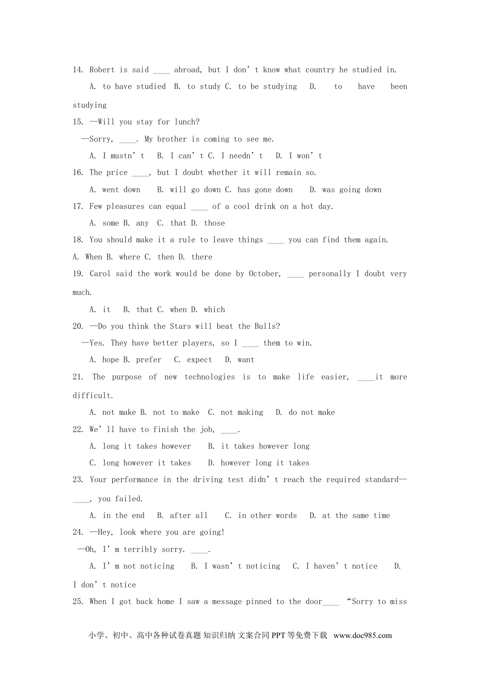 1999年广西高考英语真题及答案I.单项填空(共25小题,每小题1分;满分25分)1.spareA.fearB.earnC.pearD.beard2.navyA.neighborB.nationalityC.relativeD.valley3.unitA.fierceB.nephewC.juiceD.sure4.gentleA.organizeB.bargainC.regularD.charge5.journeyA.merchantB.courtyardC.energyD.serious6.—Ihadareallygoodweekendatmyuncle’s.—____.A.Oh,that’sveryniceofyouB.CongratulationsC.It’sapleasureD.Oh,I’mgladtohearthat7.—I’mgoingtothepostoffice.—____you’rethere,canyougetmesomestamps?A.AsB.WhileC.BecauseD.If8.Papermoneywasin____useinChinawhenMarcoPolovisitedthecountryin____thirteenthcentury.A.the;不填B.the;theC.不填;theD.不填;不填9.—Arethenewrulesworking?—Yes.____booksarestolen.A.FewB.MoreC.SomeD.None10.—Alice,youfeedthebirdtoday,____?—ButIfedityesterday.A.doyouB.willyouC.didn’tyouD.don’tyou11.____you’vegotachance,youmightaswellmakefulluseofit.A.NowthatB.AfterC.AlthoughD.Assoonas12.____himandthentrytocopywhathedoes.A.MindB.GlanceatC.StareatD.Watch13.—IdrovetoZhuhaifortheairshowlastweek.—Isthat____youhadafewdaysoff?A.whyB.whenC.whatD.where小学、初中、高中各种试卷真题知识归纳文案合同PPT等免费下载www.doc985.com14.Robertissaid____abroad,butIdon’tknowwhatcountryhestudiedin.A.tohavestudiedB.tostudyC.tobestudyingD.tohavebeenstudying15.—Willyoustayforlunch?—Sorry,____.Mybrotheriscomingtoseeme.A.Imustn’tB.Ican’tC.Ineedn’tD.Iwon’t16.Theprice____,butIdoubtwhetheritwillremainso.A.wentdownB.willgodownC.hasgonedownD.wasgoingdown17.Fewpleasurescanequal____ofacooldrinkonahotday.A.someB.anyC.thatD.those18.Youshouldmakeitaruletoleavethings____youcanfindthemagain.A.WhenB.whereC.thenD.there19.CarolsaidtheworkwouldbedonebyOctober,____personallyIdoubtverymuch.A.itB.thatC.whenD.which20.—DoyouthinktheStarswillbeattheBulls?—Yes.Theyhavebetterplayers,soI____themtowin.A.hopeB.preferC.expectD.want21.Thepurposeofnewtechnologiesistomakelifeeasier,____itmoredifficult.A.notmakeB.nottomakeC.notmakingD.donotmake22.We’llhavetofinishthejob,____.A.longittakeshoweverB.ittakeshoweverlongC.longhoweverittakesD.howeverlongittakes23.Yourperformanceinthedrivingtestdidn’treachtherequiredstandard—____,youfailed.A.intheendB.afterallC.inotherwordsD.atthesametime24.—Hey,lookwhereyouaregoing!—Oh,I’mterriblysorry.____.A.I’mnotnoticingB.Iwasn’tnoticingC.Ihaven’tnoticeD.Idon’tnotice25.WhenIgotbackhomeIsawamessagepinnedtothedoor____“Sorrytomiss小学、初中、高中各种试卷真题知识归纳文案合同PPT等免费下载www.doc985.comyou;willcalllater.”A.readB.readsC.toreadD.readingII.完形填空(共25小题,每小题1分;满分25分)PeopleofBurlingtonarebeingdisturbedbythesoundofbells.FourstudentsfromBurlingtonCollegeofHigherEducationareinthebelltowerofthe(26)____andhavemadeuptheirmindsto(27)____thebellsnonstopfortwoweeksasaprotest(抗议)againstheavytruckswhichrun(28)____throughthenarrowHighStreet.“Theynotonlymakeit(29)____tosleepatnight,buttheyare(30)____damagetoourhousesandshopsofhistorical(31)____,”saidJohnNorris,oneoftheprotesters.“(32)____wemusthavethesenoisytrucksontheroads,”saidJeanLacey,abiologystudent,“whydon’ttheybuildanewroadthatgoes(33)____thetown?Burlingtonisn’tmuchmorethana(34)____village.Itsstreetswerenever(35)____forheavytraffic.”HarryFieldsalsostudying(36)____saidtheywantedtomakeasmuch(37)____aspossibletoforcethe(38)____torealisewhateverybodywashavingto(39)____.“Mostofthemdon’t(40)____hereanyway,”hesaid,“theyc...