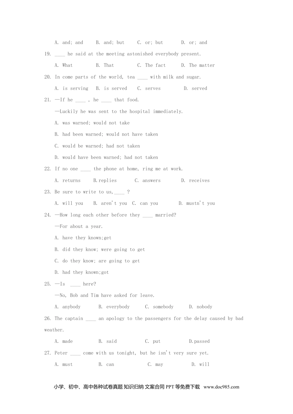 1993年广西高考英语真题及答案第一卷(三大题,共110分)Ⅰ.单项填空(共40小题,计分40)A)从A、B、C、D中找出其划线部分与所给单词的划线部分读音相同的选项。例:haveA.gaveB.saveC.hatD.made答案是C。1.townA.bowlB.shownC.pronounceD.southern2.trunkA.languageB.strangeC.thunderD.twentieth3.somethingA.breatheB.wealthC.althoughD.therefore4.breadA.breakB.weakC.sweatD.least5.biologyA.concertB.observeC.coverD.aboveB)从A、B、C、D中找出适当的字母或字母组合使以下所给单词完整与正确。例:alr____dyA.eaB.eeC.ieD.eu答案是A。6.s____v____geA.a;eB.o;aC.o;eD.a;a7.sna____A.chB.shC.tchD.che8.pr____b____blyA.o;eB.o;aC.a;eD.a;a9.whi____小学、初中、高中各种试卷真题知识归纳文案合同PPT等免费下载www.doc985.comA.sselB.stleC.sleD.tle10.p____neerA.iaB.ieC.ioD.iuC)从A、B、C、D四个选项中,选出可以填入空白处的正确答案。例:Hecomeslatesometimes,____?A.isheB.isn'theC.comesheD.doesn'the答案是D。11.Tonyisgoingcampingwith____boys.A.littletwootherB.twolittleotherC.twootherlittleD.littleothertwo12.—How'stheyoungman?—____.A.He'stwentyB.He'smuchbetterC.He'sadoctorD.He'sDavid13.Weofferedhimourcongratulations____hispassingthecollegeentranceexams.A.atB.ofC.forD.on14.Ifyoukeepon,you'llsucceed____.A.intimeB.atonetimeC.atthesametimeD.ontime15.CharlesBabbageisgenerallyconsidered____thefirstcomputer.A.tohaveinventedB.inventingC.toinventD.havinginvented16.____downtheradio—thebaby'sasleepinthenextroom.A.TurningB.TurnC.TurnedD.Toturn17.Iwasdisappointedwiththefilm.Ihadexpected____tobemuchbetter.A.thatB.thisC.oneD.it18.—Idon'tlikechichenfish.—Idon'tlikechichen____,Ilikefishverymuch.小学、初中、高中各种试卷真题知识归纳文案合同PPT等免费下载www.doc985.comA.and;andB.and;butC.or;butD.or;and19.____hesaidatthemeetingastonishedeverybodypresent.A.WhatB.ThatC.ThefactD.Thematter20.Incomepartsoftheworld,tea____withmilkandsugar.A.isservingB.isservedC.servesD.served21.—Ifhe____,he____thatfood.—Luckilyhewassenttothehospitalimmediately.A.waswarned;wouldnottakeB.hadbeenwarned;wouldnothavetakenC.wouldbewarned;hadnottakenD.wouldhavebeenwarned;hadnottaken22.Ifnoone____thephoneathome,ringmeatwork.A.returnsB.repliesC.answersD.receives23.Besuretowritetous,____?A.willyouB.aren'tyouC.canyouD.mustn'tyou24.—Howlongeachotherbeforethey____married?—Foraboutayear.A.havetheyknown;getB.didtheyknow;weregoingtogetC.dotheyknow;aregoingtogetD.hadtheyknown;got25.—Is____here?—No,BobandTimhaveaskedforleave.A.anybodyB.everybodyC.somebodyD.nobody26.Thecaptain____anapologytothepassengersforthedelaycausedbybadweather.A.madeB.saidC.putD.passed27.Peter____comewithustonight,butheisn'tverysureyet.A.mustB.canC.mayD.will小学、初中、高中各种试卷真题知识归纳文案合同PPT等免费下载www.doc985.com28.Mydictionary____.Ihavelookedforiteverywherebutstillit.A.haslost;don'tfindB.ismissing;don'tfindC.haslost;haven'tfoundD.ismissing;haven'tfound29.Iremember____thisusedtobeaquietvillage.A.whenB.howC.whereD.what30.Readerscan____quitewellwithoutknowingtheexactmeaningofeachword.A.getoverB.getinC.getalongD.getthrough31.Tomoughtnotto____meyoursecret,buthemeantnoharm.A.havetoldB.tellC.betellingD.havingtold32.—Whatwasthepartylike?—Wonderful.It'syears____Ienjoyedmyselfsomuch.A.afterB.whenC.beforeD.since33.Manypeopelarestillin____habitofwritingsillythingsin____publicplaces.A.the;theB.不填;不填C.the;不填D.不填;the34.Hedroppedthe____andbrokeit.A.cupofcoffeeB.coffee'scupC.cupforcoffeeD.coffeecup35....