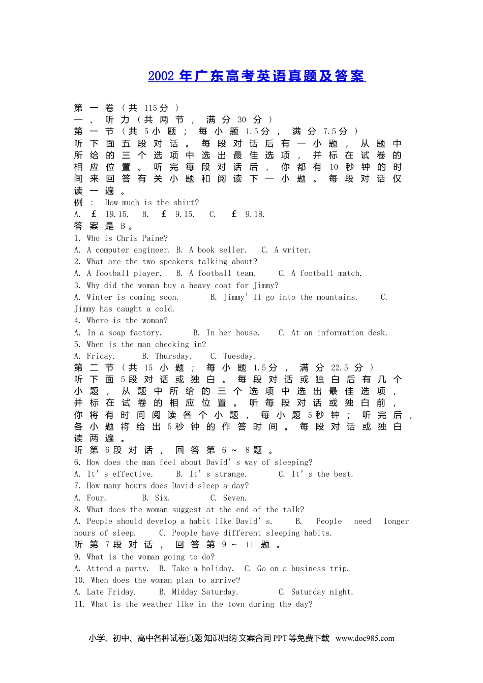 2002年广东高考英语真题及答案第一卷(共115分)一、听力(共两节,满分30分)第一节(共5小题;每小题1.5分,满分7.5分)听下面五段对话。每段对话后有一小题,从题中所给的三个选项中选出最佳选项,并标在试卷的相应位置。听完每段对话后,你都有10秒钟的时间来回答有关小题和阅读下一小题。每段对话仅读一遍。例:Howmuchistheshirt?A.£19.15.B.£9.15.C.£9.18.答案是B。1.WhoisChrisPaine?A.Acomputerengineer.B.Abookseller.C.Awriter.2.Whatarethetwospeakerstalkingabout?A.Afootballplayer.B.Afootballteam.C.Afootballmatch.3.WhydidthewomanbuyaheavycoatforJimmy?A.Winteriscomingsoon.B.Jimmy’llgointothemountains.C.Jimmyhascaughtacold.4.Whereisthewoman?A.Inasoapfactory.B.Inherhouse.C.Ataninformationdesk.5.Whenisthemancheckingin?A.Friday.B.Thursday.C.Tuesday.第二节(共15小题;每小题1.5分,满分22.5分)听下面5段对话或独白。每段对话或独白后有几个小题,从题中所给的三个选项中选出最佳选项,并标在试卷的相应位置。听每段对话或独白前,你将有时间阅读各个小题,每小题5秒钟;听完后,各小题将给出5秒钟的作答时间。每段对话或独白读两遍。听第6段对话,回答第6~8题。6.HowdoesthemanfeelaboutDavid’swayofsleeping?A.It’seffective.B.It’sstrange.C.It’sthebest.7.HowmanyhoursdoesDavidsleepaday?A.Four.B.Six.C.Seven.8.Whatdoesthewomansuggestattheendofthetalk?A.PeopleshoulddevelopahabitlikeDavid’s.B.Peopleneedlongerhoursofsleep.C.Peoplehavedifferentsleepinghabits.听第7段对话,回答第9~11题。9.Whatisthewomangoingtodo?A.Attendaparty.B.Takeaholiday.C.Goonabusinesstrip.10.Whendoesthewomanplantoarrive?A.LateFriday.B.MiddaySaturday.C.Saturdaynight.11.Whatistheweatherlikeinthetownduringtheday?小学、初中、高中各种试卷真题知识归纳文案合同PPT等免费下载www.doc985.comA.Cold.B.Wet.C.Warm.听第8段对话,回答第12~13题。12.Whydoesthemanthankthewoman?A.Shehashelpedhimwithhisproblems.B.Shehasinvitedhimforcoffee.C.ShehasagreedtoseehimonMonday.13.Whendoestheconversationtakeplace?A.Beforeclass.B.Afterclass.C.Duringclass.听第9段对话,回答第14~16题。14.Whatwillthemandonextmorning?A.MeetMr.Cooper.B.VisittheNationalLab.C.MeetBillLyons.15.HowwillthemanspendhisSaturday?A.Hewilldosomepaperwork.B.Hewilltakesomerest.C.Hewillmeetsomevisitors.16.Whatdoweknowaboutthewoman?A.She’stheman’swife.B.She’sabusinessmanager.C.She’sacompanysecretary.听第10段对话,回答第17~20题。17.WhatwasthepurposeofMrs.Whinfield’svisitstoKewGardens?A.Tolearnmoreaboutplants.B.Towriteanarticleongarden.C.Tomeetthewriterssheread.18.WheredidMrs.Whinfieldlivebeforeshemovedtoherpresenthome?A.Dorset.B.Somerset.C.WestLondon.19.WheredoesMrs.Whinfieldgetmostofherplants?A.Shegrowsthemfromseeds.B.Shegetsthemfromherfriends.C.Shebuysthemfromamarket.20.Whatistheprobablerelationshipbetweenthetwospeakers?A.Touristandgardener.B.Collegeprofessorandbiologystudents.C.Newspaperreporterandgardenowner.二、英语知识运用(共两节,满分45分)第一节:单项填空(共15小题;每小题1分,满分15分)例:Itisgenerallyconsideredunwisetogiveachild______heorshewants.A.howeverB.whateverC.whicheverD.whenever答案是B。21.—I’mtakingmydrivingtesttomorrow.—______!A.CheersB.GoodluckC.ComeonD.Congratulations22.Excusemeforbreakingin.—______Ihavesomenewsforyou.A.soB.andC.butD.yet23.—Youhaven’tsaidawordaboutmynewcoat,Brenda.Doyoulikeit?—I’msorryI______anythingaboutitsooner.Icertainlythinkit’sprettyonyou.A.wasn’tsayingB.don’tsayC.won’tsayD.didn’tsay24.Themotherdidn’tknow______toblameforthebrokenglassasithappenedwhileshewasout.小学、初中...