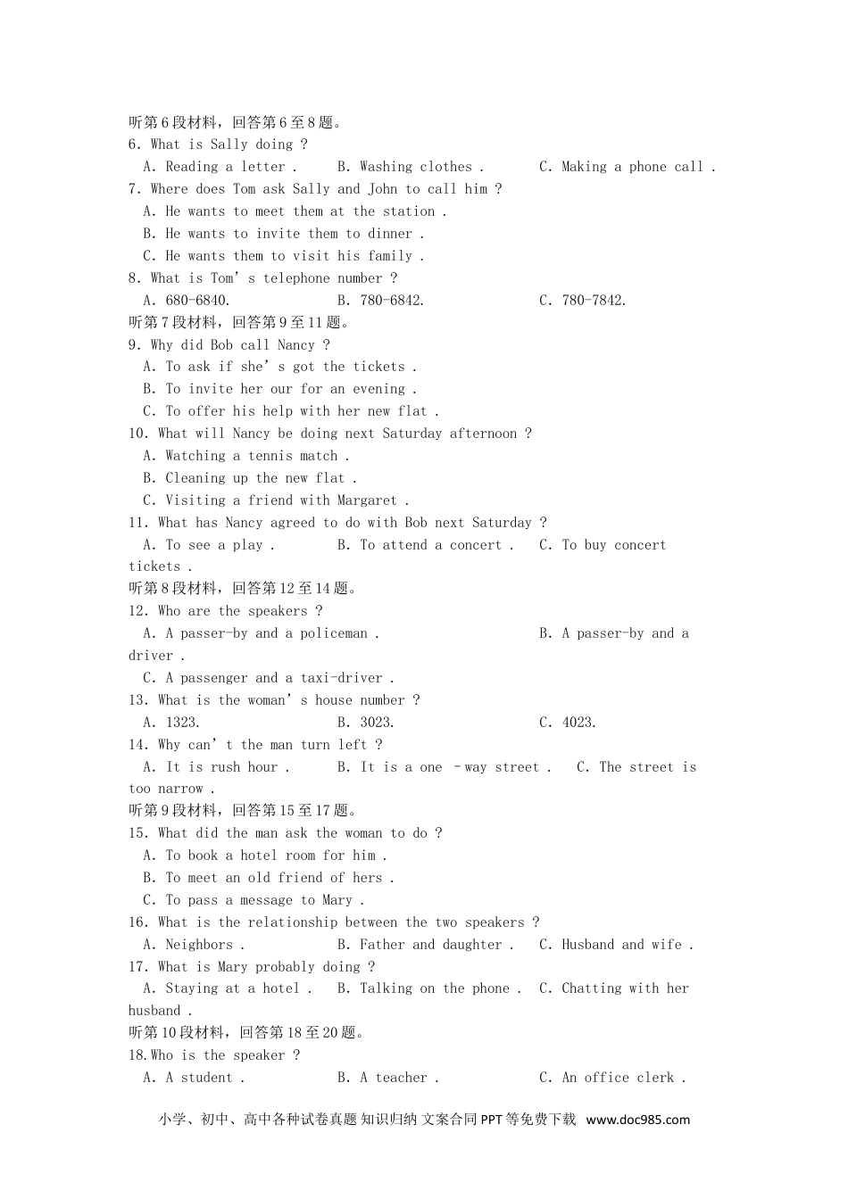 2001年广东高考英语真题及答案本试卷分第一卷(选择题)和第二卷(非选择题)两部分。第一卷1至14页。第二卷1至4页。共150分。考试时间120分钟。第一卷(三部门,共115分)注意事项:1.答第一卷前,考生务必将自己的姓名、准考证号、考试科目用铅笔涂写在答题卡上。2.每小题选出答案后,用铅笔把答题卡上对应题目的答案标号涂黑。如需改动,用橡皮擦干净后,再选涂其他答案标号。不能答在试卷上。3.考试结束,考生将本试卷和答题卡一并交回。听力试题第一部分:听力(共两节,满分30分)作题时,先将答案划在试卷上。录音内容结束后,你将有两分钟的时间将试卷上的答案转涂到答题卡上。第一节(共5小题;每小题1.5分,满分7.5分)听下面5段对话。每段对话后有一个小题,从题中所给的A、B、C三个选项中选出最佳选项,并标在试卷的相应位置。听完每段对话后,你都有10秒钟的时间来回答在关小题和阅读下一小题。每段对话仅读一遍。例:Howmuchistheshirt?A.£19.15B.£9.15C.£9.18答案是B。1.Wheredidthisconversationmostprobablytakeplace?A.Ataconcert.B.Ataflowershop.C.Atarestaurant.2.WhatdidPauldothismoming?A.Hehadahistorylsson.B.Hehadachemistrylesson.C.Heattendedamecting.3.Whatcanweleanaboutthemanfromtheconversation?A.He’sanxioustoseehissister.B.Hewrotetohissisterlastmonth.C.He’sexpectingaletterfromhissister.4.AtwhattimedoesthetraintoLeedsleave?A.3:00B.3:15C.5:005.Whatistheman’sproblem?A.Hecan’tdecidehowtogo.B.Hecan’tdrivehimself.C.Hedoesn’tliketravelingbytrain.第二节(共15小题,每小题1.5分,满分22.5分)听下面5段对话或独白。每段对话或独白后有几个小题,从题中所给的三个选项中选出最佳选项,并标在试卷的相应位置。听每段对话或独白前,你将有时间阅读各个小题,每小题5秒钟;听完后,各小题将给出5秒钟的作答时间。每段对话或独白读两遍。小学、初中、高中各种试卷真题知识归纳文案合同PPT等免费下载www.doc985.com听第6段材料,回答第6至8题。6.WhatisSallydoing?A.Readingaletter.B.Washingclothes.C.Makingaphonecall.7.WheredoesTomaskSallyandJohntocallhim?A.Hewantstomeetthematthestation.B.Hewantstoinvitethemtodinner.C.Hewantsthemtovisithisfamily.8.WhatisTom’stelephonenumber?A.680-6840.B.780-6842.C.780-7842.听第7段材料,回答第9至11题。9.WhydidBobcallNancy?A.Toaskifshe’sgotthetickets.B.Toinviteherourforanevening.C.Toofferhishelpwithhernewflat.10.WhatwillNancybedoingnextSaturdayafternoon?A.Watchingatennismatch.B.Cleaningupthenewflat.C.VisitingafriendwithMargaret.11.WhathasNancyagreedtodowithBobnextSaturday?A.Toseeaplay.B.Toattendaconcert.C.Tobuyconcerttickets.听第8段材料,回答第12至14题。12.Whoarethespeakers?A.Apasser-byandapoliceman.B.Apasser-byandadriver.C.Apassengerandataxi-driver.13.Whatisthewoman’shousenumber?A.1323.B.3023.C.4023.14.Whycan’tthemanturnleft?A.Itisrushhour.B.Itisaone–waystreet.C.Thestreetistoonarrow.听第9段材料,回答第15至17题。15.Whatdidthemanaskthewomantodo?A.Tobookahotelroomforhim.B.Tomeetanoldfriendofhers.C.TopassamessagetoMary.16.Whatistherelationshipbetweenthetwospeakers?A.Neighbors.B.Fatheranddaughter.C.Husbandandwife.17.WhatisMaryprobablydoing?A.Stayingatahotel.B.Talkingonthephone.C.Chattingwithherhusband.听第10段材料,回答第18至20题。18.Whoisthespeaker?A.Astudent.B.Ateacher.C.Anofficeclerk.小学、初中、高中各种试卷真题知识归纳文案合同PPT等免费下载www.doc985.com19.Whydidthespeakergetaparkingticket?A.Hiscarwasparkedfortoolong.B.Hiscartookuptoomuchspace.C.Heleftcarinawrongplace.20.Whichofthefollowingwordsbestdescribesthedaythespeakerhad?A.exciting.B.unlucky.C.tir...