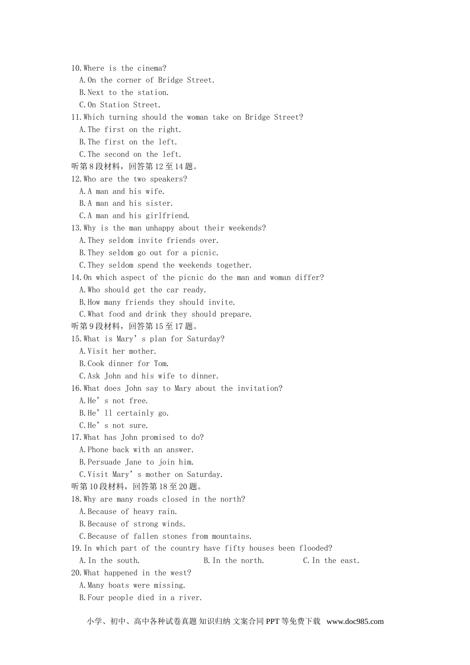 2000年广东高考英语真题及答案第一卷(三部分,共115分)第一部分:听力(共两节,满分30分)作题时,先将答案划在试卷上。录音内容结束后,你将有两分钟的时间将试卷上的答案转涂到答题卡上。第一节(共5小题;每小题1.5分,满分7.5分)听下面5段对话。每段对话后有一个小题,从题中所给的A、B、C三个选项中选出最佳选项,并标在试卷的相应位置。听完每段对话后,你都有10秒钟的时间来回答有关小题和阅读下一小题。每段对话仅读一遍。例:Howmuchistheshirt?A.£19.15.B.£9.15.C.£9.18.答案是B。1.Wherearethetwospeakers?A.Inadepartmentstore.B.Inaclothesfactory.C.Onaplayground.2.Whattimedoesthetrainleave?A.At6:15.B.At6:25.C.At6:50.3.Whatarethetwospeakersdoing?A.Enjoyingmeetingeachother.B.Sayinggood-byetoeachother.C.Planningtoseeeachotheragain.4.What’sthemandoing?A.He’sworkinginahotel.B.He’svisitingayoungcouple.C.He’stravellingaround.5.WhenshouldSusangotomeetProfessorBrown?A.At10:00.B.At10:30.C.At11:00.第二节(共15小题;每小题1.5分,满分22.5分)听下面5段对话或独白。每段对话或独白后有几个小题,从题中所给的A、B、C三个选项中选出最佳选项,并标在试卷的相应位置。听每段对话或独白前,你将有时间阅读各个小题,每小题5秒钟;听完后,各小题将给出5秒钟的作答时间。每段对话或独白读两遍。听第6段材料,回答第6至8题。6.Wheredoesthisconversationtakeplace?A.Atabookingoffice.B.Atamuseum.C.Inarecordstore.7.OnwhichdaywilltheJapaneseMusicConcertbeheld?A.The28th.B.The30th.C.The15th.8.Howdoesthemanpayforthetickets?A.Bycreditcard.B.WithU.S.dollars.C.Bycheque.听第7段材料,回答第9至11题。9.Whereisthewomangoing?A.BridgeStreet.B.Thecinema.C.Thestation.小学、初中、高中各种试卷真题知识归纳文案合同PPT等免费下载www.doc985.com10.Whereisthecinema?A.OnthecornerofBridgeStreet.B.Nexttothestation.C.OnStationStreet.11.WhichturningshouldthewomantakeonBridgeStreet?A.Thefirstontheright.B.Thefirstontheleft.C.Thesecondontheleft.听第8段材料,回答第12至14题。12.Whoarethetwospeakers?A.Amanandhiswife.B.Amanandhissister.C.Amanandhisgirlfriend.13.Whyisthemanunhappyabouttheirweekends?A.Theyseldominvitefriendsover.B.Theyseldomgooutforapicnic.C.Theyseldomspendtheweekendstogether.14.Onwhichaspectofthepicnicdothemanandwomandiffer?A.Whoshouldgetthecarready.B.Howmanyfriendstheyshouldinvite.C.Whatfoodanddrinktheyshouldprepare.听第9段材料,回答第15至17题。15.WhatisMary’splanforSaturday?A.Visithermother.B.CookdinnerforTom.C.AskJohnandhiswifetodinner.16.WhatdoesJohnsaytoMaryabouttheinvitation?A.He’snotfree.B.He’llcertainlygo.C.He’snotsure.17.WhathasJohnpromisedtodo?A.Phonebackwithananswer.B.PersuadeJanetojoinhim.C.VisitMary’smotheronSaturday.听第10段材料,回答第18至20题。18.Whyaremanyroadsclosedinthenorth?A.Becauseofheavyrain.B.Becauseofstrongwinds.C.Becauseoffallenstonesfrommountains.19.Inwhichpartofthecountryhavefiftyhousesbeenflooded?A.Inthesouth.B.Inthenorth.C.Intheeast.20.Whathappenedinthewest?A.Manyboatsweremissing.B.Fourpeoplediedinariver.小学、初中、高中各种试卷真题知识归纳文案合同PPT等免费下载www.doc985.comC.Twovillageswereunderwater.第二部分:英语知识运用(共两节,满分45分)第一节:单项填空(共15小题;每小题1分,满分15分)从A、B、C、D四个选项中,选出可以填入空白处的最佳选项,并在答题卡上将该项涂黑。例:Itisgenerallyconsideredunwisetogiveachildheorshewants.A.howeverB.whateverC.whicheverD.whenever答案是B。21.—Waiter!——Ican’teatthis.It’stoosalty.A.Yes,sir?B.What?C.Allright?D.Pardon?22.Idon’tthinkI’llneedanymoneybutI’llbringsome.A.atlastB.incaseC.oncea...