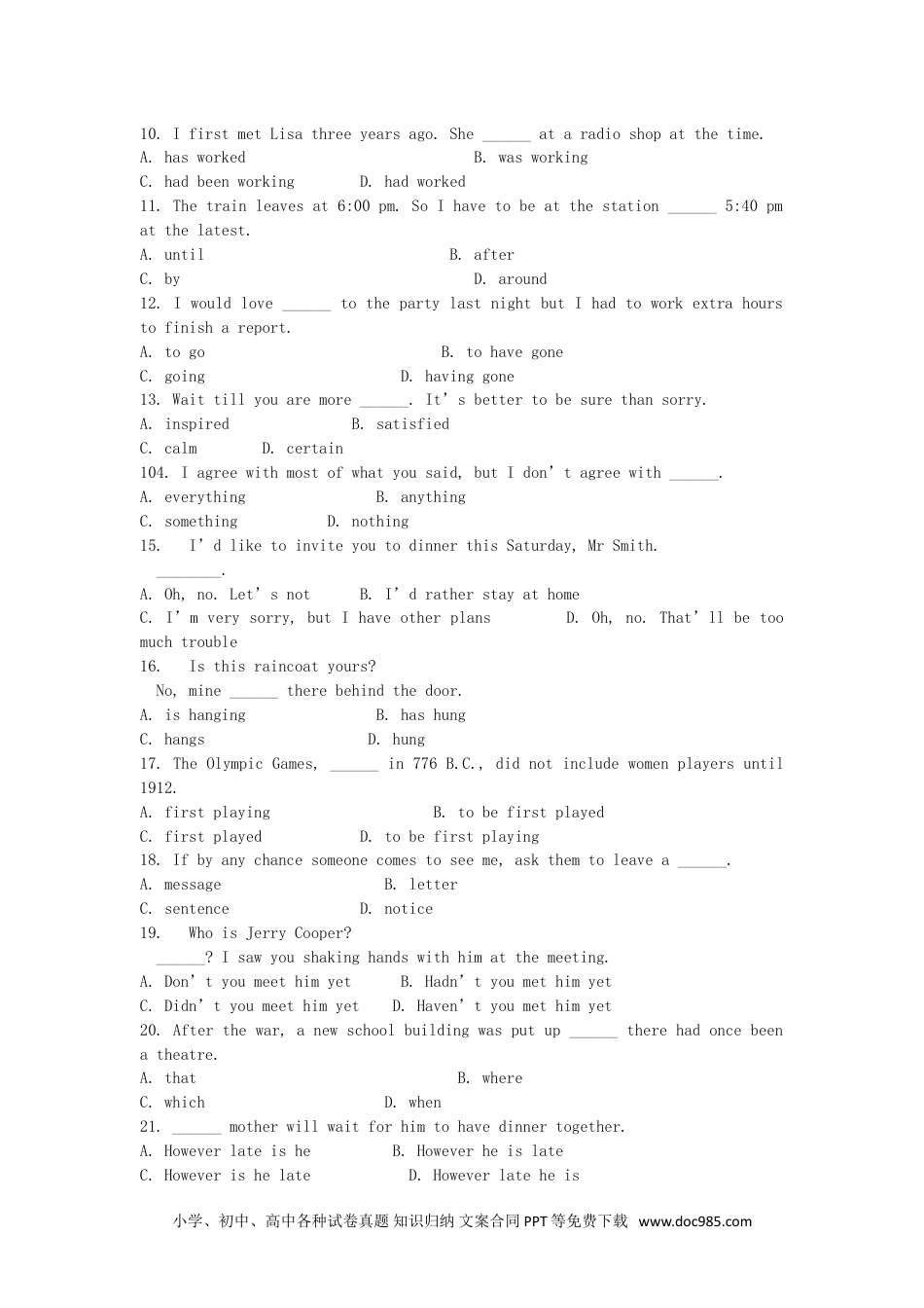 1997年广东高考英语真题及答案第一卷(共95分)一、单项填空(共25小题,每小题1分;满分25分)A)从A、B、C、D中找出其划线部分与所给单词的划线部分读音相同的选项。例:haveA.gaveB.saveC.hatD.made答案是C.1.motorA.oppositeB.oceanC.oppressD.object2.theoryA.diaryB.pioneerC.thereforeD.really3.oxygenA.geographyB.degreeC.recogniseD.sugar4.canalA.importantB.liberationC.majorityD.national5.medicineA.exceptB.recordC.increaseD.physicsB)从A、B、C、D四个选项中,选出可以填入空白处的最佳答案。例:Welastnight,butwewenttotheconcertinstead.A.musthavestudiedB.mightstudyC.shouldhavestudiedD.wouldstudy答案是C。6.Itisgenerallyconsideredunwisetogiveachild______heorshewants.A.howeverB.whateverC.whicheverD.whenever7.--Haveyouseen______pen?Ileftitherethismorning.—Isit______blackone?IthinkIsawitsomewhere.A.a;theB.the;theC.the;aD.a;a8.—DoyouthinkIcouldborrowyourdictionary?—_______.A.Yes,youmayborrowB.Yes,youcouldC.Yes,helpyourselfD.Yes,goon9.She______hisnumberinthephonebooktomakesurethatshehadgotitright.A.lookedupB.lookedforC.pickedoutD.pickedup小学、初中、高中各种试卷真题知识归纳文案合同PPT等免费下载www.doc985.com10.IfirstmetLisathreeyearsago.She______ataradioshopatthetime.A.hasworkedB.wasworkingC.hadbeenworkingD.hadworked11.Thetrainleavesat6:00pm.SoIhavetobeatthestation______5:40pmatthelatest.A.untilB.afterC.byD.around12.Iwouldlove______tothepartylastnightbutIhadtoworkextrahourstofinishareport.A.togoB.tohavegoneC.goingD.havinggone13.Waittillyouaremore______.It’sbettertobesurethansorry.A.inspiredB.satisfiedC.calmD.certain104.Iagreewithmostofwhatyousaid,butIdon’tagreewith______.A.everythingB.anythingC.somethingD.nothing15.I’dliketoinviteyoutodinnerthisSaturday,MrSmith.________.A.Oh,no.Let’snotB.I’dratherstayathomeC.I’mverysorry,butIhaveotherplansD.Oh,no.That’llbetoomuchtrouble16.Isthisraincoatyours?No,mine______therebehindthedoor.A.ishangingB.hashungC.hangsD.hung17.TheOlympicGames,______in776B.C.,didnotincludewomenplayersuntil1912.A.firstplayingB.tobefirstplayedC.firstplayedD.tobefirstplaying18.Ifbyanychancesomeonecomestoseeme,askthemtoleavea______.A.messageB.letterC.sentenceD.notice19.WhoisJerryCooper?______?Isawyoushakinghandswithhimatthemeeting.A.Don’tyoumeethimyetB.Hadn’tyoumethimyetC.Didn’tyoumeethimyetD.Haven’tyoumethimyet20.Afterthewar,anewschoolbuildingwasputup______therehadoncebeenatheatre.A.thatB.whereC.whichD.when21.______motherwillwaitforhimtohavedinnertogether.A.HoweverlateisheB.HoweverheislateC.HoweverishelateD.Howeverlateheis小学、初中、高中各种试卷真题知识归纳文案合同PPT等免费下载www.doc985.com22.—Alice,whydidn’tyoucomeyesterday?—I______,butIhadanunexpectedvisitor.A.hadB.wouldC.wasgoingtoD.did23.SarahhasreadlotsofstoriesbyAmericanwriters.Nowshewouldliketoread______storiesby______writersfromcountries.A.some;anyB.other;someC.some;otherD.other;other24.Thefirespreadthroughthehotelveryquicklybuteveryone______getout.A.hadtoB.wouldC.couldD.wasableto25.Itwasabout600yearsago______thefirstclockwithafaceandanhourhandwasmade.A.thatB.untilC.beforeD.when二、完形填空(共25小题,每小题1分;满分25分)阅读下面短文,掌握其大意,然后从26~50各题所给的四个选项中,选出一个最佳答案。Toddwasworkingathisgasstation(加油站)atnightwhenheheardovertheradiothata___26___inLongIslandhadbeen___27___byanarmedmanwhohadkilledthenightguardandgotawaywith$150,000.“Onehundredandfiftythousand,”Toddwhistled.Here’safello...