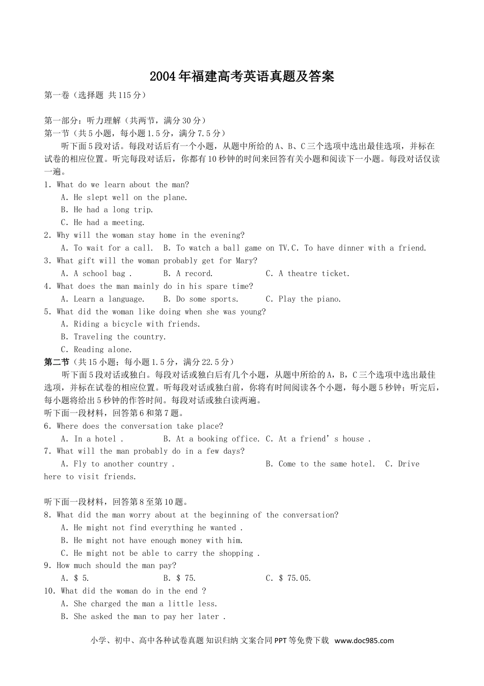 2004年福建高考英语真题及答案第一卷(选择题共115分)第一部分:听力理解(共两节,满分30分)第一节(共5小题,每小题1.5分,满分7.5分)听下面5段对话。每段对话后有一个小题,从题中所给的A、B、C三个选项中选出最佳选项,并标在试卷的相应位置。听完每段对话后,你都有10秒钟的时间来回答有关小题和阅读下一小题。每段对话仅读一遍。1.Whatdowelearnabouttheman?A.Hesleptwellontheplane.B.Hehadalongtrip.C.Hehadameeting.2.Whywillthewomanstayhomeintheevening?A.Towaitforacall.B.TowatchaballgameonTV.C.Tohavedinnerwithafriend.3.WhatgiftwillthewomanprobablygetforMary?A.Aschoolbag.B.Arecord.C.Atheatreticket.4.Whatdoesthemanmainlydoinhissparetime?A.Learnalanguage.B.Dosomesports.C.Playthepiano.5.Whatdidthewomanlikedoingwhenshewasyoung?A.Ridingabicyclewithfriends.B.Travelingthecountry.C.Readingalone.第二节(共15小题;每小题1.5分,满分22.5分)听下面5段对话或独白。每段对话或独白后有几个小题,从题中所给的A,B,C三个选项中选出最佳选项,并标在试卷的相应位置。听每段对话或独白前,你将有时间阅读各个小题,每小题5秒钟;听完后,每小题将给出5秒钟的作答时间。每段对话或独白读两遍。听下面一段材料,回答第6和第7题。6.Wheredoestheconversationtakeplace?A.Inahotel.B.Atabookingoffice.C.Atafriend’shouse.7.Whatwillthemanprobablydoinafewdays?A.Flytoanothercountry.B.Cometothesamehotel.C.Driveheretovisitfriends.听下面一段材料,回答第8至第10题。8.Whatdidthemanworryaboutatthebeginningoftheconversation?A.Hemightnotfindeverythinghewanted.B.Hemightnothaveenoughmoneywithhim.C.Hemightnotbeabletocarrytheshopping.9.Howmuchshouldthemanpay?A.$5.B.$75.C.$75.05.10.Whatdidthewomandointheend?A.Shechargedthemanalittleless.B.Sheaskedthemantopayherlater.小学、初中、高中各种试卷真题知识归纳文案合同PPT等免费下载www.doc985.comC.Shemadeamistakeinaddingupthecost.听下面一段材料,回答第11至第13题。11.Wherearethespeakers?A.Inaclassroom.B.Inatheatre.C.Inanoffice.12.Whydoesthemanplantoleaveearly?A.Heisgoingonvacation.B.Heisgoingtoaperformance.C.Heisgoingtothepostoffice.13.Whatdoesthewomanoffertodo?A.Cleantheoffice.B.Pickuptheman’sson.C.Finishtheman’swork.听下面一段材料,回答第14至第17题。14.Howdoesthewomanfeelatthebeginningoftheconversation?A.Angry.B.Surprised.C.Sad.15.Whatsizebagdoesthewomanwant?A.A24-inchbag.B.A29-inchbag.C.A32-inchbag.16.WhenwillthewomanleaveforMexico?A.OnThursday.B.OnFriday.C.OnSaturday.17.Wheredoesthemanwork?A.Atamailordercompany.B.Ataninternationaltravelservice.C.Attheairportinformationdesk.听下面一段材料,回答第18至20题。18.Whydidthewomannotgotocollege?A.Shedidn’tpasstheexam.B.Shewasn’tinterestedincollege.C.Shecouldn’taffordcollegeeducation.19.Whatjobdoesthewomansayshedid?A.Shewasabusconductor.B.Shewasashopassistant.C.Shewasahousekeeper.20.Whatdidthewomanthinkofherfriend’scollegelife?A.Itwasbusy.B.Iwaswonderful.C.Itwasdull.第二部分:英语知识运用(共两节,满分45分)第一节:单项填空(共15小题,每小题1分,满分15分)从A、B、C和D、四个选项中,选出可以填入空白处的最佳选项。21.—YouwereoutwhenIdroppedinatyourhouse.—Oh,I_______forafriendfromEnglandattheairport.A.waswaitingB.hadwaitedC.amwaitingD.havewaited22.—WhichofthethreewaysshallItaketothevillage?—_________wayasyouplease.A.EachB.EveryC.AnyD.Either23.Itis________worldofwonders,worldwhereanythingcanhappen.A.a;theB.a;aC.the;aD.不填;不填小学、初中、高中各种试卷真题知识归纳文案合同PPT等免...
