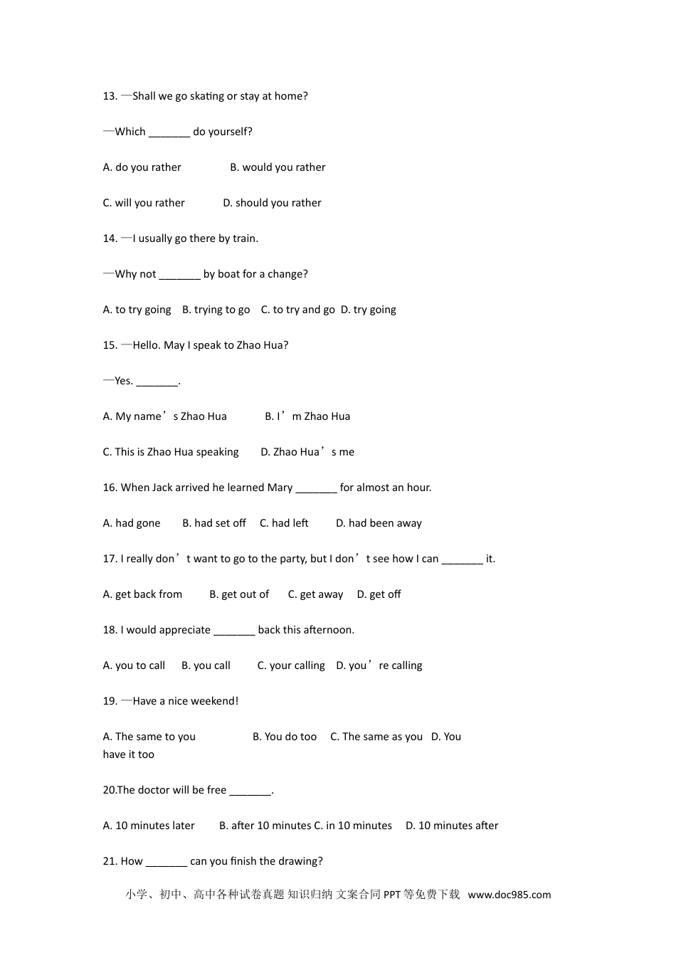 1992年福建高考英语真题及答案第I卷(三部分,共85分)第一部分(K)英语知识KI.语音和拼写知识(共10小题,计分5%)A)从A、B、C、D中找出其划线部分与所给单词的划线部分读音相同的选项。例:havegaveB.saveC.hatD.made答案是C。1.dangerousA.CanadianB.JanuaryC.balanceD.advanced2.frequentlyA.presidentB.freshC.feverD.electric3.researchA.surfaceB.tearC.surroundD.disappear4.cousinA.thirstyB.resistC.anxiousD.universe5.exactA.expertB.exhibitionC.exerciseD.existB)以下所给单词均不完整,从A、B、SIZE:10.5pt;FONT-C、D中选出适当的字母或字母组合,使其完整与正确。例:alr_______dy小学、初中、高中各种试卷真题知识归纳文案合同PPT等免费下载www.doc985.comA.eaB.eeC.ieD.eu答案是A。6.Europ_______nA.eaB.aeC.iaD.ie7.requ_______A.areB.iarC.ierD.ire8.c___n___lA.o;aB.o;eC.a;aD.a;e9.immed_______telyA.eaB.eiC.ieD.ia10.spl___nd____dA.e;eB.e;iC.a;iD.a;eKII.单项填空(共30小题,计分15%)从A、B、BC、D中选出可以填入空白处的正确答案。例:Hecomeslatesometimes,_______?A.isheB.isn’theC.comesheD.doesn’the答案是D。11.LittleJimshouldlove_______tothetheatrethisevening.A.tobetakenB.totakeC.beingtakenD.taking12.—CouldIborrowyourdictionary?—Yes,ofcourseyou_______.A.mightB.willC.canD.should小学、初中、高中各种试卷真题知识归纳文案合同PPT等免费下载www.doc985.com13.—Shallwegoskatingorstayathome?—Which_______doyourself?A.doyouratherB.wouldyouratherC.willyouratherD.shouldyourather14.—Iusuallygotherebytrain.—Whynot_______byboatforachange?A.totrygoingB.tryingtogoC.totryandgoD.trygoing15.—Hello.MayIspeaktoZhaoHua?—Yes._______.A.Myname’sZhaoHuaB.I’mZhaoHuaC.ThisisZhaoHuaspeakingD.ZhaoHua’sme16.WhenJackarrivedhelearnedMary_______foralmostanhour.A.hadgoneB.hadsetoffC.hadleftD.hadbeenaway17.Ireallydon’twanttogototheparty,butIdon’tseehowIcan_______it.A.getbackfromB.getoutofC.getawayD.getoff18.Iwouldappreciate_______backthisafternoon.A.youtocallB.youcallC.yourcallingD.you’recalling19.—Haveaniceweekend!A.ThesametoyouB.YoudotooC.ThesameasyouD.Youhaveittoo20.Thedoctorwillbefree_______.A.10minuteslaterB.after10minutesC.in10minutesD.10minutesafter21.How_______canyoufinishthedrawing?小学、初中、高中各种试卷真题知识归纳文案合同PPT等免费下载www.doc985.comA.oftenB.soonC.longD.rapid.soon&nbs22.—Doyouknowourtownatall?—No,thisisthefirsttimeI_______here.A.wasB.havebeenC.cameD.amcoming23.MrZhanggavethetextbookstoallthepupilsexcept_______whohadalreadytakenthem.A.theonesB.onesC.someD.theothers24._______terribleweatherwe’vebeenhavingthesedays!A.HowaB.WhataC.HowD.What25.There’resomanykindsoftape-recordersonsalethatIcan’tmakeupmymind_______tobuy.A.whatB.which&nbFONsp;C.howD.where26.-Wecouldhavewalkedtothestation;itwassonear.Yes.Ataxi_______atallnecessary.A.wasn’tB.hadn’tbeenC.wouldn’tbeD.won’tbe27.Inthedarkstreet,therewasn’tasingleperson_______shecouldturnforhelp.A.thatB.whoC.fromwhomD.towhom28.Whichis_______country,CanadaorAustralia?A.alargeB.largerC.alargerD.thelarger29.Shortlyaftertheaccident,two_______policeweresenttothespottokeeporder.A.dozenofB.dozensC.dozenD.dozensof30.Itwasnot_______shetookoffherdarkglasses_______Irealizedshewasafamousfilmstar.A.when;thatB.until;thatC.until;whenD.when;then小学、初中、高中各种试卷真题知识归纳文案合同PPT等免费下载www.doc985.com31.Ifcitynoises_______fromincreasing,people_______shouttobeheardevenatthedinnertable20yearsfromnow.A.arenotkept;willhavetoB.arenotkept;havetoC.donotkeep;willhavetoD.donotkeep;haveto32...