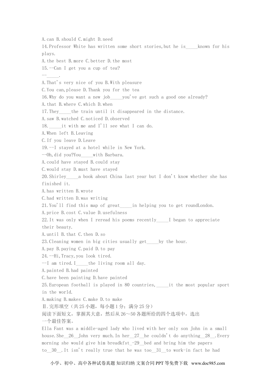 1998年北京高考英语真题及答案Ⅰ.单项填空(共25小题,每小题1分;满分25分)A)从A、B、C、D中找出其划线部分与所给单词的划线部分读音相同的选项。例:haveA.gaveB.saveC.hatD.made答案是C。1.proveA.stoneB.routeC.stoveD.hook2.anxiousA.branchB.conclusionC.dangerousD.tongue3.breatheA.healthB.deafC.increaseD.pleasure4.achieveA.researchB.chemistC.techniqueD.stomach5.silverA.silentB.prettyC.tinyD.rejectB)从A、B、C、D四个选项中,选出可以填入空白处的最佳答案。例:We_____lastnight,butwewenttotheconcertinstead.A.musthavestudiedB.mightstudyC.shouldhavestudiedD.wouldstudy答案是C。6.--CanyoucomeonMondayorTuesday?--I'mafraid_____dayispossible.A.eitherB.neitherC.someD.any7.--Youhaven'tbeentoBeijing,haveyou?--_____.HowIwishtogothere!A.Yes,IhaveB.Yes,Ihaven'tC.No,IhaveD.No,Ihaven't8.Ihate_____whenpeopletalkwiththeirmouthsfull.A.itB.thatC.theseD.them9.Dr,BlackcomesfromeitherOxfordorCambridge,Ican'tremember_____.A.whereB.thereC.whichD.that10.--Nancyisnotcomingtonight.--Butshe_____!A.promisesB.promisedC.willpromiseD.hadpromised11.IfIhad_____,I'dvisitEurope,stoppingatallthesmallinterestingplaces.A.alongenoughholidayB.anenoughlongholidayc.aholidayenoughlongD.alongholidayenough12.Nobodynoticedthethiefslipintothehousebecausethelightshappenedto_____.A.biputupB.giveinC.beturnedonD.goout13.--WhencanIcomeforthephotos?Ineedthemtomorrowafternoon.--They_____bereadyby12:00.小学、初中、高中各种试卷真题知识归纳文案合同PPT等免费下载www.doc985.comA.canB.shouldC.mightD.need14.ProfessorWhitehaswrittensomeshortstories,butheis_____knownforhisplays.A.thebestB.moreC.betterD.themost15.--CanIgetyouacupoftea?--_____.A.That'sveryniceofyouB.WithpleasureC.Youcan,pleaseD.Thankyouforthetea16.Whydoyouwantanewjob_____you'vegotsuchagoodonealready?A.thatB.whereC.whichD.when17.They_____thetrainuntilitdisappearedinthedistance.A.sawB.watchedC.noticedD.observed18._____itwithmeandI'llseewhatIcando.A.WhenleftB.LeavingC.IfyouleaveD.Leave19.--IstayedatahotelwhileinNewYork.--Oh,didyou?You_____withBarbara.A.couldhavestayedB.couldstayC.wouldstayD.musthavestayed20.Shirley_____abookaboutChinalastyearbutIdon'tknowwhethershehasfinishedit.A.haswrittenB.wroteC.hadwrittenD.waswriting21.You'llfindthismapofgreat_____inhelpingyoutogetroundLondon.A.priceB.costC.valueD.usefulness22.ItwasonlywhenIrereadhispoemsrecently_____Ibegantoappreciatetheirbeauty.A.untilB.thatC.thenD.so23.Cleaningwomeninbigcitiesusuallyget_____bythehour.A.payB.payingC.paidD.topay24.--Hi,Tracy,youlooktired.--Iamtired.I_____thelivingroomallday.A.paintedB.hadpaintedC.havebeenpaintingD.havepainted25.Europeanfootballisplayedin80countries,_____itthemostpopularsportintheworld.A.makingB.makesC.makeD.tomakeⅡ.完形填空(共25小题,每小题1分;满分25分)阅读下面短文,掌握其大意,然后从26~50各题所给的四个选项中,选出一个最佳答案。EllaFantwasamiddle-agedladywholivedwithheronlysonJohninasmallhouse.She__26__Johnverymuch.Inher__27__hecouldn'tdoanything__28__.Everymorningshewouldgivehimbreadkfst_-29__bedandbringhimthepapersto__30__.Itisn'treallytruethathewastoo__31__towork-infacthehad小学、初中、高中各种试卷真题知识归纳文案合同PPT等免费下载www.doc985.comtriedafew__32__.Firstofallhewasawindow-cleanerandinhisfirstweekhemanagedto__33__atleastsixwindows.Thenhe__34__abusconductorandonhissecond__35__apassengerstolehisbagwithallthefares(车费)collected.He__36__losthisjobasapostman__37__hesentoffalltheletters...