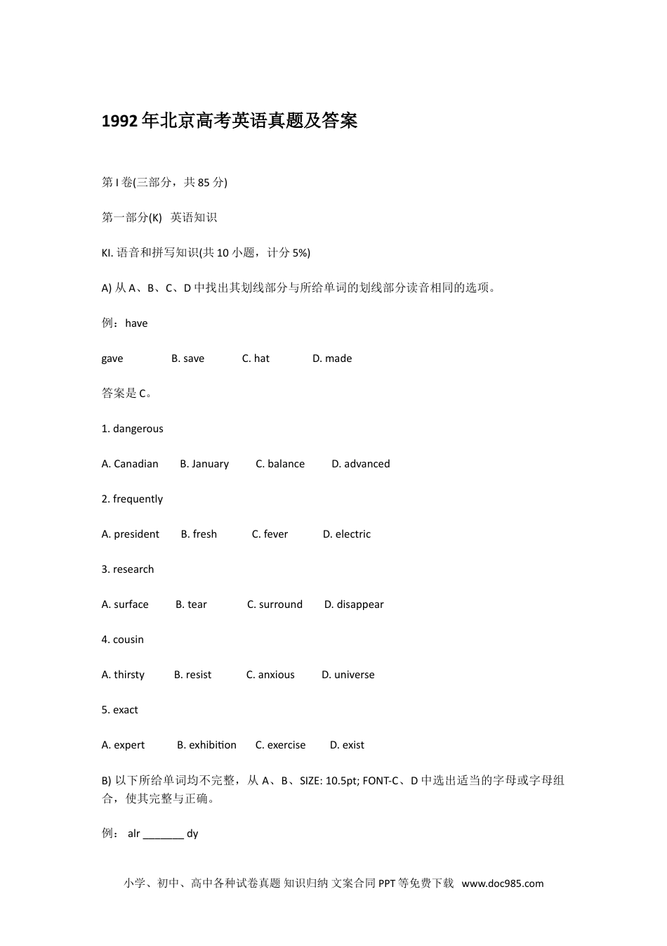 1992年北京高考英语真题及答案第I卷(三部分,共85分)第一部分(K)英语知识KI.语音和拼写知识(共10小题,计分5%)A)从A、B、C、D中找出其划线部分与所给单词的划线部分读音相同的选项。例:havegaveB.saveC.hatD.made答案是C。1.dangerousA.CanadianB.JanuaryC.balanceD.advanced2.frequentlyA.presidentB.freshC.feverD.electric3.researchA.surfaceB.tearC.surroundD.disappear4.cousinA.thirstyB.resistC.anxiousD.universe5.exactA.expertB.exhibitionC.exerciseD.existB)以下所给单词均不完整,从A、B、SIZE:10.5pt;FONT-C、D中选出适当的字母或字母组合,使其完整与正确。例:alr_______dy小学、初中、高中各种试卷真题知识归纳文案合同PPT等免费下载www.doc985.comA.eaB.eeC.ieD.eu答案是A。6.Europ_______nA.eaB.aeC.iaD.ie7.requ_______A.areB.iarC.ierD.ire8.c___n___lA.o;aB.o;eC.a;aD.a;e9.immed_______telyA.eaB.eiC.ieD.ia10.spl___nd____dA.e;eB.e;iC.a;iD.a;eKII.单项填空(共30小题,计分15%)从A、B、BC、D中选出可以填入空白处的正确答案。例:Hecomeslatesometimes,_______?A.isheB.isn’theC.comesheD.doesn’the答案是D。11.LittleJimshouldlove_______tothetheatrethisevening.A.tobetakenB.totakeC.beingtakenD.taking12.—CouldIborrowyourdictionary?—Yes,ofcourseyou_______.A.mightB.willC.canD.should小学、初中、高中各种试卷真题知识归纳文案合同PPT等免费下载www.doc985.com13.—Shallwegoskatingorstayathome?—Which_______doyourself?A.doyouratherB.wouldyouratherC.willyouratherD.shouldyourather14.—Iusuallygotherebytrain.—Whynot_______byboatforachange?A.totrygoingB.tryingtogoC.totryandgoD.trygoing15.—Hello.MayIspeaktoZhaoHua?—Yes._______.A.Myname’sZhaoHuaB.I’mZhaoHuaC.ThisisZhaoHuaspeakingD.ZhaoHua’sme16.WhenJackarrivedhelearnedMary_______foralmostanhour.A.hadgoneB.hadsetoffC.hadleftD.hadbeenaway17.Ireallydon’twanttogototheparty,butIdon’tseehowIcan_______it.A.getbackfromB.getoutofC.getawayD.getoff18.Iwouldappreciate_______backthisafternoon.A.youtocallB.youcallC.yourcallingD.you’recalling19.—Haveaniceweekend!A.ThesametoyouB.YoudotooC.ThesameasyouD.Youhaveittoo20.Thedoctorwillbefree_______.A.10minuteslaterB.after10minutesC.in10minutesD.10minutesafter21.How_______canyoufinishthedrawing?小学、初中、高中各种试卷真题知识归纳文案合同PPT等免费下载www.doc985.comA.oftenB.soonC.longD.rapid.soon&nbs22.—Doyouknowourtownatall?—No,thisisthefirsttimeI_______here.A.wasB.havebeenC.cameD.amcoming23.MrZhanggavethetextbookstoallthepupilsexcept_______whohadalreadytakenthem.A.theonesB.onesC.someD.theothers24._______terribleweatherwe’vebeenhavingthesedays!A.HowaB.WhataC.HowD.What25.There’resomanykindsoftape-recordersonsalethatIcan’tmakeupmymind_______tobuy.A.whatB.which&nbFONsp;C.howD.where26.-Wecouldhavewalkedtothestation;itwassonear.Yes.Ataxi_______atallnecessary.A.wasn’tB.hadn’tbeenC.wouldn’tbeD.won’tbe27.Inthedarkstreet,therewasn’tasingleperson_______shecouldturnforhelp.A.thatB.whoC.fromwhomD.towhom28.Whichis_______country,CanadaorAustralia?A.alargeB.largerC.alargerD.thelarger29.Shortlyaftertheaccident,two_______policeweresenttothespottokeeporder.A.dozenofB.dozensC.dozenD.dozensof30.Itwasnot_______shetookoffherdarkglasses_______Irealizedshewasafamousfilmstar.A.when;thatB.until;thatC.until;whenD.when;then小学、初中、高中各种试卷真题知识归纳文案合同PPT等免费下载www.doc985.com31.Ifcitynoises_______fromincreasing,people_______shouttobeheardevenatthedinnertable20yearsfromnow.A.arenotkept;willhavetoB.arenotkept;havetoC.donotkeep;willhavetoD.donotkeep;haveto32...