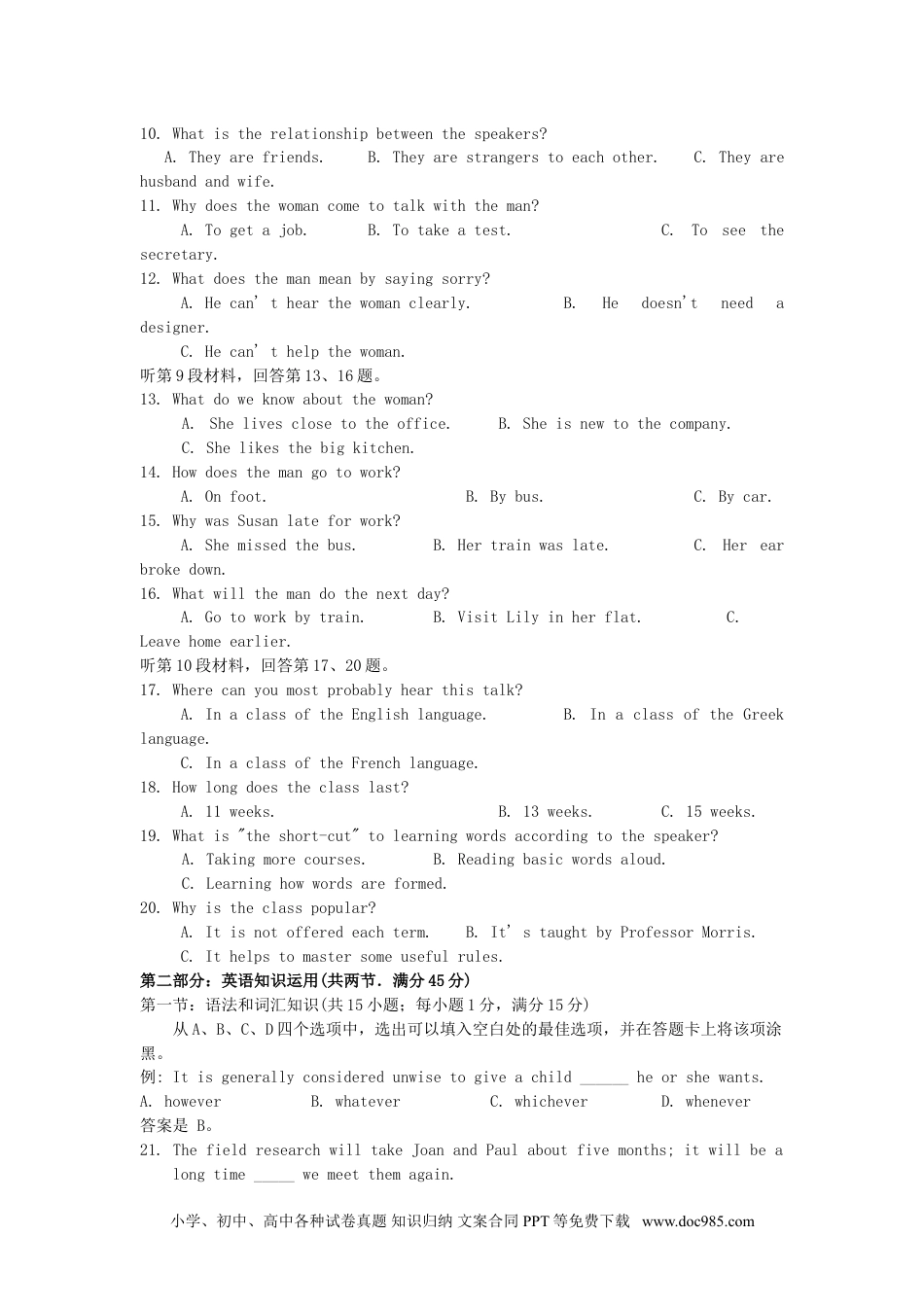 2007年安徽高考英语真题及答案第Ⅰ卷第一部分:听力(共两节。满分30分)做题时,先将答案标在试卷上。录音内容结束后,你将有两分钟的时间将试卷上的答案转涂到答题卡上。第一节(共5小题;每小题1.5分,满分7.5分)听下面5段对话。每段对话后有一个小题,从题中所给的A、B、C三个选项中选出最佳选项,并标在试卷的相应位置。听完每段对话后,你都有10秒钟的时间来回答有关小题和阅读下一小题。每段对话仅读一遍。例:Howmuchistheshirt?A.£9.15.B.£9.15.C.£9.18.答案是B。1.Whoiscomingfortea?A.John.B.Mark.C.Tracy.2.Whatwillthemandonext?A.Leaverightaway.B.Stayfordinner.C.Catchatrain.3.Whatdoesthemancomefor?A.Alecture.B.Ameeting.C.Aparty.4.Whatsizedoesthemanwant?A.9.B.35.C.39.5.Whatarethespeakerstalkingabout?A.LifeinSoutheastAsia.B.Weatherconditions.C.Aholidaytour.第二节(共15小题;每小题1.5分,满分22.5分)听下面5段对话。每段对话后有几个小题,从题中所给的A、B、C三个选项中选出最佳选项,并标在试卷的相应位置。听每段对话前,你将有时间阅读各个小题,每小题5秒钟;听完后,各小题将给出5秒钟的作答时间。每段对话读两遍。听第6段材料,回答第6、7题。6.Whatisthemandoing?A.Givingaspeech.B.Chairingameeting.C.Introducingaperson.7.Whydoesthewomansingsowell?A.Shehasagreatteacher.B.Sheteachessinging.C.Sheisyoung.听第7段材料,回答第8、9题。8.WhatisthesecondgiftforJimmy?A.Acar.B.Awatch.C.Acomputer.9.WhydoesJimmyfeelhappy?A.Heliveswithhisparents.B.He'sgotwhathedreamtof.C.He'sreceivedlotsofpresents.听第8段材料,回答第10、12题。小学、初中、高中各种试卷真题知识归纳文案合同PPT等免费下载www.doc985.com10.Whatistherelationshipbetweenthespeakers?A.Theyarefriends.B.Theyarestrangerstoeachother.C.Theyarehusbandandwife.11.Whydoesthewomancometotalkwiththeman?A.Togetajob.B.Totakeatest.C.Toseethesecretary.12.Whatdoesthemanmeanbysayingsorry?A.Hecan'thearthewomanclearly.B.Hedoesn'tneedadesigner.C.Hecan'thelpthewoman.听第9段材料,回答第13、16题。13.Whatdoweknowaboutthewoman?A.Shelivesclosetotheoffice.B.Sheisnewtothecompany.C.Shelikesthebigkitchen.14.Howdoesthemangotowork?A.Onfoot.B.Bybus.C.Bycar.15.WhywasSusanlateforwork?A.Shemissedthebus.B.Hertrainwaslate.C.Herearbrokedown.16.Whatwillthemandothenextday?A.Gotoworkbytrain.B.VisitLilyinherflat.C.Leavehomeearlier.听第10段材料,回答第17、20题。17.Wherecanyoumostprobablyhearthistalk?A.InaclassoftheEnglishlanguage.B.InaclassoftheGreeklanguage.C.InaclassoftheFrenchlanguage.18.Howlongdoestheclasslast?A.11weeks.B.13weeks.C.15weeks.19.Whatis"theshort-cut"tolearningwordsaccordingtothespeaker?A.Takingmorecourses.B.Readingbasicwordsaloud.C.Learninghowwordsareformed.20.Whyistheclasspopular?A.Itisnotofferedeachterm.B.It'staughtbyProfessorMorris.C.Ithelpstomastersomeusefulrules.第二部分:英语知识运用(共两节.满分45分)第一节:语法和词汇知识(共15小题;每小题1分,满分15分)从A、B、C、D四个选项中,选出可以填入空白处的最佳选项,并在答题卡上将该项涂黑。例:Itisgenerallyconsideredunwisetogiveachild______heorshewants.A.howeverB.whateverC.whicheverD.whenever答案是B。21.ThefieldresearchwilltakeJoanandPaulaboutfivemonths;itwillbealongtime_____wemeetthemagain.小学、初中、高中各种试卷真题知识归纳文案合同PPT等免费下载www.doc985.comA.afterB.beforeC.sinceD.when22.Little_______thatwewerewatchinghiseverymove,soheseemedtobegoinghisownwayinthisbusiness.A.herealizedB.hedidn'trealizeC.didn'therealizeD.didherealize23.Theteacher__havethoughtJohnsonwasworthitorshewouldn'thavewastedtimeonhim,Isuppose.A.shouldB.canC.wouldD.must24.--WasMartinsorryfo...