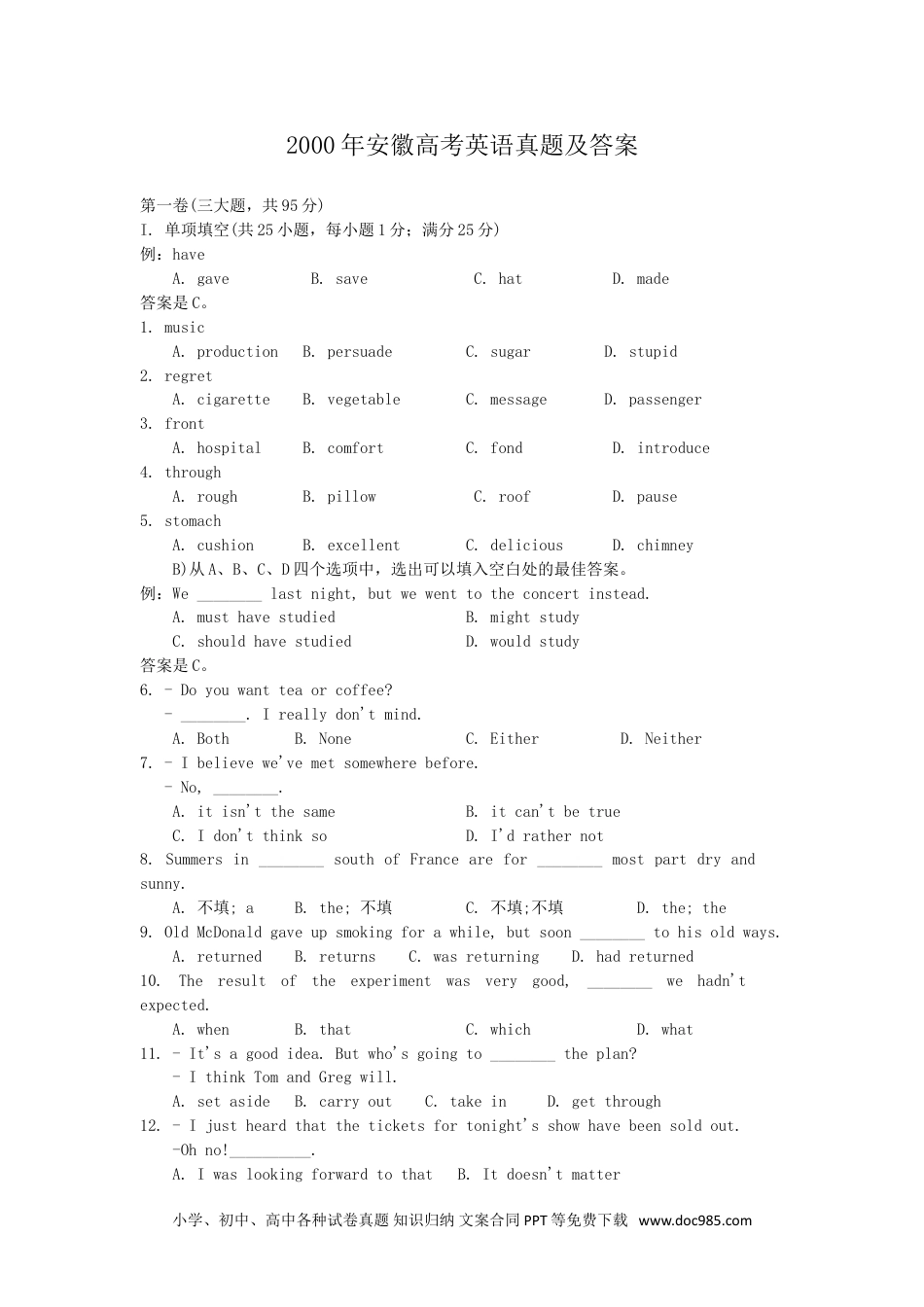 2000年安徽高考英语真题及答案第一卷(三大题,共95分)I.单项填空(共25小题,每小题1分;满分25分)例:haveA.gaveB.saveC.hatD.made答案是C。1.musicA.productionB.persuadeC.sugarD.stupid2.regretA.cigaretteB.vegetableC.messageD.passenger3.frontA.hospitalB.comfortC.fondD.introduce4.throughA.roughB.pillowC.roofD.pause5.stomachA.cushionB.excellentC.deliciousD.chimneyB)从A、B、C、D四个选项中,选出可以填入空白处的最佳答案。例:We________lastnight,butwewenttotheconcertinstead.A.musthavestudiedB.mightstudyC.shouldhavestudiedD.wouldstudy答案是C。6.-Doyouwantteaorcoffee?-________.Ireallydon'tmind.A.BothB.NoneC.EitherD.Neither7.-Ibelievewe'vemetsomewherebefore.-No,________.A.itisn'tthesameB.itcan'tbetrueC.Idon'tthinksoD.I'drathernot8.Summersin________southofFrancearefor________mostpartdryandsunny.A.不填;aB.the;不填C.不填;不填D.the;the9.OldMcDonaldgaveupsmokingforawhile,butsoon________tohisoldways.A.returnedB.returnsC.wasreturningD.hadreturned10.Theresultoftheexperimentwasverygood,________wehadn'texpected.A.whenB.thatC.whichD.what11.-It'sagoodidea.Butwho'sgoingto________theplan?-IthinkTomandGregwill.A.setasideB.carryoutC.takeinD.getthrough12.-Ijustheardthattheticketsfortonight'sshowhavebeensoldout.-Ohno!__________.A.IwaslookingforwardtothatB.Itdoesn'tmatter小学、初中、高中各种试卷真题知识归纳文案合同PPT等免费下载www.doc985.comC.IknewitalreadyD.It'snotatallinteresting13.Thechangesinthecitywillcostquitealot,________theywillsaveusmoneyinthelongrun.A.orB.sinceC.forD.but14.-You'redrinkingtoomuch.-Onlyathome.Noone________mebutyou.A.isseeingB.hadseenC.seesD.saw15.Thepicture________onthewallispaintedbymynephew.A.havinghungB.hangingC.hangsD.beinghung16.Itwasanexcitingmomentforthesefootballfansthisyear,________forthefirsttimeinyearstheirteamwontheWorldCup.A.thatB.whileC.whichD.when17.________thegeneralstateofhishealth,itmaytakehimawhiletorecoverfromtheoperation.A.GivenB.TogiveC.GivingD.Havinggiven18.Nickislookingforanotherjobbecausehefeelsthatnothinghedoes________hisboss.A.servesB.satisfiesC.promisesD.supports19.Allthepreparationsforthetask________,andwe'rereadytostart.A.completedB.completeC.hadbeencompletedD.havebeencompleted20.SorryI'mlate.I________haveturnedoffthealarmclockandgonebacktosleepagain.A.mightB.shouldC.canD.will21.Oneofthesidesoftheboardshouldbepaintedyellow,and________.A.theotheriswhiteB.anotherwhiteC.theotherwhiteD.anotheriswhite22.IfinallygotthejobIdreamedabout.Neverinallmylife________sohappy!A.didIfeelB.IfeltC.IhadfeltD.hadIfelt23.________someofthisjuice-perhapsyou'lllikeit.A.TryingB.TryC.TotryD.Havetried24.Johnmayphonetonight.Idon'twanttogoout________hephones.A.aslongasB.inorderthatC.incaseD.sothat25.ThesewildflowersaresospecialIwoulddo________Icantosavethem.A.whateverB.thatC.whichD.whicheverII.完形填空(共25小题,每小题1分,满分25分)阅读下面短文,掌握其大意,然后从26-50各题所给的四个选项中,选出一个最佳答案。MyExperienceinaFreeSchoolAtfirstIcouldn'tbelieveit!Therewereno26inrows;nobellsrang;noonehadtogoto27.Althoughwealllived“in”,28madeusgotobedatacertaintime;therewasno“lightsout”.小学、初中、高中各种试卷真题知识归纳文案合同PPT等免费下载www.doc985.comThe29thingwasthatpracticallyallthestudentswenttoclass,30veryfewpeoplestayeduplateatnight.Onlythenewpeoplestayedupor31class.Thenewonesalwayswentwild32,butthisneverlastedlong.The33tooksomegettingusedto.Ourteacherstreateduslike34;neverdi...