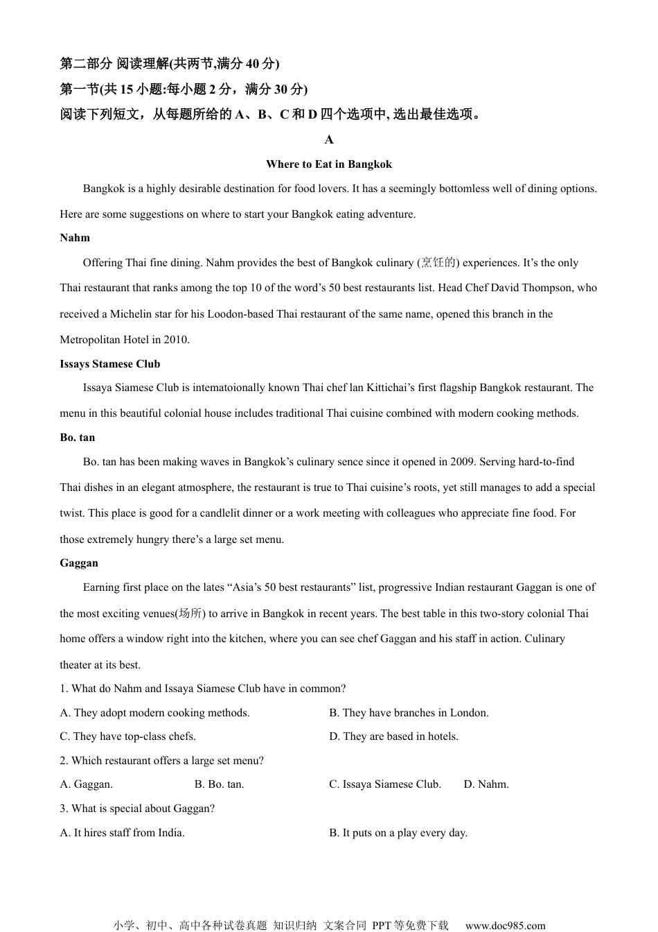 小学、初中、高中各种试卷真题知识归纳文案合同PPT等免费下载www.doc985.com2023年普通高等学校招生全国统一考试(全国甲卷)英语学科第一部分听力(共两节,满分30分)做题时,先将答案标在试卷上。录音内容结束后,你将有两分钟的时间将试卷上的答案转涂到答题卡上。第一节(共5小题;每小题1.5分,满分1.5分)听下面5段对话。每段对话后有一个小题,从题中所给的A、B、C三个选项中选出最佳选项。听完每段对话后,你都有10秒钟的时间来回答有关小题和阅读下一小题。每段对话仅读一遍。1.Wheredoestheconversationprobablytakeplace?A.Inthebookstore.B.Intheregisteroffice.C.Inthedormbuilding.2.Whatistheweatherlikenow?A.Sunny.B.Cloudy.C.Rainy.3.Whatdoesthemanwanttodoontheweekend?A.Dosomegardening.B.Haveabarbecue.C.Gofishing.4.Whatarethespeakerstalkingabout?A.Anewoffice.B.Achangeoftheirjobs.C.Aformercolleague.5.WhatdoweknowaboutAndrew?A.He’soptimistic.B.He’sactive.C.He’sshy.第二节(共15小题;每小题1.5分,满分22.5分)听下面5段对话或独白。每段对话或独白后有几个小题,从题中所给的A、B、C三个选项中选出最佳选项。听每段对话或独白前,你将有时间阅读各个小题,每小题5秒钟;听完后,各小题将给出5秒钟的作答时间,每段对话或独白读两遍。听第6段材料,回答第6、7题。6.Whichofthefollowingdoesthewomandislike?A.Thebedroom.B.Thesittingroom.C.Thekitchen.7.Whatdoesthewomansuggesttheydonext?A.Gotoanotheragency.B.Seesomeotherflats.C.Visittheneighbours.听第7段材料,回答第8、9题。8.Whatisthemandoing?A.He’smakingaphonecall.小学、初中、高中各种试卷真题知识归纳文案合同PPT等免费下载www.doc985.comB.He’schairingameeting.C.He’shostingaprogram.9.WhatmakesMrs.JohnsonworriedaboutherdaughterinAfrica?A.Lackofmedicalsupport.B.Inconvenienceofcommunication.C.Poortransportationsystem.听第8段材料,回答第10至12题。10.Whatpositiondoesthemanapplyfor?A.Asalesperson.B.Anengineer.C.Anaccountant.11.Whichaspectofthecompanyappealstotheman?A.Thecompanyculture.B.Thefreeaccommodations.C.Thecompetitivepay.12.Whatisdifficultforthemantodealwith?A.Interpersonalrelationships.B.Quality-quantitybalance.C.Unplannedhappenings.听第9段材料,回答第13至16题。13.HowdoesRobertsoundwhenspeakingofhisbeingawriter?A.Hopeful.B.Grateful.C.Doubtful.14.WhatwasRobertlikebeforehewas9yearsold?A.Hehadwildimagination.B.Heenjoyedsports.C.Helovedscience.15.WhatdidRobert’sfatherdo?A.Ateacher.B.Acoach.C.Alibrarian.16.WhathelpedRobertbecomeawriter?A.Writingdaily.B.Listeningtostories.C.Readingextensively.听第10段材料,回答第17至20题。17.WherewasOpenTchaikovskyCompetitionheldin1986?A.InMoscow.B.InChelyabinsk.C.InBerlin.18.WhatdoesMaximsayaboutthecompetitionheattendedat10?A.Itinspiredmanyyoungmusicians.B.Itwasthemusiceventofhisdreams.C.Itwasalife-changingexperience.19.Whichkindofmusicaretheyoungplayersrequiredtoplay?A.Rockmusic.B.Popmusic.C.Classicalmusic.20.WhatdoesMaximvaluemostinyoungplayers’performance?A.Expressiveness.B.Smoothness.C.Completeness.小学、初中、高中各种试卷真题知识归纳文案合同PPT等免费下载www.doc985.com第二部分阅读理解(共两节,满分40分)第一节(共15小题:每小题2分,满分30分)阅读下列短文,从每题所给的A、B、C和D四个选项中,选出最佳选项。AWheretoEatinBangkokBangkokisahighlydesirabledestinationforfoodlovers.Ithasaseeminglybottomlesswellofdiningoptions.HerearesomesuggestionsonwheretostartyourBangkokeatingadventure.NahmOfferingThaifinedining.NahmprovidesthebestofBangkokculinary(烹饪的)experiences.It’stheonlyThairestaurantthatranksamongthetop10oftheword’s50bestrestaurantslist.HeadChefDavidThompson,whore...