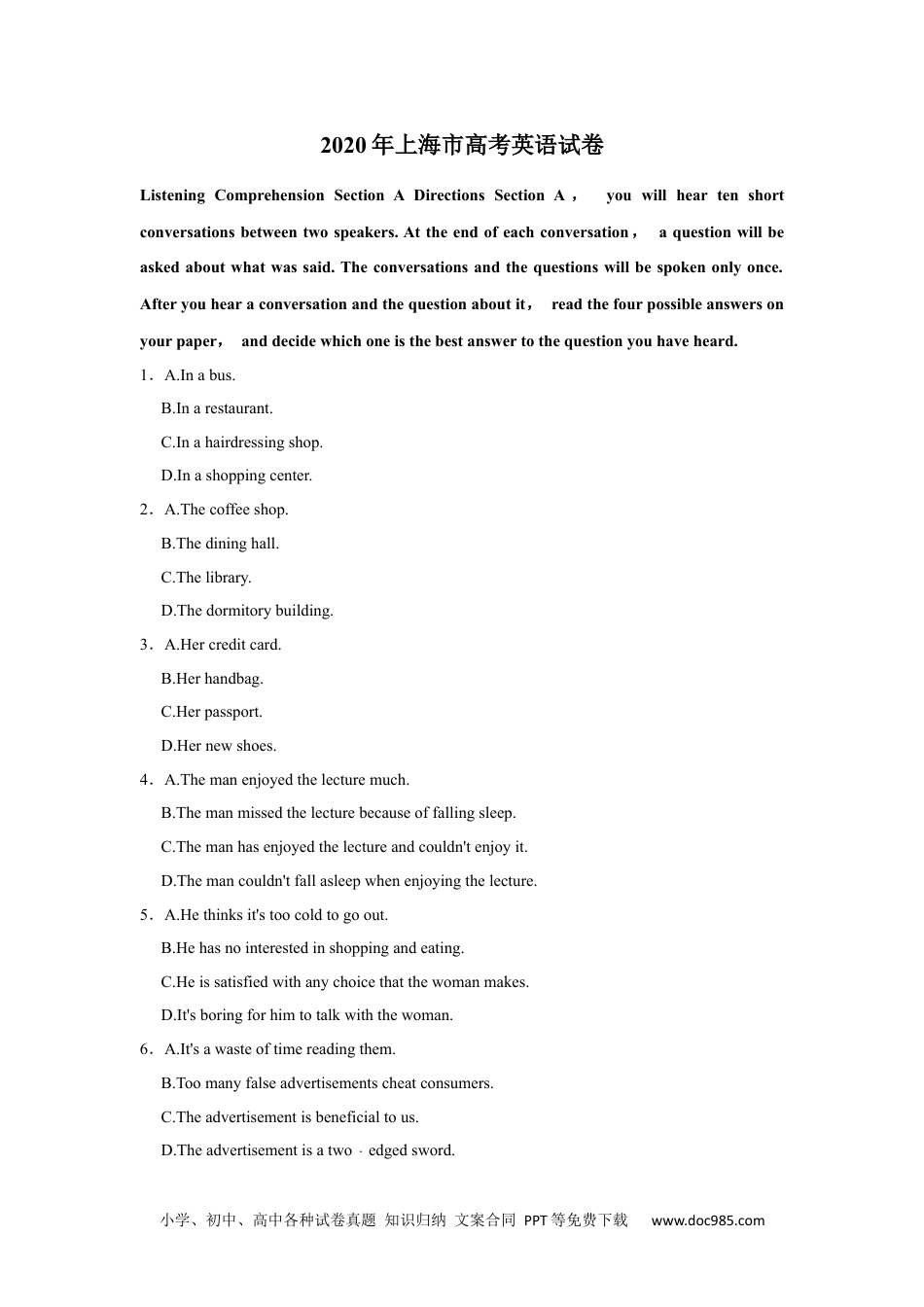 小学、初中、高中各种试卷真题知识归纳文案合同PPT等免费下载www.doc985.com2020年上海市高考英语试卷ListeningComprehensionSectionADirectionsSectionA,youwillheartenshortconversationsbetweentwospeakers.Attheendofeachconversation,aquestionwillbeaskedaboutwhatwassaid.Theconversationsandthequestionswillbespokenonlyonce.Afteryouhearaconversationandthequestionaboutit,readthefourpossibleanswersonyourpaper,anddecidewhichoneisthebestanswertothequestionyouhaveheard.1.A.Inabus.B.Inarestaurant.C.Inahairdressingshop.D.Inashoppingcenter.2.A.Thecoffeeshop.B.Thedininghall.C.Thelibrary.D.Thedormitorybuilding.3.A.Hercreditcard.B.Herhandbag.C.Herpassport.D.Hernewshoes.4.A.Themanenjoyedthelecturemuch.B.Themanmissedthelecturebecauseoffallingsleep.C.Themanhasenjoyedthelectureandcouldn'tenjoyit.D.Themancouldn'tfallasleepwhenenjoyingthelecture.5.A.Hethinksit'stoocoldtogoout.B.Hehasnointerestedinshoppingandeating.C.Heissatisfiedwithanychoicethatthewomanmakes.D.It'sboringforhimtotalkwiththewoman.6.A.It'sawasteoftimereadingthem.B.Toomanyfalseadvertisementscheatconsumers.C.Theadvertisementisbeneficialtous.D.Theadvertisementisatwoedgedsword.﹣小学、初中、高中各种试卷真题知识归纳文案合同PPT等免费下载www.doc985.com7.A.Hefeelsregretfulaboutit.B.Inspiteoflackingtimetowander,itiscolorful.C.Comparedwithhisexpectation,itisdisappointing.D.Heisverysatisfiedwithit.8.A.Hecouldn'tattendherbirthdaypartyfortheschoolcharitysale.B.HewillcometodinnerintimeinthenextSaturday.C.Hewantstoinvitethewomantotheschoolcharitysale.D.Hehasnomoneytobuyabirthdaygiftforthewoman.9.A.Hethinksthepillisuselessforhiscough.B.Hecouldn'tfindanypillinhishome.C.Heiscomplainingthewomanofherbadsuggestion.D.Hewilltakesomepillsrightnow.10.A.Hismomhaswaitedforonehourtotalkwithhim.B.Heandhismomhavenothingtotalkaboutit.C.Hespendslongtimechattingonthephonetohismom.D.Herarelytalkstohismomforalongtime.SectionBDirections:InSectionB,youwillheartwoshortpassagesandonelongerconversation,andyouwillbeaskedseveralquestionsoneachoftheshortpassagesandthelongerconversation.Theshortpassagesandthelongerconversationwillbereadtwice,butthequestionswillbespokenonlyonce.Whenyouhearaquestion,readthefourpossibleanswersonyourpaperanddecidewhichoneisthebestanswertothequestionyouhaveheard.11.(1)A.Theirpriceistoohightoaffordforthepoor.B.Thelocalresidentscangrowvegetablesandfruitsbythemselves.C.Theyarenotnutritiousandveryhardtoprepare.D.Theyarenotprettyenoughtobedisplayedonstoreshelves.(2)A.Thecompanycollectsprettyfruitsandvegetablestoearnmoremoney.B.Thecompanycollectsuglyfoodsandsellsthemtolocalresidentsatadiscount.C.Thecompanythinksthattheuglyfoodsarenotashealthyasthefreshfoods.D.Thecompanyownsalotofchainsupermarketsandcarryuglyfoods.(3)A.Refusingfoodwastingandcallforenvironmentalprotection.小学、初中、高中各种试卷真题知识归纳文案合同PPT等免费下载www.doc985.comB.Givingsomehelptopoorfarmers.D.Store'saddresschoosingandpricefixingforchainsupermarkets.D.Theimportanceofdisplay.12.(1)A.1million.B.1billion.C.10million.D.10billion.(2)A.Plantingatreeforeveryman,woman,andchild.B.Plantingnewwoodlandtoprovidemoregreenareas.C.Engagingpeopleintheirnaturalenvironmentandimplantingtrees.D.Bringingexistingwoodlandintomanagement.(3)A.Makingnaturalenvironmentskeeppacewitheconomicdevelopments.B.Makingairpollutionreducedandprotectingagainstnoisepollution.C.Reduci...