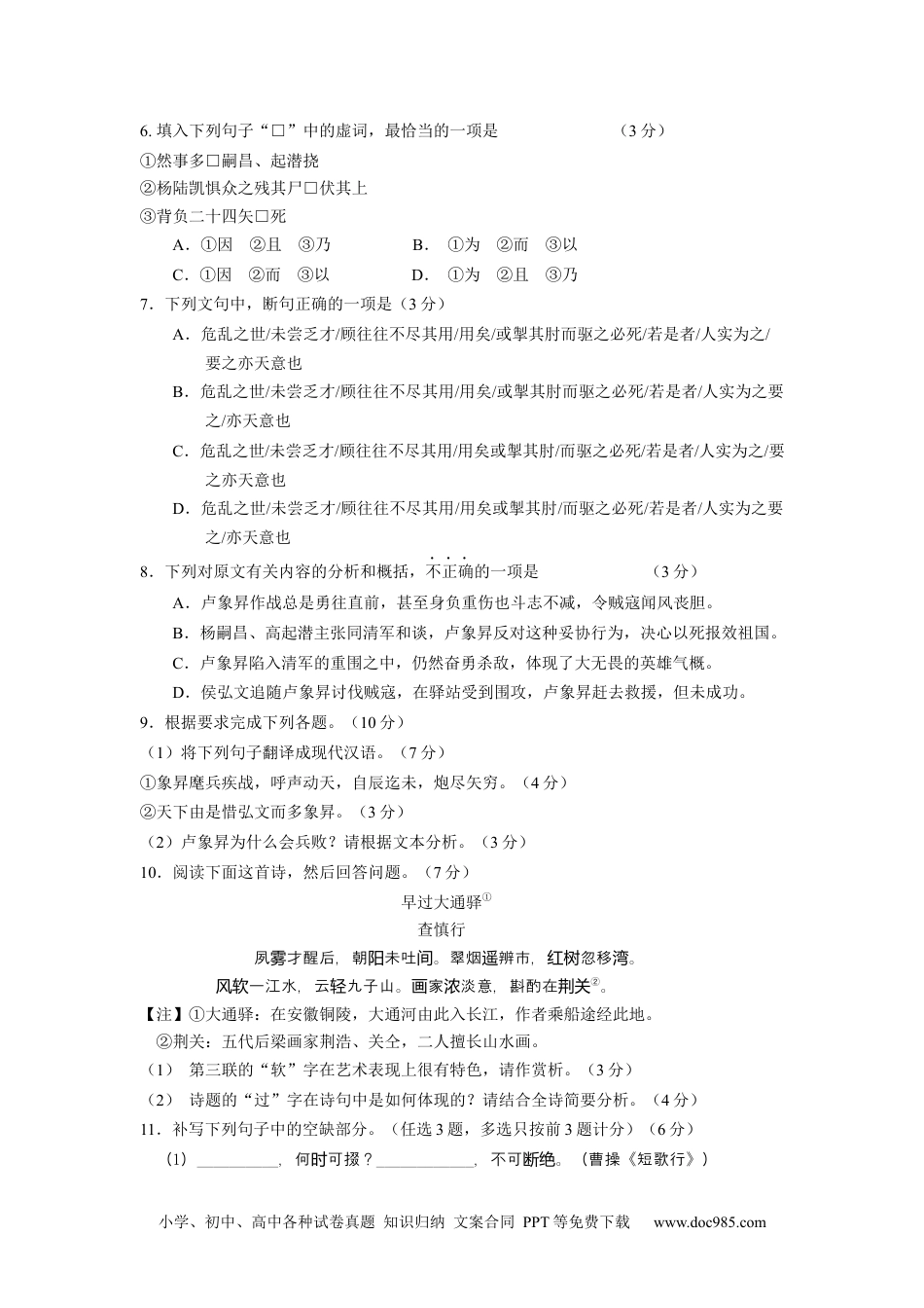 小学、初中、高中各种试卷真题知识归纳文案合同PPT等免费下载www.doc985.com2015年普通高等学校招生全国统一考试(广东卷)语文本试卷共8页,24小题,满分150分。考试用时150分钟。注意事项:1.答卷前,考生务必用黑色字迹的钢笔或签字笔将自己的姓名和考生号、座位号填写在答题卡上。用2B铅笔将试卷类型(A)填涂在答题卡相应位置上。将条形码横贴在答题卡右上角“条形码粘贴处”。2.选择题每小题选出答案后,用2B铅笔把答题卡上对应题目选项的答案信息点涂黑;如需改动,用橡皮擦干净后,再选涂其他答案。答案不能答在试卷上。3.非选择题必须用黑色字迹的钢笔或签字笔作答,答案必须写在答题卡各题目指定区域内相应位置上;如需改动,先划掉原来的答案,然后再写上新的答案;不准使用铅笔和涂改液。不按以上要求作答的答案无效。4.作答选做题时,请先用2B铅笔填涂选做题的题组号对应的信息点,再作答。漏涂、错涂、多涂的,答案无效。5.考生必须保持答题卡的整洁。考试结束后,将试卷和答题卡一并交回。一、本大题4小题,每小题3分,共12分。1.下列词语中加点的字,每对读音都不相同的一组是A.棱角/菱形窒息/对峙稽首/稽查B.侥幸/阻挠绚烂/驯服称职/职称C.塑料/朔风叫嚣/发酵本末倒置/倒行逆施D.延伸/筵席瓦砾/罹难挑三拣四/挑拨离间2.下面语段中画线的词语,使用不恰当的一项是石山上那些落有致的奇石以及着天下衰的石刻令人钟错记载兴止叹为观。石山的名钟字也叫得奇,一名字的由,人展了激烈的。卷入的,有名四围绕这来们开争论这场争论扬海的文人墨客,也有戎倥马偬的赳赳武夫,有还名不见经传的山野村人。无果如何,论结不容置喙的是,石山因此钟更加有名了。A.叹为观止B.戎马倥偬C.名不见经传D.不容置喙3.下列句子中,没有语病的一项是A.今年五一节前夕,发改委发出紧急通知,禁止空调厂商和经销商不得以价格战的手段进行不正当竞争。B.据报道,某市场被发现存在销售假冒伪劣产品,伪造质检报告书,管理部门将对此开展专项检查行动,进一步规范经营行为。C.随着个人计算机的广泛应用,互联网以不可阻挡之势在全世界范围内掀起了影响社会不同领域、不同层次的变革浪潮。D.打车软件为乘客和司机搭建起沟通平台,方便了市民打车,但出租车无论是否使用打车软件,均应遵守运营规则,这才能维护相关各方的合法权益和合理要求。小学、初中、高中各种试卷真题知识归纳文案合同PPT等免费下载www.doc985.com4.把下列句子组成语意连贯的语段,排序最恰当的一项是①字的分布律看,做法是得商榷的。从汉笔画统计规来这种值②不少人化字的理想目是把十以上的字化到十或不足十。认为简汉标画简画画③了增强性,那些多的非常用字是不去化好。为区别对笔画较还简为④文字的用首先要保看和的方便,要有相的晰性和性。应证读当清区别⑤但把全部到十或不足十,必增加大量的形近字,看和困。笔画减画画势给读带来难⑥其次才是,起省事。笔画简单写来A.②①④⑥⑤③B.C.D.②①⑤③④⑥④⑥②①③⑤④⑥③⑤②①二、本大题7小题,共35分。阅读下面的文言文(文中三个“□”是为考查而设),完成5—9小题。卢象昇,宜兴人。象昇虽文士,善射,娴将略。(崇祯)六年,贼流入畿辅,据西山,象昇击却之。贼走还西山,围冷水村,象昇设伏大破之。象昇每临阵,身先士卒,与贼格斗,刃及鞍勿顾,失马即步战。逐贼危崖,一贼自巅射中象昇额,象昇提刀战益疾。贼骇走,相戒曰:“卢廉使遇即死,不可犯。”(十年)九月,清兵驻与牛兰。召宣、大、山西三总兵杨国柱、王朴、虎大威入卫。赐象昇尚方剑,督天下援兵。象昇麻衣草履,誓师及郊。当是时,嗣昌、起潜①主和议。象昇闻之,顿足叹曰:“予受国恩,恨不得死所,有如万分一不幸,宁捐躯断脰耳。”决策议战,然事多□嗣昌、起潜挠。疏请分兵,则议宣、大、山西三帅属象昇,关、宁诸路属起潜。象昇名督天下兵,实不及二万。次顺义。清兵南下,三路出师······象昇提残卒,宿三宫野外。十二月十一日,进师至贾庄。起潜拥关、宁兵在鸡泽,距贾庄五十里,象昇遣廷麟往乞援,不应。师至蒿水桥,遇清兵。象昇将中军,大威帅左,国柱...