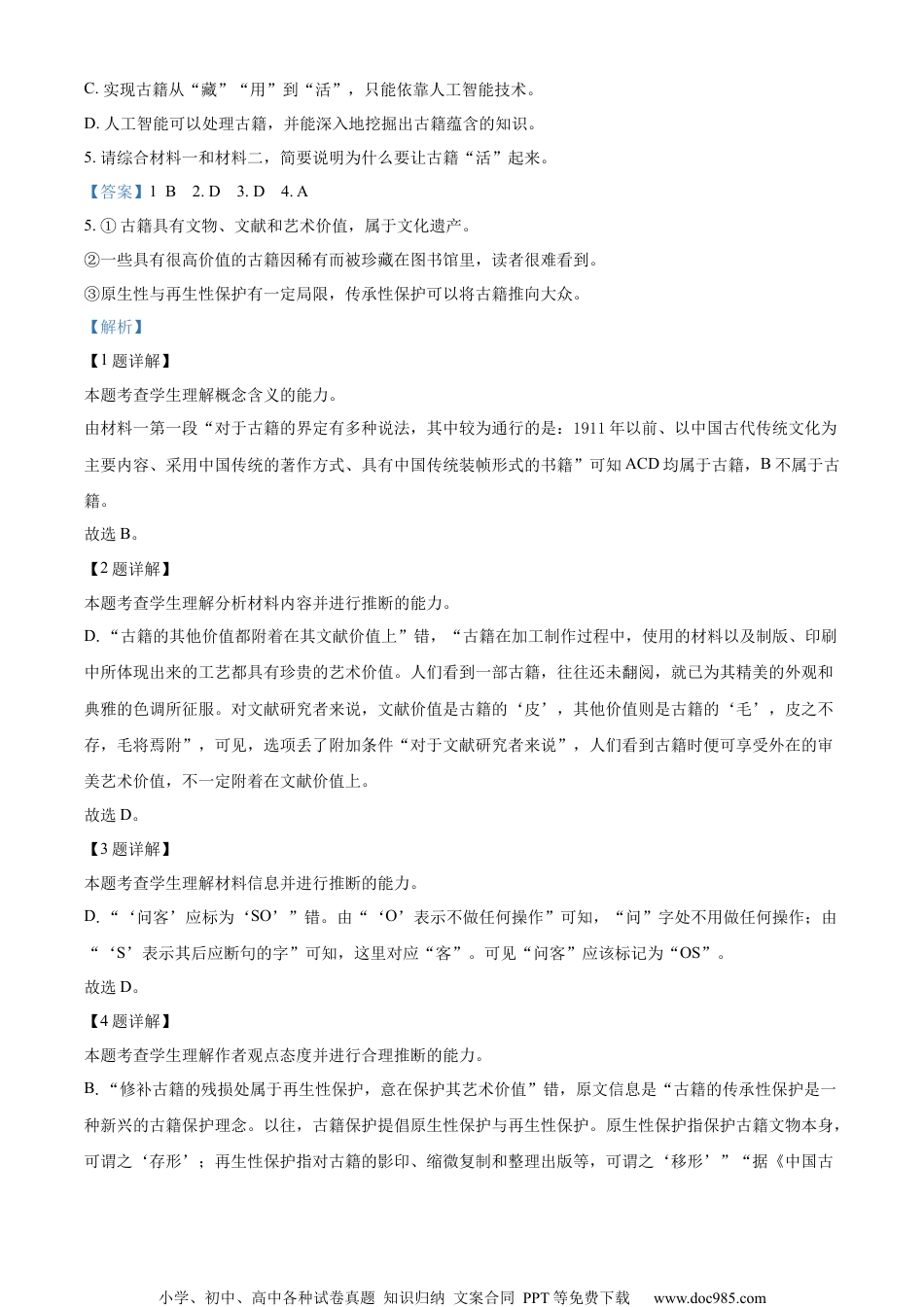 小学、初中、高中各种试卷真题知识归纳文案合同PPT等免费下载www.doc985.com2022年普通高等学校招生全国统一考试(北京卷)语文本试卷共10页,150分。考试时长150分钟。考生务必将答案答在答题卡上,在试卷上作答无效。考试结束后,将本试卷和答题卡一并交回。一、本大题共5小题,共18分。阅读下面材料,完成下面小题。材料一屠呦呦从葛洪的《肘后备急方》中获得了新思路,提取出青蒿素,荣获了诺贝尔生理学或医学奖。这让世界看到了中国古籍的惊人价值。对于古籍的界定有多种说法,其中较为通行的是:1911年以前、以中国古代传统文化为主要内容、采用中国传统的著作方式、具有中国传统装帧形式的书籍。古籍的类型除了大量的汉文古籍,还有丰富的民族文字古籍。近年来,随着传统文化热的兴起,认识和了解古籍成为一种需求。古籍的价值是多重的。古籍的载体材料主要包括纸张、织物和墨。这三种材料由于产生或制作的年代不同,具有鲜明的时代特征,比如元代以前印书主要用麻纸、皮纸,明代以后大量用竹纸,通过载体材料体现出的文物价值显而易见。浩瀚的古代文献记载着中华民族五千年绵延不断的文明,为了解先人的政治、文化、制度、风俗等提供了重要的资料。这就是古籍的文献价值。古籍在加工制作过程中,使用的材料以及制版、印刷中所体现出来的工艺都具有珍贵的艺术价值。人们看到一部古籍,往往还未翻阅,就已为其精美的外观和典雅的色调所征服。对文献研究者来说,文献价值是古籍的“皮”,其他价值则是古籍的“毛”,皮之不存,毛将焉附。据《中国古籍总目》著录,存世古籍总量大约有20万种。其中一些珍贵的古籍具有很高的文物价值、文献价值和艺术价值。这些珍贵古籍不仅包括全本,还包括具有重要历史文献价值的残本、散页等。元代及元代以前版印、抄写的古籍已万不存一,流传至今者是我国现存古籍中最珍贵的文化遗产。这些古籍非常稀有,很多作为文物被珍藏在图书馆,读者很难一睹其庐山真面目。(取材于李致忠、梁爱民等的相关文章)材料二古籍的传承性保护是一种新兴的古籍保护理念。以往,古籍保护提倡原生性保护与再生性保护。原生性保护指保护古籍文物本身,可谓之“存形”;再生性保护指对古籍的影印、缩微复制和整理出版等,可谓之“移形”。不过,这两种方式主要解决古籍“藏”与“用”的问题,而古籍的“藏”与“用”长期局限在特定的机构与学者群体中,未能引起普通大众的广泛注意。传承性保护则是利用各种更易于接受的方式将古籍推向大众,让古籍“活”起来,实现古籍从“藏”到“用”最后至“活”的飞跃。人工智能技术的发展为这一飞跃提供了条件。人工智能处理古籍的过程大体包含四步:首先,将古籍小学、初中、高中各种试卷真题知识归纳文案合同PPT等免费下载www.doc985.com扫描并处理成图像文件。其次,通过光学字符识别技术,将图像文件中的文字识别为计算机可处理的电子文本。再次,通过自然语言处理技术,对所获取的文本进行基础性加工,包括自动断句、标点以及词语切分等。最后,识别并抽取文本中的专名(如人名、地名、书名)等概念与知识,为后续深入的古籍知识挖掘提供基础性支撑。目前,研究者引入序列标注模型,在计算机自动断句、标点、专名识别等领域都取得了很好的效果。所谓序列标注,即输入字符串,预测每个字符在该位置的专名属性以及是否在该位置断句。例如,输入“论语云管氏而知礼孰不知礼”,模型应预测为“(B-BOOK)(E-BOOK)S(B-PER)(E-PER)OOSOOOO”,其中,“B-BOOK”表示书名开头的字,这里指“论”;“E-BOOK”表示书名结尾的字,这里指“语”;“S”表示其后应断句的字,这里对应“云”和第一个“礼”;“B-PER”表示人名开头的字,这里指“管”;“E-PER”表示人名结尾的字,这里指“氏”;“O”表示不做任何操作。每一个字都对应一个或一组符号。研究者通过多种机器学习模型,训练计算机自动标注文本序列的能力,进而使其完成自动断句、标点、专名识别等任务。模型预测的综合准确率均达到90%以上。由此,海量的典籍就可以转化为数字化、结构化的文本,从而降低普通人阅读古籍的难度,实现互联网环境下古籍的传承性保护。让...