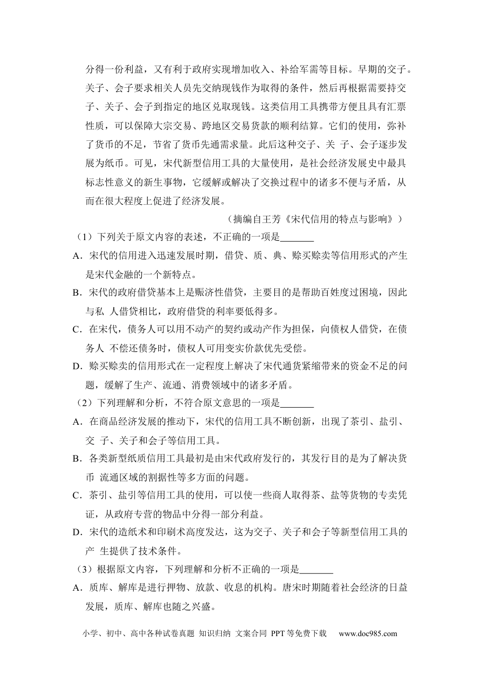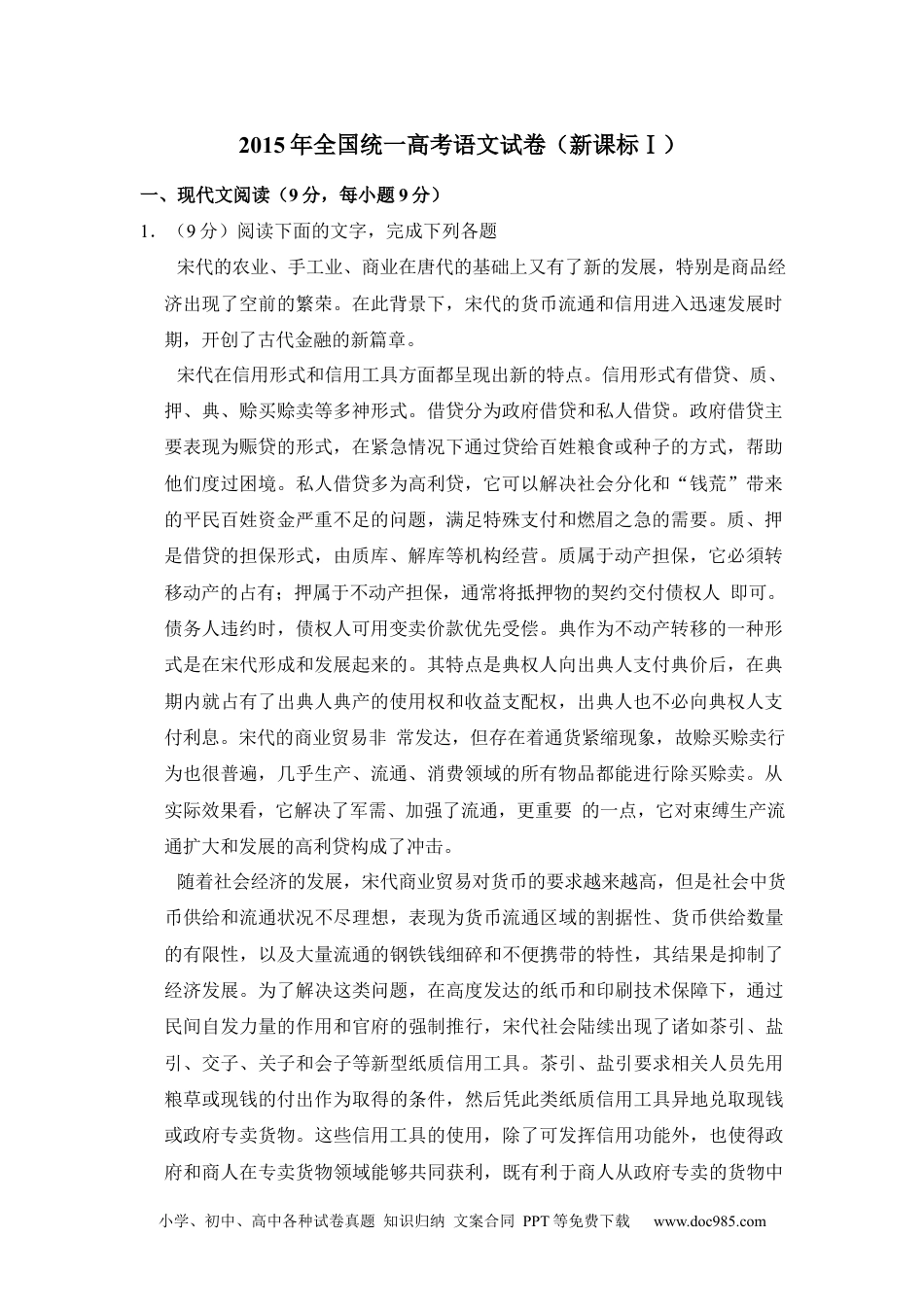 小学、初中、高中各种试卷真题知识归纳文案合同PPT等免费下载www.doc985.com2015年全国统一高考语文试卷(新课标Ⅰ)一、现代文阅读(9分,每小题9分)1.(9分)阅读下面的文字,完成下列各题宋代的农业、手工业、商业在唐代的基础上又有了新的发展,特别是商品经济出现了空前的繁荣。在此背景下,宋代的货币流通和信用进入迅速发展时期,开创了古代金融的新篇章。宋代在信用形式和信用工具方面都呈现出新的特点。信用形式有借贷、质、押、典、赊买赊卖等多神形式。借贷分为政府借贷和私人借贷。政府借贷主要表现为赈贷的形式,在紧急情况下通过贷给百姓粮食或种子的方式,帮助他们度过困境。私人借贷多为高利贷,它可以解决社会分化和“钱荒”带来的平民百姓资金严重不足的问题,满足特殊支付和燃眉之急的需要。质、押是借贷的担保形式,由质库、解库等机构经营。质属于动产担保,它必須转移动产的占有;押属于不动产担保,通常将抵押物的契约交付债权人即可。债务人违约时,债权人可用变卖价款优先受偿。典作为不动产转移的一种形式是在宋代形成和发展起来的。其特点是典权人向出典人支付典价后,在典期内就占有了出典人典产的使用权和收益支配权,出典人也不必向典权人支付利息。宋代的商业贸易非常发达,但存在着通货紧缩现象,故赊买赊卖行为也很普遍,几乎生产、流通、消费领域的所有物品都能进行除买赊卖。从实际效果看,它解决了军需、加强了流通,更重要的一点,它对束缚生产流通扩大和发展的高利贷构成了冲击。随着社会经济的发展,宋代商业贸易对货币的要求越来越高,但是社会中货币供给和流通状况不尽理想,表现为货币流通区域的割据性、货币供给数量的有限性,以及大量流通的钢铁钱细碎和不便携带的特性,其结果是抑制了经济发展。为了解决这类问题,在高度发达的纸币和印刷技术保障下,通过民间自发力量的作用和官府的强制推行,宋代社会陆续出现了诸如茶引、盐引、交子、关子和会子等新型纸质信用工具。茶引、盐引要求相关人员先用粮草或现钱的付出作为取得的条件,然后凭此类纸质信用工具异地兑取现钱或政府专卖货物。这些信用工具的使用,除了可发挥信用功能外,也使得政府和商人在专卖货物领域能够共同获利,既有利于商人从政府专卖的货物中小学、初中、高中各种试卷真题知识归纳文案合同PPT等免费下载www.doc985.com分得一份利益,又有利于政府实现增加收入、补给军需等目标。早期的交子。关子、会子要求相关人员先交纳现钱作为取得的条件,然后再根据需要持交子、关子、会子到指定的地区兑取现钱。这类信用工具携带方便且具有汇票性质,可以保障大宗交易、跨地区交易货款的顺利结算。它们的使用,弥补了货币的不足,节省了货币先通需求量。此后这种交子、关子、会子逐步发展为纸币。可见,宋代新型信用工具的大量使用,是社会经济发展史中最具标志性意义的新生事物,它缓解或解决了交换过程中的诸多不便与矛盾,从而在很大程度上促进了经济发展。(摘编自王芳《宋代信用的特点与影响》)(1)下列关于原文内容的表述,不正确的一项是A.宋代的信用进入迅速发展时期,借贷、质、典、赊买赊卖等信用形式的产生是宋代金融的一个新特点。B.宋代的政府借贷基本上是赈济性借贷,主要目的是帮助百姓度过困境,因此与私人借贷相比,政府借贷的利率要低得多。C.在宋代,债务人可以用不动产的契约或动产作为担保,向债权人借贷,在债务人不偿还债务时,债权人可用变实价款优先受偿。D.赊买赊卖的信用形式在一定程度上解决了宋代通货紧缩带来的资金不足的问题,缓解了生产、流通、消费领域中的诸多矛盾。(2)下列理解和分析,不符合原文意思的一项是A.在商品经济发展的推动下,宋代的信用工具不断创新,出现了茶引、盐引、交子、关子和会子等信用工具。B.各类新型纸质信用工具最初是由宋代政府发行的,其发行目的是为了解决货币流通区域的割据性等多方面的问题。C.茶引、盐引等信用工具的使用,可以使一些商人取得茶、盐等货物的专卖凭证,从政府专营的物品中分得一部分利益。D.宋代的造纸术和印刷术高度发达,这为交子、关子和会子等新型信用工具的产生提供了技...