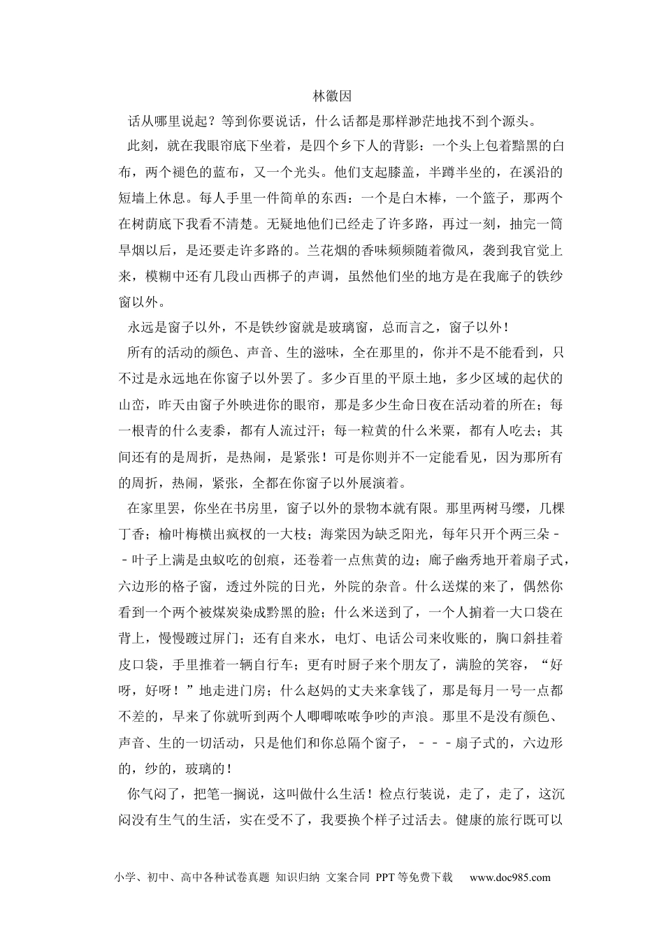 小学、初中、高中各种试卷真题知识归纳文案合同PPT等免费下载www.doc985.com2017年全国统一高考语文试卷(新课标Ⅱ)一、现代文阅读(35分)论述类文本阅读1.(9分)阅读下面的文字,完成下列各题。青花瓷发展的黄金时代是明朝永乐、宣德时期,与郑和下西洋在时间上重合这不能不使我们思考:航海与瓷器同时达到鼎盛,仅仅是历史的偶然吗?从历史事实来看,郑和下西洋为青花瓷的迅速崛起提供了历史契机。近三十年的航海历程推动了作为商品的青花瓷的大量生产与外销,不仅促进技术创新,使青花瓷达到瓷器新工艺的顶峰,而且改变了中国瓷器发展的走向,带来了人们审美观念的更新。这也就意味着,如果没有郑和远航带来活跃的对外贸易,青花瓷也许会像在元代一样,只是中国瓷器的诸多品种之一,而不会成为主流,更不会成为中国瓷器的代表。由此可见,青花瓷崛起是郑和航海时代技术创新与文化交融的硕果,中外交往的繁盛在推动文明大交融的同时,也推动了生产技术与文化艺术的创新发展。作为中外文明交融的结晶,青花瓷真正成为中国瓷器的主流,则是因为成化年间原料本土化带来了民窑青花瓷的崛起。民窑遍地开花,进入商业化模式之后,几乎形成了青花瓷一统天下的局面。一种海外流行的时尚由此成为中国本土的时尚,中国传统的人物、花鸟、山水,与外来的伊斯兰风格融为一体,青花瓷成为中国瓷器的代表,进而走向世界,最终万里同风,成为世界时尚。一般来说,一个时代有一个时代的文化,而时尚兴盛则是社会快速变化的标志。因此,瓷器的演变之所以引人注目,还在于它与中国传统社会从单一向多元社会的转型同步。瓷器的演变与社会变迁有着千丝万缕的联系,这使我们对明代有了新的思考和认识。如果说以往人们所了解的明初是一个复兴传统的时代,其文化特征是回归传统,明初往往被认为是保守的,那么青花瓷的例子,则可以使人们对明初文化的兼容性有一个新的认识。事实上,与明代中外文明的交流高峰密切相关,明代中国正是通过与海外交流而走向开放和进步的,青花瓷的两次外销高峰就反映了这一点。第一次在亚非掀起了中国风,第二次则兴起了欧美的中国风。可见,明代不仅是中国陶瓷史上一个重大转折时期,也是中国传统社会的重要转型时期。正是中外文明的交融,小学、初中、高中各种试卷真题知识归纳文案合同PPT等免费下载www.doc985.com成功推动了中国瓷器从单色走向多彩的转型,青花瓷以独特方式昭示了明代文化的演变过程,成为中国传统社会从单一走向多元的例证。(摘编自万明《明代青花瓷崛起的轨迹》)(1)下列关于原文内容的理解和分析,正确的一项是〔3分〕A.郑和下西洋推动了瓷器生产、销售和技术创新,带来了青花瓷发展的黄金时代。B.原料本土化等因素使青花瓷发展进入新阶段,此时青花瓷与外来文化已无关系。C.明代社会往往被认为是保守的,但青花瓷的风格表明当时社会比较开放和进步。D.中外文明交融推动瓷器从单色走向多彩,从而推动了当时的社会向多元转型(2)下列对原文论证的相关分析,不正确的一项是〔3分〕A.文章第一段通过元明两代瓷器的比较,论证了瓷器发展与审美观念更新的关系。B.文章从民窑崛起、商业化和风格变化等方面论述了青花瓷成为世界时尚的过程。C.文章论述青花瓷崛起的轨迹,为中外交往推动明代社会转型的观点提供了例证。D.文章提出问题之后,分析了青花瓷崛起的原因,并论证了崛起带来的影响。(3)根据原文内容,下列说法不正确的一项是〔3分〕A.如果不是下西洋使青花瓷作为商品大量生产和外销,青花瓷可能就不会崛起B.时尚兴盛是社会快速变化的标志,可见青花瓷兴盛的成化年间社会变化很快C.青花瓷外销掀起世界性的中国风,可见青花瓷对明代的世界影响起了重要作用。D.青花瓷在明代引领了世界时尚,由此带来的启示是,应注重社会的多元和开放。二、实用文本类阅读(12分)2.(14分)阅读下面文字,完成各题。窗子以外小学、初中、高中各种试卷真题知识归纳文案合同PPT等免费下载www.doc985.com林徽因话从哪里说起?等到你要说话,什么话都是那样渺茫地找不到个源头。此刻,就在我眼帘底下坐着,是四个乡下人的背影:一个头上包着黯黑的...