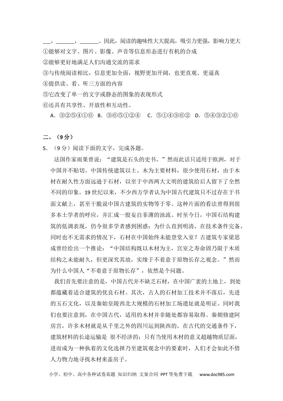 小学、初中、高中各种试卷真题知识归纳文案合同PPT等免费下载www.doc985.com2014年全国统一高考语文试卷(大纲版)一、(12分,每小题3分)1.(3分)下列词语中加横线的字,读音全都正确的一组是()A.龃龉(yǔ)系鞋带(xi)舐犊情深(shi)曲意逢迎(qū)B.倜傥(tǎng)纤维素(xiān羽扇纶巾(guān)针砭时弊(biān)C.感喟(kuì)揭疮疤(chuāng)按捺不住(nài)大相径庭(jing)D.霰弹(xiàn)涮羊肉(shuàn)以儆效尤(jǐng)纵横捭阖(bì)2.(3分)下列各句中,加横线的成语使用恰当的一项是()A.在评价某些历史人物时,我们不能只是简单地对他们盖棺论定,还应该特别注意研究他们的人生经历和思想变化轨迹.B.这把吉他是我最要好的朋友出国前存在我这里的,本来说存一年,结果朋友一直没回来,这吉他到现在巳经由我敝帚自珍了十年.C.最美的是小镇的春天,草长莺飞,风声鹤唳,走进小镇就如同置身于世外桃源,来此旅游的人一定会被这里的美丽景色深深吸引.D.这个剧院的大型话剧、歌剧等演出票价不菲,让许多有艺术爱好而又收入不高的普通人叹为观止,无法亲临现场享受艺术大餐.3.(3分)下列各句中,没有语病的一句是()A.有的人看够了城市的繁华,喜欢到一些人迹罕至的地方去游玩,但这是有风险的,近年来已经发生了多次背包客被困野山的案情.B.他家离铁路不远,小时候常常去看火车玩儿,火车每当鸣着汽笛从他身边飞驰而过时,他就很兴奋,觉得自己也被赋予了一种力量.C.新“旅游法”的颁布实施,让很多旅行社必须面对新规定带来的各种新问题,不少旅行社正从过去拼价格向未来拼服务转型的阵痛.D.哈大高铁施行新的运行计划后,哈尔滨至北京、上海等地的部分列车也将进一步压缩运行时间,为广大旅客快捷出行提供更多选择.4.(3分)依次填入下面一段文字横线处的语句,衔接最恰当的一组是()信息时代给人们带来了一种新的极其便捷的阅读方式,那就是网络阅读。网络阅读远远超越了传统的阅读概念,,,小学、初中、高中各种试卷真题知识归纳文案合同PPT等免费下载www.doc985.com,,。因此,阅读的趣味性大大提高,吸引力更强,影响力更大①能够对文字、图片、影像、声音等信息形态进行有机的合成②能够更好地满足人们沟通交流的需求③与传统阅读相比,信息更加全面,视野更加开阔,也更直观、更逼真④提供读、看、听三方面的内容⑤它改变了单一的文字或静态的图象的表现形式⑥还具有共享性、开放性和互动性。A.③②⑤④①⑥B.③⑥⑤①②④C.⑤①④③⑥②D.⑤④③②①⑥二、(9分)5.(9分)阅读下面的文字,完成各题。法国作家雨果曾说:“建筑是石头的史书。”然而此话只适用于欧洲,对于中国并不贴切。中国传统建筑以土、木为主要材料,很少使用石材,由于木材在耐久性方面远逊于石材,以至于中西两大文明的建筑给后人留下了全然不同的印象。19世纪以来,不少西方学者认为中国古代建筑只不过存在于书面文献上,甚至干脆说中国古建筑的实物等于零。这种片面的看法曾得到很多本土学者的呼应,并汇成一股妄自菲薄的浊流。时至今日,中国石结构建筑的低调表现,仍令很多学者感到困惑:为什么直到明清,在技术条件完备,同时也不无需求的情况下,石材在中国始终未能登堂入室?古建筑专家梁思成曾经给出一个推论:“中国结构既以木材为主,宫室之寿命固乃限于木质结构之未能耐久,但更深究其故,实缘于不着意于原物长存之观念。”然而为什么中国人“不着意于原物长存”,依然是个问题。我们首先要注意的是,中国古代并不缺乏石材,在中国广袤的土地上,到处都蕴藏着适合建筑的优良石材。其次,古人的石材加工技术并不落后,先进的玉石文化,以及秦始皇陵西北大规模的石材加工场遗址就是明证。同时我们也要注意到,在中国古代,适用的木材并非随处都容易取得。秦朝修建阿房宫,许多木材就是从千里之外的四川运到陕西的。在古代的交通条件下,建筑材料的长途运输是很不经济的;只有当使用木材的意义超越物质层面,进而成为一种执着的文化选择乃至建筑观念中的要素时,人们才会如此不惜人力物力地寻找木材来盖房子。小学、初中、高中...