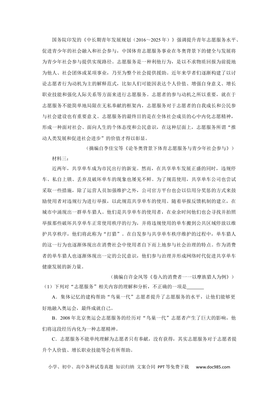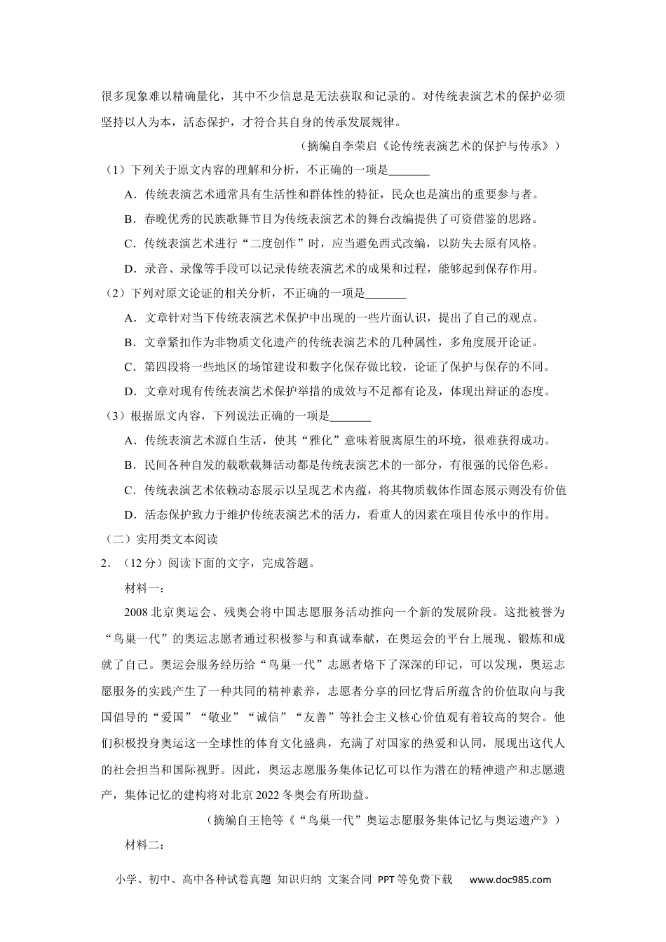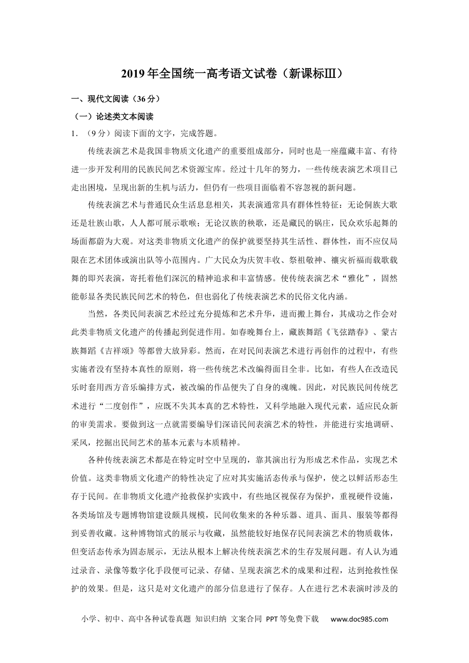 小学、初中、高中各种试卷真题知识归纳文案合同PPT等免费下载www.doc985.com2019年全国统一高考语文试卷(新课标Ⅲ)一、现代文阅读(36分)(一)论述类文本阅读1.(9分)阅读下面的文字,完成答题。传统表演艺术是我国非物质文化遗产的重要组成部分,同时也是一座蕴藏丰富、有待进一步开发利用的民族民间艺术资源宝库。经过十几年的努力,一些传统表演艺术项目已走出困境,呈现出新的生机与活力,但仍有一些项目面临着不容忽视的新问题。传统表演艺术与普通民众生活息息相关,其表演通常具有群体性特征:无论侗族大歌还是壮族山歌,人人都可展示歌喉;无论汉族的秧歌,还是藏民的锅庄,民众欢乐起舞的场面都蔚为大观。对这类非物质文化遗产的保护就要坚持其生活性、群体性,而不应仅局限在艺术团体或演出队等小范围内。广大民众为庆贺丰收、祭祖敬神、禳灾祈福而载歌载舞的即兴表演,寄托着他们深沉的精神追求和丰富情感。使传统表演艺术“雅化”,固然能彰显各类民族民间艺术的特色,但也弱化了传统表演艺术的民俗文化内涵。当然,各类民间表演艺术经过充分提炼和艺术升华,进而搬上舞台,其成功之作会对此类非物质文化遗产的传播起到促进作用。如春晚舞台上,藏族舞蹈《飞弦踏春》、蒙古族舞蹈《吉祥颂》等都曾大放异彩。然而,在对民间表演艺术进行再创作的过程中,有些实施者没有坚持本真性的原则,将一些传统艺术改编得面目全非。比如,有些人在改造民乐时套用西方音乐编排方式,被改编的作品便失了自身的魂魄。因此,对民族民间传统艺术进行“二度创作”,应既不失其本真的艺术特性,又科学地融入现代元素,适应民众新的审美需求。要做到这一点就需要编导们深谙民间表演艺术的特性,并能进行实地调研、采风,挖掘出民间艺术的基本元素与本质精神。各种传统表演艺术都是在特定时空中呈现的,靠其演出行为形成艺术作品,实现艺术价值。这类非物质文化遗产的特性决定了应对其实施活态传承与保护,使之以鲜活形态生存于民间。在非物质文化遗产抢救保护实践中,有些地区视保存为保护,重视硬件设施,各类场馆及专题博物馆建设颇具规模,民间收集来的各种乐器、道具、面具、服装等都得到妥善收藏。这种博物馆式的展示与收藏,虽然能较好地保存民间表演艺术的物质载体,但变活态传承为固态展示,无法从根本上解决传统表演艺术的生存发展问题。有人认为通过录音、录像等数字化手段便可记录、存储、呈现表演艺术的成果和过程,达到抢救性保护的效果。但是,这只是对文化遗产的部分信息进行了保存。人在进行艺术表演时涉及的小学、初中、高中各种试卷真题知识归纳文案合同PPT等免费下载www.doc985.com很多现象难以精确量化,其中不少信息是无法获取和记录的。对传统表演艺术的保护必须坚持以人为本,活态保护,才符合其自身的传承发展规律。(摘编自李荣启《论传统表演艺术的保护与传承》)(1)下列关于原文内容的理解和分析,不正确的一项是A.传统表演艺术通常具有生活性和群体性的特征,民众也是演出的重要参与者。B.春晚优秀的民族歌舞节目为传统表演艺术的舞台改编提供了可资借鉴的思路。C.传统表演艺术进行“二度创作”时,应当避免西式改编,以防失去原有风格。D.录音、录像等手段可以记录传统表演艺术的成果和过程,能够起到保存作用。(2)下列对原文论证的相关分析,不正确的一项是A.文章针对当下传统表演艺术保护中出现的一些片面认识,提出了自己的观点。B.文章紧扣作为非物质文化遗产的传统表演艺术的几种属性,多角度展开论证。C.第四段将一些地区的场馆建设和数字化保存做比较,论证了保护与保存的不同。D.文章对现有传统表演艺术保护举措的成效与不足都有论及,体现出辩证的态度。(3)根据原文内容,下列说法正确的一项是A.传统表演艺术源自生活,使其“雅化”意味着脱离原生的环境,很难获得成功。B.民间各种自发的载歌载舞活动都是传统表演艺术的一部分,有很强的民俗色彩。C.传统表演艺术依赖动态展示以呈现艺术内蕴,将其物质载体作固态展示则没有价值D.活态保护致力于维护传统表演艺术的活力,看重人的因素在项目传承中的作用。(二)实用类文本...