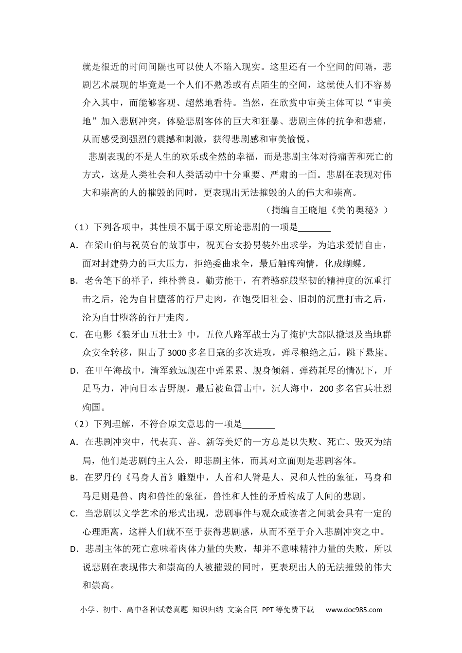 小学、初中、高中各种试卷真题知识归纳文案合同PPT等免费下载www.doc985.com2014年全国统一高考语文试卷(新课标Ⅰ)一、现代文阅读(9分)1.(9分)阅读下面的文字,完成各题。悲剧产生于社会的矛盾、两种社会力量的冲突。冲突双方分别代表着真与假善与恶、新与旧等对立的两极,却总是以代表真、善、新等美好的一方的失败、死亡、毁灭为结局,他们是悲剧的主人公。因为他们的力量还比较弱小,还无法与强大的旧势力或邪恶力量抗衡,正义的要求不能实现,于是形成了悲剧。古希腊学者亚里士多德指出,悲剧描写了比现实中更美好同时又是“与我们相似的”人物,通过他们的毁灭“引起怜悯和恐惧来使感情得到陶冶”,即产生净化的作用。然而,悲剧不仅表现冲突与毁灭,而且表现抗争与拼搏,这是悲剧具有审美价值的最根本的原因。鲁迅说过:“悲剧将人生的有价值的东西毁灭给人看”。这种毁灭是抗争、拼搏以后的毁灭,抗争与拼搏体现了人的一种精神。古希腊神话中普罗米修斯为了人类从天上盗取火种,触怒了主神宙斯,被锁在高加索山崖上,每日遭神鹰啄食肝脏,但普罗米修斯毫不屈服,最后坠入深渊。罗丹的大理石雕塑《马身人首》中,人臂绝望地扑向一个它所抓不到的目标,而马足则陷于尘土不能自拔,表现出人性与兽性的冲突,象征着灵与肉的斗争,具有强烈的悲剧性。可以说,没有抗争就没有悲剧,冲突、抗争与毁灭是构成悲剧的三个主要因素。悲剧的审美价值的载体只能是文学艺术。因为人生有价值的东西、美好事物的毁灭是令人伤悲的,因此现实中的悲剧不能作为直接的审美对象来欣赏,否则人就是泯灭了人性的人了。现实中的悲剧只能激起人的同情、义愤,迫使人采取严肃的伦理态度和实践行动。民主革命时期,在演出歌剧《白毛女》的过程中,曾多次出现扮演地主黄世仁的演员被打甚至险遭枪击的事件,这是人们以实际的道德评价代替了审美活动。现实的悲剧只在客观上具有悲剧的审美性质,它们必须以文学艺术的形式表现出来,才能成为欣赏的对象,美学上所谓的“以悲为美”才能实现。悲剧成为审美对象只能以文学艺术的形式出现,原因在于它需要建立悲剧事件与人的心理距离。不仅遥远的时间会使过去的现实悲剧的悲惨因素淡化,小学、初中、高中各种试卷真题知识归纳文案合同PPT等免费下载www.doc985.com就是很近的时间间隔也可以使人不陷入现实。这里还有一个空间的间隔,悲剧艺术展现的毕竟是一个人们不熟悉或有点陌生的空间,这就使人们不容易介入其中,而能够客观、超然地看待。当然,在欣赏中审美主体可以“审美地”加入悲剧冲突,体验悲剧客体的巨大和狂暴、悲剧主体的抗争和悲痛,从而感受到强烈的震撼和刺激,获得悲剧感和审美愉悦。悲剧表现的不是人生的欢乐或全然的幸福,而是悲剧主体对待痛苦和死亡的方式,这是人类社会和人类活动中十分重要、严肃的一面。悲剧在表现对伟大和崇高的人的摧毁的同时,更表现出无法摧毁的人的伟大和崇高。(摘编自王晓旭《美的奥秘》)(1)下列各项中,其性质不属于原文所论悲剧的一项是A.在梁山伯与祝英台的故事中,祝英台女扮男装外出求学,为追求爱情自由,面对封建势力的巨大压力,拒绝委曲求全,最后触碑殉情,化成蝴蝶。B.老舍笔下的祥子,纯朴善良,勤劳能干,有着骆驼般坚韧的精神度的沉重打击之后,沦为自甘堕落的行尸走肉。在饱受旧社会、旧制的沉重打击之后,沦为自甘堕落的行尸走肉。C.在电影《狼牙山五壮士》中,五位八路军战士为了掩护大部队撤退及当地群众安全转移,阻击了3000多名日寇的多次进攻,弹尽粮绝之后,跳下悬崖。D.在甲午海战中,清军致远舰在中弹累累、舰身倾斜、弹药耗尽的情况下,开足马力,冲向日本吉野舰,最后被鱼雷击中,沉人海中,200多名官兵壮烈殉国。(2)下列理解,不符合原文意思的一项是A.在悲剧冲突中,代表真、善、新等美好的一方总是以失败、死亡、毁灭为结局,他们是悲剧的主人公,即悲剧主体,而其对立面则是悲剧客体。B.在罗丹的《马身人首》雕塑中,人首和人臂是人、灵和人性的象征,马身和马足则是兽、肉和兽性的象征,兽性和人性的矛盾构成了人间的悲剧。C.当悲剧以文学艺术的形式出现,悲剧...