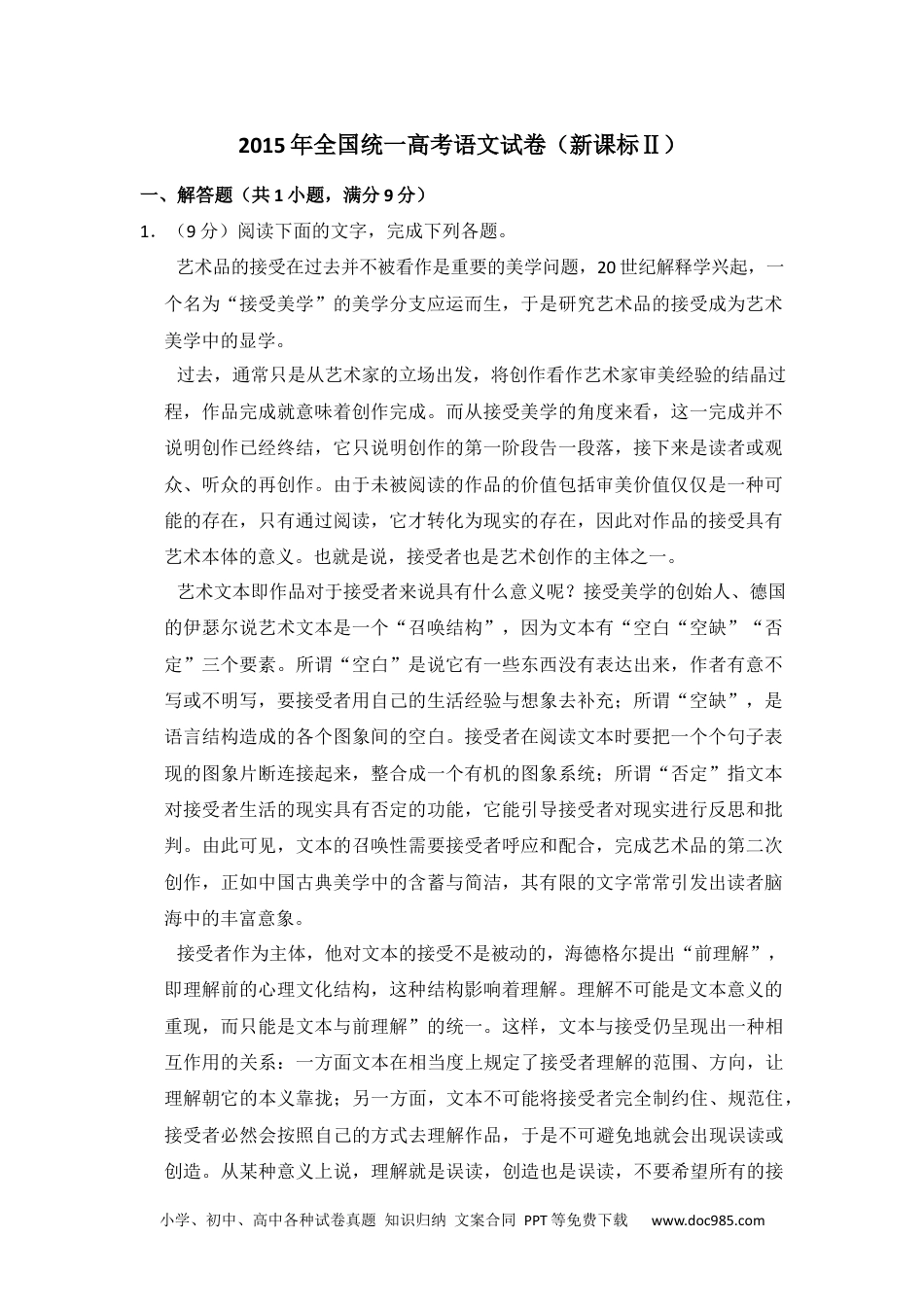 小学、初中、高中各种试卷真题知识归纳文案合同PPT等免费下载www.doc985.com2015年全国统一高考语文试卷(新课标Ⅱ)一、解答题(共1小题,满分9分)1.(9分)阅读下面的文字,完成下列各题。艺术品的接受在过去并不被看作是重要的美学问题,20世纪解释学兴起,一个名为“接受美学”的美学分支应运而生,于是研究艺术品的接受成为艺术美学中的显学。过去,通常只是从艺术家的立场出发,将创作看作艺术家审美经验的结晶过程,作品完成就意味着创作完成。而从接受美学的角度来看,这一完成并不说明创作已经终结,它只说明创作的第一阶段告一段落,接下来是读者或观众、听众的再创作。由于未被阅读的作品的价值包括审美价值仅仅是一种可能的存在,只有通过阅读,它才转化为现实的存在,因此对作品的接受具有艺术本体的意义。也就是说,接受者也是艺术创作的主体之一。艺术文本即作品对于接受者来说具有什么意义呢?接受美学的创始人、德国的伊瑟尔说艺术文本是一个“召唤结构”,因为文本有“空白“空缺”“否定”三个要素。所谓“空白”是说它有一些东西没有表达出来,作者有意不写或不明写,要接受者用自己的生活经验与想象去补充;所谓“空缺”,是语言结构造成的各个图象间的空白。接受者在阅读文本时要把一个个句子表现的图象片断连接起来,整合成一个有机的图象系统;所谓“否定”指文本对接受者生活的现实具有否定的功能,它能引导接受者对现实进行反思和批判。由此可见,文本的召唤性需要接受者呼应和配合,完成艺术品的第二次创作,正如中国古典美学中的含蓄与简洁,其有限的文字常常引发出读者脑海中的丰富意象。接受者作为主体,他对文本的接受不是被动的,海德格尔提出“前理解”,即理解前的心理文化结构,这种结构影响着理解。理解不可能是文本意义的重现,而只能是文本与前理解”的统一。这样,文本与接受仍呈现出一种相互作用的关系:一方面文本在相当度上规定了接受者理解的范围、方向,让理解朝它的本义靠拢;另一方面,文本不可能将接受者完全制约住、规范住,接受者必然会按照自己的方式去理解作品,于是不可避免地就会出现误读或创造。从某种意义上说,理解就是误读,创造也是误读,不要希望所有的接小学、初中、高中各种试卷真题知识归纳文案合同PPT等免费下载www.doc985.com受者都持同样的理解,也不要希望所有的理解都与艺术家的本旨一致,那样并不意味着艺术作品的成功。文本一经产生就成为历史,它所表达的思想感情、所反映的生活,都只能是过去的,而理解总是现在进行时。当我们接受历史上的艺术作品时,我们当然可以设身处地想象古人的生活,体验古人的思想感情,但我们毕竞是现代人,只能按照我们现在的心理文化结构去理解古人。当然,任何理解都只能是个体的理解,但个体毕竞是与群体相通的,所以个体的理解中也有普遍性。理解作为现实的行为具有通向实践的品格,艺术品正是通过理解走向现实,并在生活中发挥作用的,不是别的,正是理解擦亮了艺术品的生命之光。(摘编自陈望衡《艺术是什么》)(1)下列关于原文内容的表述,不正确的一项是A.在过去,艺术品的接受并不属于美学的研究范围,而当接受美学诞生以后,关于艺术品的接受的研究就成为艺术美学中的一门显学。B.在接受美学诞生以前,人们一般的认识是:整个创作过程就是艺术家的审美经验不断结晶的过程,艺术品一旦形成,创作也就大功告成。C.接受美学认为,艺术品在艺术家手中产生出来,这只是艺术创作的第一阶段,读者、观众、听众对艺术品的接受是艺术创作的继续。D.通过读者、观众和听众的接受,艺术作品的价值才从一种可能的存在转化为现实的存在,从这个意义上说,接受也属于艺术创作的一部分。(2)下列理解和分析。不符合原文意思的一项是A.文本之所以是一个“召唤结构”一个原因就是它有一些内容有意不写或不明写,需要接受者用自己的生活经验与想象去补充。B.文本的“否定”要素具有对接受者所生活的现实加以否定的功能,这种功能是通过接受者接受文本并对现实进行反思和批判而实现的。C.“前理解”是接受者在理解文本以前的心理文化结构,由于接受者对文本的接受不是被动的...