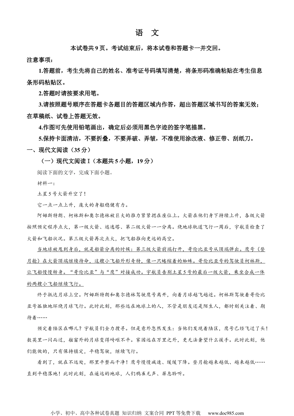 小学、初中、高中各种试卷真题知识归纳文案合同PPT等免费下载www.doc985.com语文本试卷共9页。考试结束后,将本试卷和答题卡一并交回。注意事项:1.答题前,考生先将自己的姓名、准考证号码填写清楚,将条形码准确粘贴在考生信息条形码粘贴区。2.答题时请按要求用笔。3.请按照题号顺序在答题卡各题目的答题区域内作答,超出答题区域书写的答案无效;在草稿纸、试卷上答题无效。4.作图可先使用铅笔画出,确定后必须用黑色字迹的签字笔描黑。5.保持卡面清洁,不要折叠,不要弄破、弄皱,不准使用涂改液、修正带、刮纸刀。一、现代文阅读(35分)(一)现代文阅读I(本题共5小题,19分)阅读下面的文字,完成下面小题。材料一:土星5号火箭升空了!它一点一点上升,庞大的身躯稳健有力。阿姆斯特朗、柯林斯和奥尔德林被巨大的推力紧紧摁在座位上。火箭在他们身下持续上升,各级火箭按照预定程序点火,第一级火箭、逃逸塔、第二级火箭一一分离。绕地球轨道飞行一周后,宇航员检查了火箭和飞船状况。第三级火箭再次点火,把飞船推向更远的高空。当地球被甩到身后,就是船箭分离的时候:第三级火箭前端打开,哥伦比亚号从顶端弹出。鹰号(登月舱)在火箭顶端继续待命,这艘小飞船外形奇特,像一只蜷缩着的蜘蛛。哥伦比亚号的驾驶员柯林斯,让飞船慢慢转身。“哥伦比亚”与“鹰”对接成功。宇航员告别土星5号的最后一级火箭,乘坐合成一体的两艘小飞船继续飞行。终于抵达月球上空。阿姆斯特朗和奥尔德林驾驶鹰号离开,向着月球越飞越近。柯林斯驾驶着哥伦比亚号孤独地环绕月球飞行。此时此刻,那些远在地球上的人,不管是朋友还是陌生人,都时刻关注着、期待着……预定着陆区在哪儿?宇航员们全力搜寻。但是意外忽然发生:当他们发现着陆区,鹰号已经飞过了头!数英里一闪而过,舷窗外的月球变得崎岖不平。家园远在万里之外,更无法奢望什么援手。此时此刻,他们能做的,只有保持镇定,平稳驾驶,继续飞行。看到了,就在不远处,那里平整而干净!鹰号慢慢减速、缓缓下降。登月舱越来越低、越来越低……直到平稳落地!此时此刻,在遥远的地球,人们鸦雀无声、屏息聆听。小学、初中、高中各种试卷真题知识归纳文案合同PPT等免费下载www.doc985.com一个声音从遥远的太空传来,那是阿姆斯特朗从月球发出的声音:“这里是静海基地,‘鹰’着陆成功。”他异常平静,地球上的人们却爆发出欢呼的声音。随后,阿姆斯特朗和奥尔德林沿着舷梯爬下登月舱。陌生、寂静、壮丽的月球从此有了生命。(摘编自布莱恩·弗洛卡《登月》,袁玮译)材料二:今年6月,联合国外层空间事务办公室举行会议,中国科学家介绍了“嫦娥四号”探月任务,表示将于2018年底前将中继卫星发射至月球背面上空一个引力稳定的位置,即地-月L2点,这颗中继卫星将执行为期三年的任务。新华社的报道没有透露“嫦娥四号”发射的具体时间,只是说将在2020年之前发射。自1976年苏联的“月球24号”抵达月球之后,中国的“嫦娥三号”首次于2013年在月球实现软着陆。它搭载的“玉兔一号”月球车共有6个轮子,在任务结束前共行驶了约114米。中国科学家在《科学》杂志上发表的研究结果显示,“玉兔一号”的探地雷达探测到其着陆点下方有9个明显不同的地下层,表明该地区有着复杂的地质史,这与“阿波罗号”宇航员探索地区的情况有所不同。根据今年6月在联合国会议上发布的信息,“嫦娥四号”任务的主要工程目标包括进行月球背面着陆和深空数据中继。中国方面已邀请国际社会围绕“嫦娥四号”探月任务建立合作关系。(摘译自斯蒂芬·克拉克《中国计划在2020年前登上月球背面》,2015年9月22日,英国“当今天文学”网)材料三:从古至今,人类举头望月,传颂动人神话,谱写优美诗篇,却很少有人意识到,亿万年来,月亮的“图案”从未变化。月球绕地球一圈的公转周期完全等于月球自转周期,所以人们只能看到它固定朝向地球的一面,我们把月球背向地球的一面称为“月背”。2019年1月11日,在北京航天飞行控制中心大厅里,科技人员见证了“嫦娥四号”和“玉兔二号”顺利完成“两器互拍”,这标志着“嫦娥四号”任务取得圆满成功,我国成为世界上首...