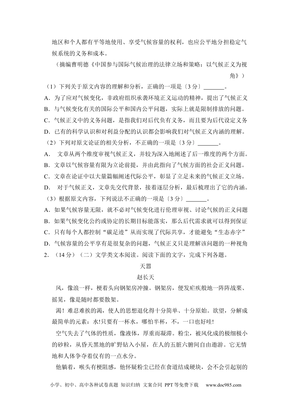 小学、初中、高中各种试卷真题知识归纳文案合同PPT等免费下载www.doc985.com2017年全国统一高考语文试卷(新课标Ⅰ)一、现代文阅读(35分)1.(9分)(一)论述类文本阅读。阅读下面的文字,完成下列各题。气候正义是环境主义在气候变化领域的具体发展和体现。2000年前后,一些非政府组织承袭环境正义运动的精神。开始对气候变化的影响进行伦理审视,气候正义便应运而生。气候正义关注的核心主要是在气候容量有限的前提下,如何界定各方的权利和义务,主要表现为一种社会正义或法律正义。从空间维度来看,气候正义涉及不同国家和地区之间公平享有气候容量的问题,也涉及一国内部不同区域之间公平享有气候容量的问题,因而存在气候变化的国际公平和国内公平问题。公平原则应以满足人的基本需求作为首要目标,每个人都有义务将自己的“碳足迹”控制在合理范围之内。比如说,鉴于全球排放空间有限,而发达国家已实现工业化,在分配排放空间时,就应首先满足发展中国家在衣食住行和公共基础设施建设等方面的基本发展需求,同时遏制在满足基本需求之上的奢侈排放。从时间维度来看,气候正义涉及当代人与后代之间公平享有气候容量的问题因而存在代际权利义务关系问题。这一权利义务关系,从消极方面看,体现为当代人如何约束自己的行为来保护地球气候系统,以将同等质量的气候系统交给后代;从积极方面看,体现为当代人为自己及后代设定义务。就代际公平而言,地球上的自然资源在代际分配问题上应实现代际共享,避免“生态赤字”。因为,地球这个行星上的自然资源包括气候资源,是人类所有成员,包括上一代、这一代和下一代,共同享有和掌管的。我们这一代既是受益人,有权使用并受益于地球,又是受托人,为下一代掌管地球。我们作为地球的受托管理人,对子孙后代负有道德义务。实际上,气候变化公约或协定把长期目标设定为保护气候系统免受人为原因引起的温室气体排放导致的干扰,其目的正是为了保护地球气候系统,这是符合后代利益的。至少从我们当代人已有的科学认识来看,气候正义的本质是为了保护后代的利益,而非为其设定义务。总之,气候正义既有空间的维度,也有时间的维度,既涉及国际公平和国内公平,也设计代际公平和代内公平。因此,气候正义的内涵是:所有国家、小学、初中、高中各种试卷真题知识归纳文案合同PPT等免费下载www.doc985.com地区和个人都有平等地使用、享受气候容量的权利,也应公平地分担稳定气候系统的义务和成本。(摘编曹明德《中国参与国际气候治理的法律立场和策略:以气候正义为视角》)(1)下列关于原文内容的理解和分析,正确的一项是〔3分〕。A.为了应对气候变化,非政府组织承袭环境正义运动的精神,提出了气候正义B.与气候变化有关的国际公平和国内公平问题,实际上就是限制排放的问题。C.气候正义中的义务问题,是指我们对后代负有义务,而且要为后代设定义务D.已有的科学认识和对利益分配的认识都会影响我们对气候正义内涵的理解。(2)下列对原文论证的相关分析,不正确的一项是〔3分〕。A.文章从两个维度审视气候正义,并较为深入地阐述了后一维度的两个方面。B.文章以气候容量有限为立论前提,并由此指向了气候方面的社会正义问题。C.文章在论证中以大量篇幅阐述代际公平,彰显了立足未来的气候正义立场。D.对于气候正义,文章先交代背景,接着逐层分析,最后梳理出了它的内涵。(3)根据原文内容,下列说法不正确的一项是〔3分〕。A.如果气候容量无限,就不必对气候变化进行伦理审视、讨论气候的正义问题B.如果气候变化公约或协定的长期目标能落实,那么后代需求就可以得到保证C.只有每个人都控制“碳足迹”从而实现了代际共享,才能避免“生态赤字”D.气候容量的公平享有是很复杂的问题,气候正义只是理解该问题的一种视角2.(14分)(二)文学类文本阅读。阅读下面的文字,完成下列各题。天嚣赵长天风,像浪一样,梗着头向钢架房冲撞。钢架房,便发疟疾般地一阵阵战栗、摇晃,像是随时都要散架。渴!难忍难挨的渴,使人的思想退化得十分简单、十分原始。欲望,分解成最简单的元素:水!只要有一杯水,哪怕半杯,不,一口也...