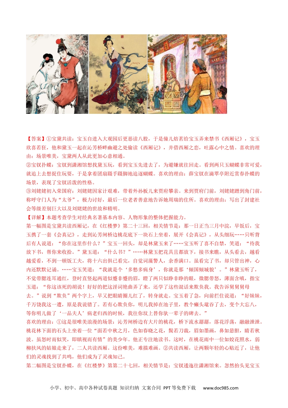 小学、初中、高中各种试卷真题知识归纳文案合同PPT等免费下载www.doc985.com五年(2019-2023)年高考真题分项汇编专题11名著阅读〖2023年高考真题〗〖2022年高考真题〗(2022年北京卷)15.根据要求,回答问题。《红楼梦》甲戌本第一回开头,作者自道书名说:(空空道人)因空见色,由色生情,传情入色,自色悟空,遂易名为情僧,改《石头记》为《情僧录》。至吴玉峰题曰《红楼梦》。东鲁孔梅溪则题曰《风月宝鉴》。后因曹雪芹于悼红轩中披阅十载,增删五次,纂成目录,分出章回,则题曰《金陵十二钗》,并题一绝云:“满纸荒唐言,一把辛酸泪。都云作者痴,谁解其中味。”(1)除了《红楼梦》外,这里还提到了小说另外四个书名。请从中任选三个,解释这些书名和作品内容有何关联。(2)小说第五回中,贾宝玉神游太虚幻境时听到的仙乐套曲就叫《红楼梦》。今天的通行本也多以《红楼梦》为书名。结合作品内容,谈谈《红楼梦》作为书名的合理性。【答案】(1)答案示例:以《石头记》为名,是因为全书写了石头记录的自己红尘历劫的故事。以《情僧录》为名,是由于书中人物因情而参透世相,有助人解脱苦恼之意。以《风月宝鉴》为名,因其是小说中出现的道具,有规劝人去淫向善之意。以《金陵十二钗》为名,因“十二钗”是小说主要人物,凸显“为闺阁立传”之意。(2)答案要点:①“红楼”既可以象征富贵官宦之家,又可以象征闺阁。②“梦”象征了作家人生如梦的幻灭感。③书名中的温柔富贵与梦幻泡影,是对全书贵族家庭之衰亡与红颜薄命之悲剧的整体概括。【详解】(1)本题考查学生把握经典名著基本内容、情节的能力。题目要求分析《石头记》《情僧录》《风月宝鉴》《金陵十二钗》这些书名与作品内容的关联。《石头记》:这部小说在前几个章回里详细叙述了此书由来,有一块被女娲补天弃而未用的石头,搁置在青埂峰下。它因修炼之后已有灵性,能口吐人言,后又遇见一僧一道,求他们带它去红尘中经历了一番。红尘梦尽,这块石头回到青埂峰,石身记满它下凡经历后的种种事情。空空道人将这石头上记述的故事抄了下来,因此才有了这部小说。可见以《石头记》为名,是因为全书写了石头记录的自己红尘历劫的故事。《情僧录》:红楼梦开篇空空道人说“因空见色,由色生情,传情如色,自色入空”,遂易名为《情僧录》。贾宝玉本是最多情、博情之人,但在经历了一系列家庭变故,以及黛玉香消玉殒之后,他看透了世小学、初中、高中各种试卷真题知识归纳文案合同PPT等免费下载www.doc985.com间种种,最后出家做了和尚。以《情僧录》为名,是由于书中人物因情而参透世相,有助人解脱苦恼之意。《风月宝鉴》:风月宝鉴,是古典名著《红楼梦》中的一面镜子,出自第十二回:王熙凤毒设相思局,贾天祥正照风月鉴。再看看这风月宝鉴的出处,据红楼梦第十二回:“这物出自太虚幻境空灵殿上,警幻仙子所制,专治邪思妄动之症,有济世保生之功。所以带他到世上,单与那些聪明杰俊,风雅王孙等看照。千万不可照正面,只照他的背面,要紧,要紧!”,跛足道人这前半句话告诉了我们风月宝鉴的出处、制作者、功效,而后半句告诉我们他带风月宝鉴下凡的意义和禁忌,其实这段话另有深意。风月宝鉴的“正面”指男女情爱,“背面”告诫我们不要太过痴迷。可见以《风月宝鉴》为名,因其是小说中出现的道具,有规劝人去淫向善之意。《金陵十二钗》:金陵十二钗是中国古典小说《红楼梦》正册中的十二位女子,分别是:林黛玉、薛宝钗、贾元春、贾探春、史湘云、妙玉、贾迎春、贾惜春、王熙凤、贾巧姐、李纨、秦可卿。这十二个女子是小说的主要人物,且《红楼梦》一篇故事,按作者自己说来,是为了替闺阁立传,作者同情闺阁女儿的薄命,感慨“千红一哭、万艳同悲”,也赞同闺阁女儿的“风流”、“忠义”、“巾帼不让须眉”。可见以《金陵十二钗》为名,因“十二钗”是小说主要人物,凸显“为闺阁立传”之意。(2)本题考查学生对经典名著内容的把握能力。分析《红楼梦》书名的合理性,需要将书名与书中内容关联。首先解释“红楼”的含义。“红”在古代代表“女儿”,即女性;“楼”是深闺大宅;“红楼”是指住在深闺大宅中的女...